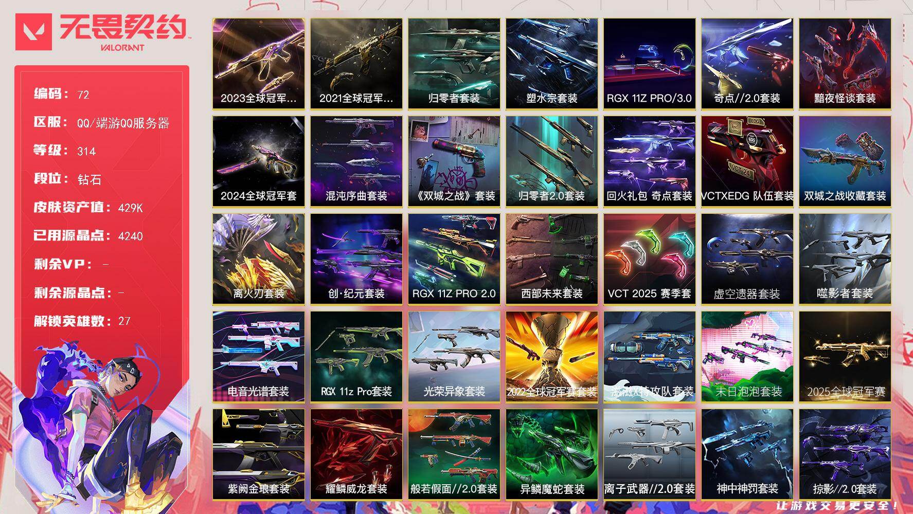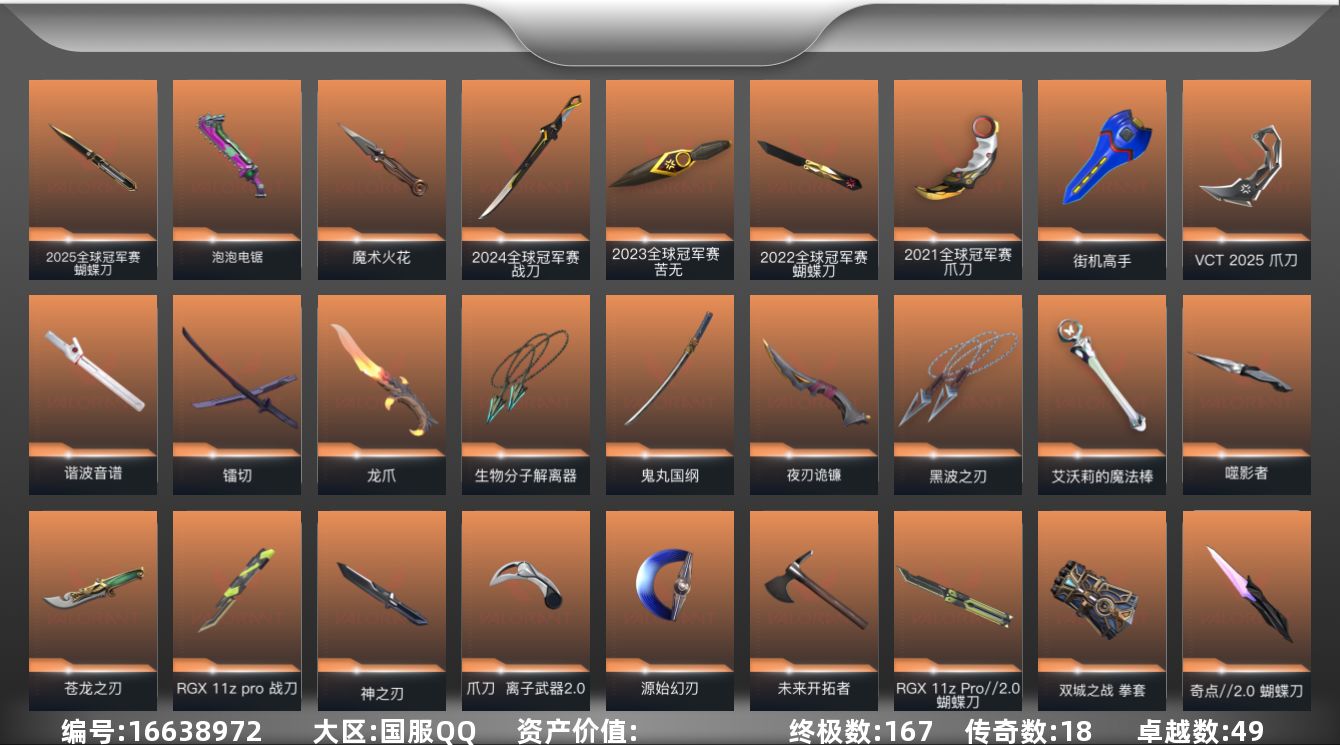 [16638972]【72】【套装】:2025全球冠军赛套装,2024全球冠军赛套装,2023全球冠军赛套装,2022全球冠军赛套装,2021全球冠军赛套装,超时空卫队套装,源能者娱乐系统套装,上古龙炎套装,艾沃莉的梦之翼套装,末日泡泡套装,滋滋X特攻队套装,光荣异象套装,RGX 11z Pro套装,电音光谱套装,噬影者套装,虚空遗器套装,VCT 2025 赛季套装,西部未来套装,RGX 11z Pro//2.0套装,创·纪元套装,RGX 11z Pro//3.0套装,混沌序曲套装,塑水宗套装,离火刃套装,《英雄联盟:双城之战》套装,《双城之战》收藏套装,归零者//2.0套装,奇点//2.0套装,归零者套装,黯夜怪谈套装,VCTxEDG 队伍套装,回火礼包:奇点套装,般若假面//2.0套装,异鳞魔蛇套装,耀鳞威龙套装,紫阙金琅套装,离子武器//2.0套装,神中神罚套装,掠影//2.0套装,无畏启程套装,彩虹魔力小白马套装,离火刃套装 【英雄】:幻棱,炼狱,维斯,暮蝶,钛狐,壹决,铁臂,捷风,雷兹,幽影,不死鸟,贤者,猎枭,蝰蛇,零,芮娜,奇乐,尚勃勒,霓虹,斯凯,夜露,星礈,K/O,海神,盖可,黑梦,钢锁 【近战 武器】:近战武器-2025全球冠军赛 蝴蝶刀,近战武器-2024全球冠军赛 战刀,近战武器-2023全球冠军赛 苦无,近战武器-2022全球冠军赛 蝴蝶刀,近战武器-2021全球冠军赛 爪刀,近战武器-泡泡电锯,近战武器-魔术火花,近战武器-嘟昂嘟昂超弹力水球拳套,近战武器-影钩,近战武器-超时空卫队 三棱军刺,近战武器-无畏契约GO!第三卷 匕首,近战武器-5周年//公测重制版 苍龙之刃,近战武器-光荣异象 歧途,近战武器-RGX 11z Pro 战刀,近战武器-谐波音谱,近战武器-神之刃,近战武器-穿花蝴蝶,近战武器-RGX 11z Pro//2.0 蝴蝶刀,近战武器-剥皮小刀,近战武器-奇点//2.0 蝴蝶刀,近战武器-VCT 2025 爪刀,近战武器-紫金爪刀,近战武器-RGX 11z Pro//3.0 爪刀,近战武器-离火刃,近战武器-黑波之刃,近战武器-落英飞旋,近战武器-噬影者 簇刃,近战武器-镭切,近战武器-艾沃莉的魔法棒,近战武器-威龙之刃,近战武器-鬼丸国纲,近战武器-离子武器//2.0 爪刀,近战武器-荒狼之颚 蛮勇战斧,近战武器-双生獠牙,近战武器-