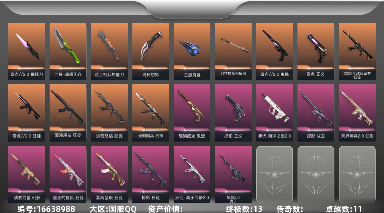 [16638988]【62】【套装】:奇点//2.0套装 【英雄】:幻棱,炼狱,维斯,暮蝶,钛狐,壹决,铁臂,捷风,雷兹,幽影,不死鸟,贤者,猎枭,蝰蛇,零,芮娜,奇乐,尚勃勒,霓虹,斯凯,夜露,星礈,K/O,海神,盖可,黑梦,钢锁 【近战 武器】:近战武器-奇点//2.0 蝴蝶刀,近战武器-超限闪存 匕首,近战武器-荒土机兵 热能刀,近战武器-诡秘蛇影 军刀,近战武器-日耀风暴 遗器,近战武器-阿特拉斯指挥部 甩棍 【狂徒】:狂徒-2025全球冠军赛,狂徒-洪荒怒焰,狂徒-混沌序曲,狂徒-奇点//2.0,狂徒-掠影,狂徒-盖亚的复仇,狂徒-紫阙金琅,狂徒-离子武器//2.0,狂徒-荒土机兵,狂徒-诡秘蛇影,狂徒-彩虹魔力小白马 【幻影】:幻影-天界神兵//2.0,幻影-侦察力量,幻影-超限闪存,幻影-琉璃幻梦,幻影-纳米打击,幻影-末日之翼 【戍卫】:戍卫-掠影,戍卫-浮光跃金,戍卫-逆冲蛮牛,戍卫-折光棱晶 【獠犬】:獠犬-海洋之星//2.0,獠犬-模拟赫兹,獠犬-逆冲蛮牛 【冥驹】:冥驹-荒土机兵,冥驹-模拟赫兹 【飞将】:飞将-末日之翼 【莽侠】:莽侠-超限闪存,莽侠-诡秘蛇影 【战神】:战神-光明哨兵,战神-浮光跃金 【奥丁】:奥丁-掠影//2.0,奥丁-纳米打击,奥丁-末日之翼 【判官】:判官-诡秘蛇影,判官-纳米打击x 【雄鹿】:雄鹿-模拟赫兹,雄鹿-逆冲蛮牛 【骇灵】:骇灵-荒土机兵,骇灵-彩虹魔力小白马,骇灵-浮光跃金 【蜂刺】:蜂刺-超限闪存,蜂刺-折光棱晶 【标配】:标配-荒土机兵,标配-浮光跃金,标配-琉璃幻梦,标配-折光棱晶 【正义】:正义-奇点,正义-掠影,正义-超限闪存,正义-纳米打击 【鬼魅】:鬼魅-奇点//2.0,鬼魅-耀鳞威龙,鬼魅-诡秘蛇影,鬼魅-模拟赫兹,鬼魅-星云暗涌 【狂怒】:狂怒-逆冲蛮牛 【短炮】:短炮-末日之翼 【卡面】:终章:激斗汉堡 卡面,进入射程 卡面,分崩离析 卡面,纳米打击 卡面,抑制技术 卡面,激斗汉堡 卡面,瓦娃脸雪糕 P2 卡面,从黄昏到黎明 卡面,荒土机兵 卡面,银弹猎手 卡面,逆冲蛮牛 卡面,《双城之战》拥抱 卡面,精灵大战 卡面,欢迎来到底城 卡面,南瓜盛典 卡面,唱片的故事 卡面,钢弓与箭弦 卡面,排除故障 卡面,奇点//2.0 卡面,战术桌游 卡面,悠享食光 卡面,修车达人 卡面,模拟赫兹 卡面,浮光跃金 卡