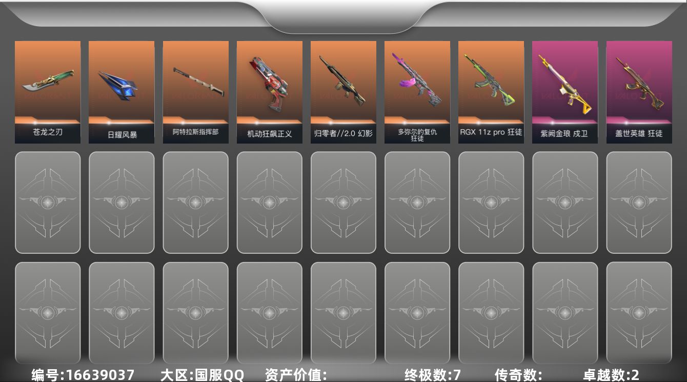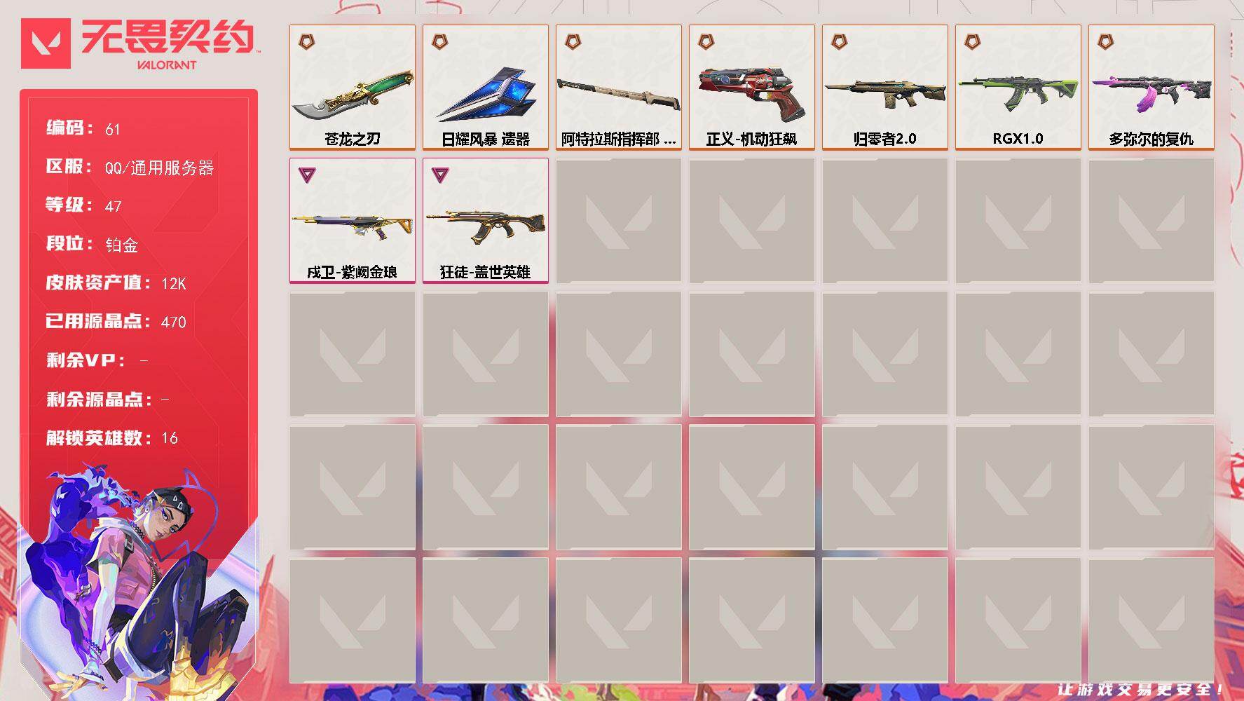 [16639037]【61】【英雄】:炼狱,维斯,暮蝶,壹决,捷风,雷兹,幽影,不死鸟,贤者,猎枭,蝰蛇,芮娜,夜露,星礈,盖可 【近战 武器】:近战武器-5周年//公测重制版 苍龙之刃,近战武器-日耀风暴 遗器,近战武器-阿特拉斯指挥部 甩棍 【狂徒】:狂徒-RGX 11z Pro,狂徒-多弥尔的复仇,狂徒-盖世英雄 【幻影】:幻影-归零者//2.0 【戍卫】:戍卫-紫阙金琅 【正义】:正义-机动狂飙 【卡面】:无畏契约GO!第一卷:芮娜 卡面,无畏契约GO!第一卷:零 卡面,《双城之战》金克丝 卡面,暗枪 卡面,代号红色 卡面,新兵报到 卡面,V契约 卡面,无畏契约 卡面 【喷漆】:买装还是存钱 喷漆,暴走萝莉 喷漆,胜利属于无畏契约 喷漆,GLHF 喷漆,无畏契约 喷漆 【挂饰】:鱼骨头 挂饰,薰衣草之心 挂饰,天外飞客 挂饰,红鳞松叶 挂饰,海豹的认可 挂饰,无畏契约 纪念币 挂饰