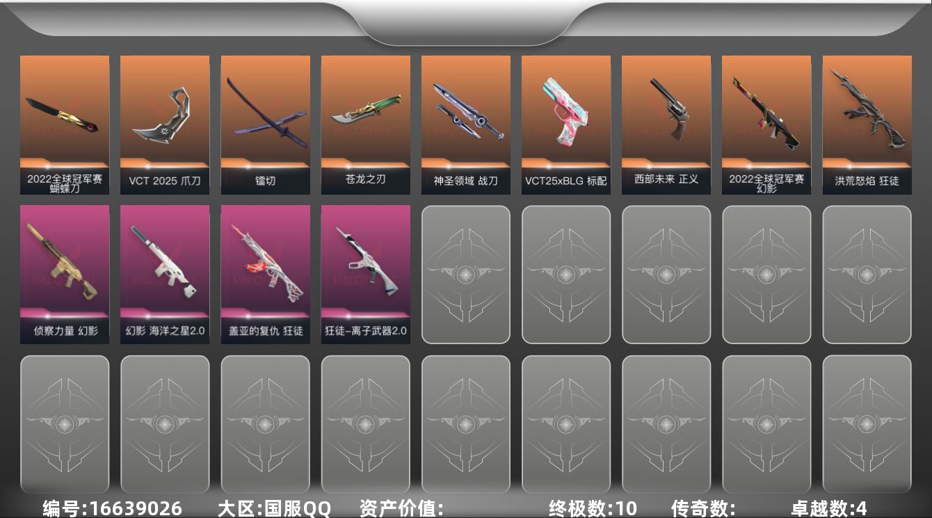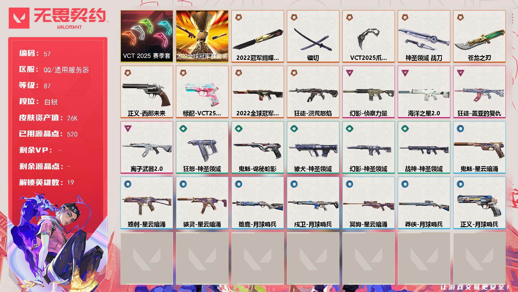 [16639026]【57】【套装】:2022全球冠军赛套装,VCT 2025 赛季套装 【英雄】:幻棱,炼狱,维斯,暮蝶,钛狐,壹决,铁臂,捷风,雷兹,幽影,不死鸟,贤者,猎枭,零,芮娜,奇乐,霓虹,斯凯,黑梦 【近战 武器】:近战武器-2022全球冠军赛 蝴蝶刀,近战武器-5周年//公测重制版 苍龙之刃,近战武器-VCT 2025 爪刀,近战武器-镭切,近战武器-神圣领域 战刀 【狂徒】:狂徒-洪荒怒焰,狂徒-盖亚的复仇,狂徒-离子武器//2.0 【幻影】:幻影-2022全球冠军赛,幻影-侦察力量,幻影-海洋之星//2.0,幻影-神圣领域 【戍卫】:戍卫-月球哨兵 【獠犬】:獠犬-神圣领域 【冥驹】:冥驹-星云暗涌 【莽侠】:莽侠-月球哨兵 【战神】:战神-神圣领域 【雄鹿】:雄鹿-月球哨兵 【骇灵】:骇灵-星云暗涌 【蜂刺】:蜂刺-星云暗涌 【VCT手枪】:标配-VCT25 x BLG 【正义】:正义-西部未来,正义-月球哨兵 【鬼魅】:鬼魅-诡秘蛇影,鬼魅-星云暗涌 【狂怒】:狂怒-神圣领域 【卡面】:南瓜盛典 卡面,树懒大作战 卡面,钢锁工牌 卡面,无畏契约GO!第一卷:芮娜 卡面,无畏契约GO!第一卷:零 卡面,无垠星环 卡面,《双城之战》金克丝 卡面,无畏契约GO!第一卷:贤者 卡面,别冒尖 卡面,天台狂欢 卡面,代号红色 卡面,新兵报到 卡面,V契约 卡面,无畏契约 卡面 【喷漆】:小丑猫 喷漆,买装还是存钱 喷漆,放下武器 喷漆,胜利属于无畏契约 喷漆,GLHF 喷漆,无畏契约 喷漆 【挂饰】:第九季//第三幕 纪念币 挂饰,动力机箱 挂饰,传世莲华 挂饰,天外飞客 挂饰,《双城之战》魄罗 挂饰,无畏契约 纪念币 挂饰