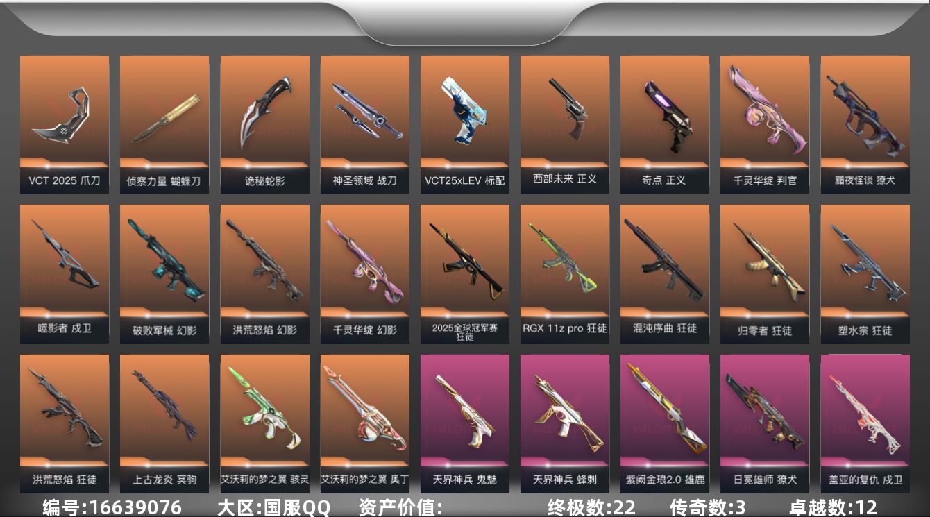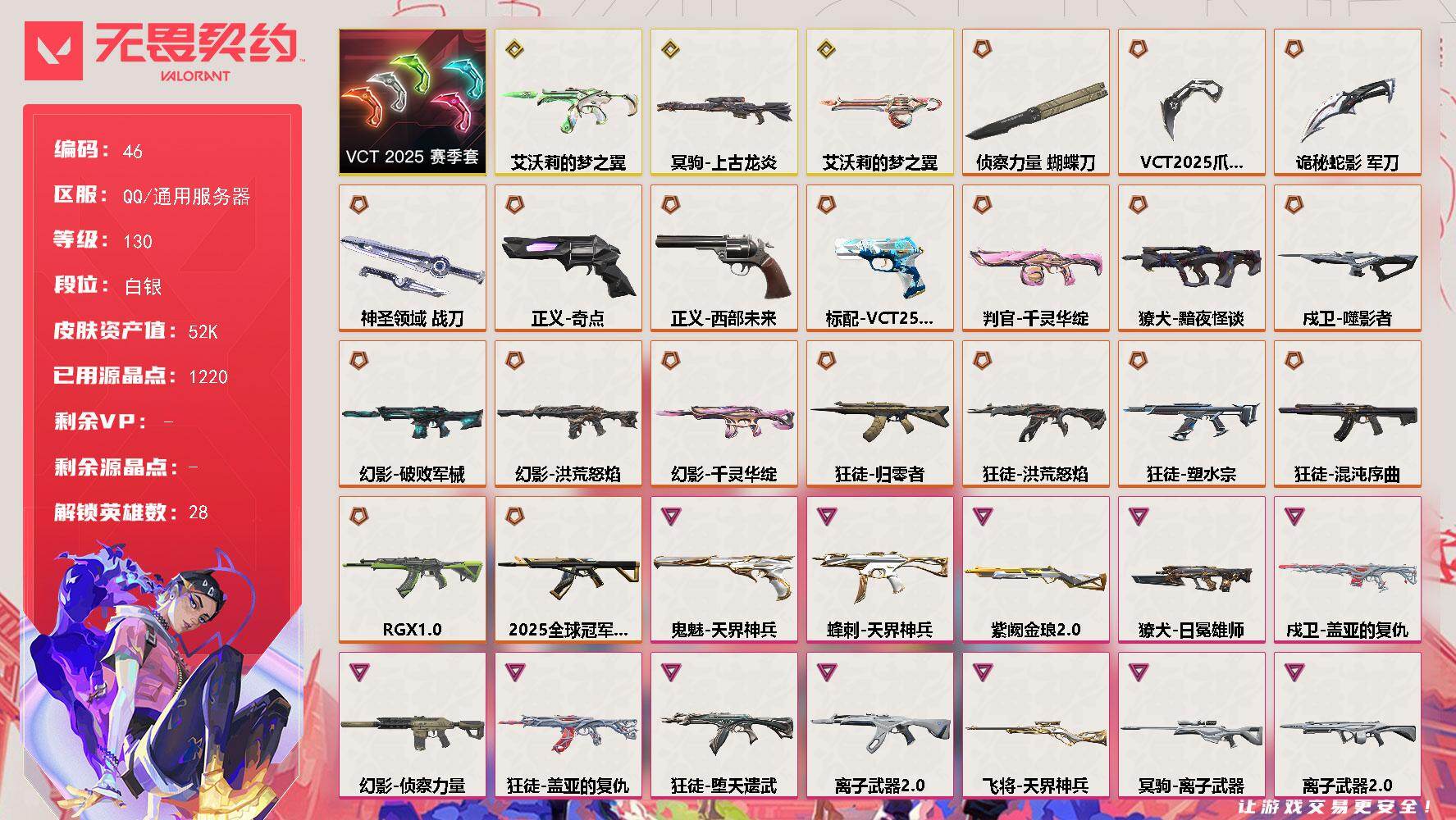 [16639076]【46】【套装】:VCT 2025 赛季套装 【英雄】:幻棱,炼狱,维斯,暮蝶,钛狐,壹决,铁臂,捷风,雷兹,幽影,不死鸟,贤者,猎枭,蝰蛇,零,芮娜,奇乐,尚勃勒,霓虹,斯凯,夜露,星礈,K/O,海神,盖可,黑梦,钢锁 【近战 武器】:近战武器-侦察力量 蝴蝶刀,近战武器-VCT 2025 爪刀,近战武器-诡秘蛇影 军刀,近战武器-神圣领域 战刀 【狂徒】:狂徒-2025全球冠军赛,狂徒-归零者,狂徒-洪荒怒焰,狂徒-混沌序曲,狂徒-塑水宗,狂徒-RGX 11z Pro,狂徒-堕天遗武,狂徒-盖亚的复仇,狂徒-离子武器//2.0,狂徒-荒土机兵,狂徒-金纹世家,狂徒-诡秘蛇影 【幻影】:幻影-洪荒怒焰,幻影-破败军械,幻影-千灵华绽,幻影-侦察力量,幻影-神圣领域,幻影-末日之翼 【戍卫】:戍卫-噬影者,戍卫-盖亚的复仇,戍卫-逆冲蛮牛,戍卫-月球哨兵,戍卫-折光棱晶 【獠犬】:獠犬-黯夜怪谈,獠犬-日冕雄师,獠犬-神圣领域,獠犬-逆冲蛮牛 【冥驹】:冥驹-上古龙炎,冥驹-离子武器,冥驹-荒土机兵,冥驹-星云暗涌 【飞将】:飞将-天界神兵,飞将-末日之翼 【莽侠】:莽侠-诡秘蛇影,莽侠-月球哨兵 【战神】:战神-离子武器//2.0,战神-神圣领域 【奥丁】:奥丁-艾沃莉的梦之翼,奥丁-纳米打击,奥丁-末日之翼 【判官】:判官-千灵华绽,判官-诡秘蛇影,判官-纳米打击x 【雄鹿】:雄鹿-紫阙金琅//2.0,雄鹿-逆冲蛮牛,雄鹿-月球哨兵 【骇灵】:骇灵-艾沃莉的梦之翼,骇灵-荒土机兵,骇灵-星云暗涌 【蜂刺】:蜂刺-天界神兵,蜂刺-星云暗涌,蜂刺-折光棱晶 【标配】:标配-荒土机兵,标配-折光棱晶 【VCT手枪】:标配-VCT25 x LEV 【正义】:正义-奇点,正义-西部未来,正义-月球哨兵 【鬼魅】:鬼魅-天界神兵,鬼魅-诡秘蛇影,鬼魅-星云暗涌 【狂怒】:狂怒-神圣领域,狂怒-逆冲蛮牛 【短炮】:短炮-末日之翼 【卡面】:纳米打击 卡面,抑制技术 卡面,激斗汉堡 卡面,瓦娃脸雪糕 P2 卡面,荒土机兵 卡面,银弹猎手 卡面,逆冲蛮牛 卡面,精灵大战 卡面,南瓜盛典 卡面,梦幻奶茶 卡面,无畏契约GO!第一卷:零 卡面,代号红色 卡面,新兵报到 卡面,V契约 卡面,无畏契约 卡面 【喷漆】:请求重启 喷漆,逆冲蛮牛 喷漆,纳米打击 喷漆,鼻尖上的蝴蝶 喷漆,