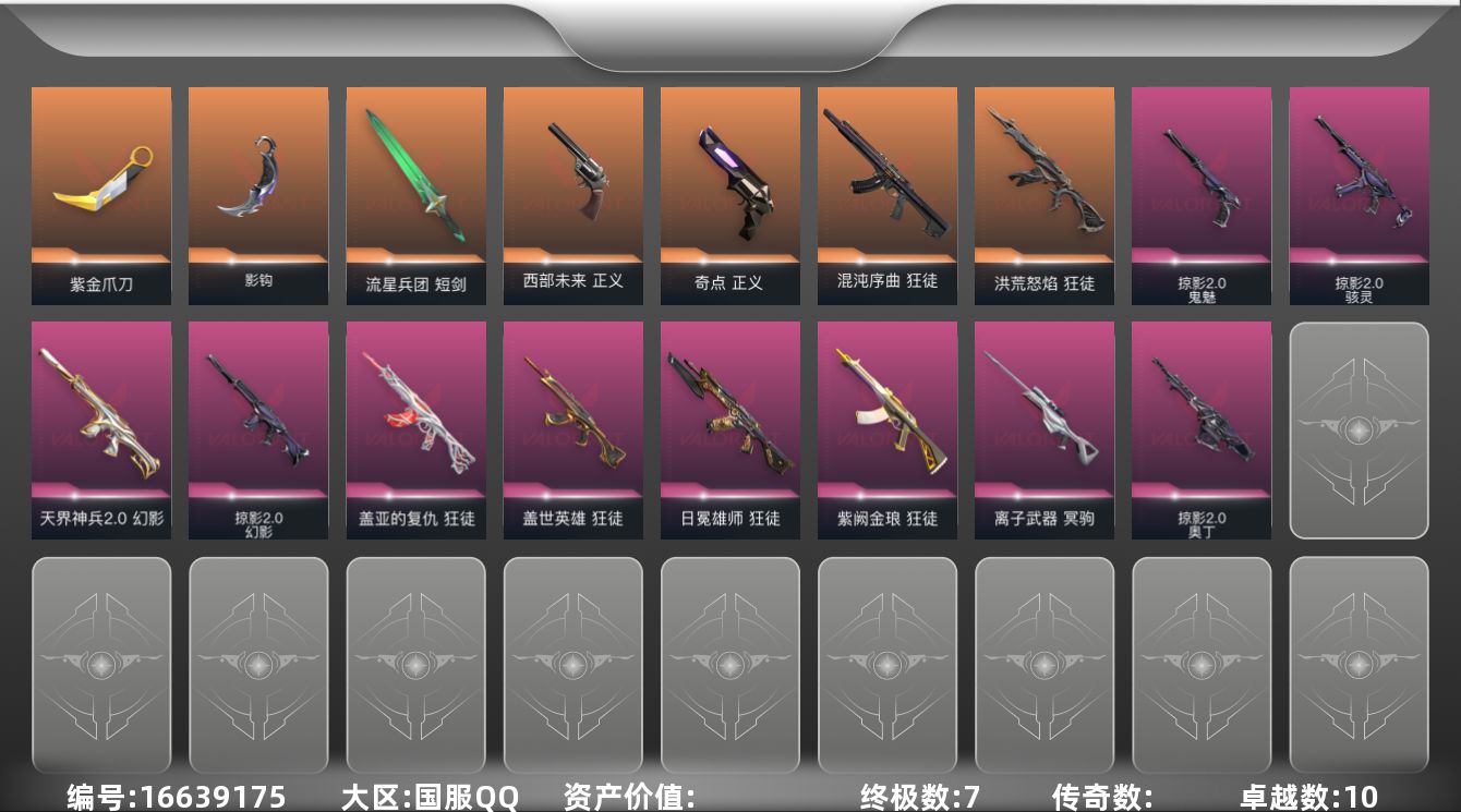 - [16461030]山东一区-73V-6王者武器数-0炫金武器数 【传说武器】:传说灵眸,传说幽冥 【热门武器】:传说灵眸,传说幽冥,Scar Light-白虎,金色蔷薇-古蛇迷踪,修罗-古蛇迷踪,M200-竞技荣光,死亡之眼,Kar98K-星神,汤姆逊-烈龙*6,沙鹰-修罗*3 【王者炫金武器】:王者玉锋 【音效卡】:M4A1-雷神音效卡,Scar Light-白虎音效卡,Kar98K-星神音效卡 【皮肤】:白虎-大汉风骨,白虎-白鲨-CFPLS23冠军,裁决-流光秘银,裁决-巅峰荣耀 皮肤,星神-枪娘默 皮肤,星神-破竹皮肤,雷神-R.LGD-CFPLS18冠军,雷神-源计划2.0专属 皮肤,雷神-化蛇 皮肤,火麒麟-巅峰荣耀,毁灭-风暴,毁灭-英雄计划 皮肤,麒麟刺-甜蜜糖果 皮肤 【角色】:战地猎狐,王者潘多拉,蛇隐宗,暗夜-X,北极狐-X,电竞少女,飞虎队-X,风暴女,娟娟,潘多拉-X,潘多拉-甜心教官,蛇姬,斯沃特-X,铁骑荣耀,兔囡囡,新娜塔莎,雪莉杨,游珑儿 【人偶武器】:天龙-乔伊教练,迷你牛牛,生化手雷-机甲核心 【暴走生化】:死亡之眼,超级对讲机 【挑战大师】:冰龙粉碎者-白马银枪,神圣爆裂者-末日III 【英雄级武器】:AK47-火麒麟,M4A1-雷神*2,AK12-天启,Scar Light-白虎,M4A1-幻灵,无影-神兵利器,QBZ03-云龙,黑武士-锦绣游龙,金色蔷薇-古蛇迷踪,超新星-悦享-觉醒版,王者之城-觉醒版,王者芳薇-觉醒版,Barrett-毁灭,AWM-裁决,Kar98K-星神,M200-竞技荣光,汤姆逊-烈龙*6,沙鹰-修罗*3,沙鹰-天神*2,柯尔特-竞技荣光,COP 357-云龙,修罗-古蛇迷踪,屠龙,龙啸,麒麟刺*2,擎天-云海游龙,高爆手雷-幻灵*2,高爆手雷-竞技荣光*5,手雷-动感闪耀,高爆手雷-云龙,高爆手雷-古蛇迷踪,闪光弹-幻灵,闪光弹-竞技荣光*3,闪光弹-云龙*4,烟雾弹-幻灵*2,烟雾弹-竞技荣光*4,烟雾弹-古蛇迷踪,M4A1-赤狱骑士 【道具】:CFS限定背包,云山科技背包,古蛇迷踪炫彩背包,虎牙炫彩背包,超级背包,女皇终结者-魔龙之吻,救世主-黑桃战神,绿色巨人,灵魂忍者*2,变异宝贝,迷雾幽灵,夺命之镰,防化服*3,金色流光-枪王排位*2,星辰流光-枪王排位,流光-再燃火线,枪王排位28赛季金色流光,枪王排