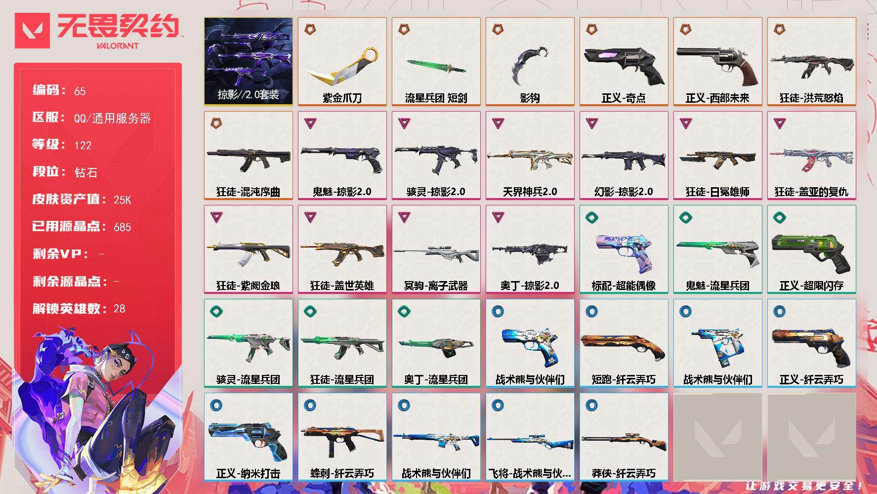 [16639175]【65】【套装】:掠影//2.0套装 【英雄】:幻棱,炼狱,维斯,暮蝶,钛狐,壹决,铁臂,捷风,雷兹,幽影,不死鸟,贤者,猎枭,蝰蛇,零,芮娜,奇乐,尚勃勒,霓虹,斯凯,夜露,星礈,K/O,海神,盖可,黑梦,钢锁 【近战 武器】:近战武器-影钩,近战武器-紫金爪刀,近战武器-流星兵团 短剑 【狂徒】:狂徒-洪荒怒焰,狂徒-混沌序曲,狂徒-盖世英雄,狂徒-盖亚的复仇,狂徒-日冕雄师,狂徒-紫阙金琅,狂徒-流星兵团 【幻影】:幻影-天界神兵//2.0,幻影-掠影//2.0 【戍卫】:戍卫-战术熊与伙伴们 【冥驹】:冥驹-离子武器 【飞将】:飞将-战术熊与伙伴们 【莽侠】:莽侠-纤云弄巧 【奥丁】:奥丁-掠影//2.0,奥丁-流星兵团 【骇灵】:骇灵-掠影//2.0,骇灵-流星兵团 【蜂刺】:蜂刺-纤云弄巧 【标配】:标配-超能偶像,标配-战术熊与伙伴们 【正义】:正义-奇点,正义-西部未来,正义-超限闪存,正义-纳米打击,正义-纤云弄巧 【鬼魅】:鬼魅-掠影//2.0,鬼魅-流星兵团 【狂怒】:狂怒-战术熊与伙伴们 【短炮】:短炮-纤云弄巧 【卡面】:终章:激斗汉堡 卡面,进入射程 卡面,《双城之战》拥抱 卡面,精灵大战 卡面,欢迎来到底城 卡面,南瓜盛典 卡面,修车达人 卡面,正义的化身 卡面,终章:生意人麦宝 卡面,铁之华 卡面,时间到 卡面,最高舞台 卡面,声感陷阱设计图 卡面,梦幻奶茶 卡面,终章:打造专属狂徒 卡面,趁热吃 卡面,西装暴徒 卡面,失控边缘 卡面,哨卫者之领域 卡面,暮蝶工牌 卡面,战术熊与伙伴们 卡面,源能反应 卡面,流星兵团 卡面,纤云弄巧 卡面,暂别喧嚣 卡面,打造专属狂徒 卡面,零点嗅探设计图 卡面,源能者美容 卡面,沙雕爆能器 卡面,清除名单 卡面,无垠星环 卡面,《双城之战》金克丝 卡面,暗枪 卡面,代号红色 卡面,新兵报到 卡面,V契约 卡面,无畏契约 卡面 【喷漆】:嗨宝南瓜灯 喷漆,嘭! 喷漆,都算到了 喷漆,控场勿近 喷漆,小丑猫 喷漆,熊抱 喷漆,超级粉丝 喷漆,捷风差距 喷漆,惊声尖叫 喷漆,拼一枪 喷漆,加油!加油! 喷漆,开心到爆炸 喷漆,皮蛋萌舞 喷漆,我觉得不行 喷漆,头号粉丝 喷漆,吸一口快乐 喷漆,永远的答案 喷漆,再来一次? 喷漆,别挡我的路! 喷漆,我的刀呢? 喷漆,当然可以 喷漆,流星兵团 喷漆,战术熊