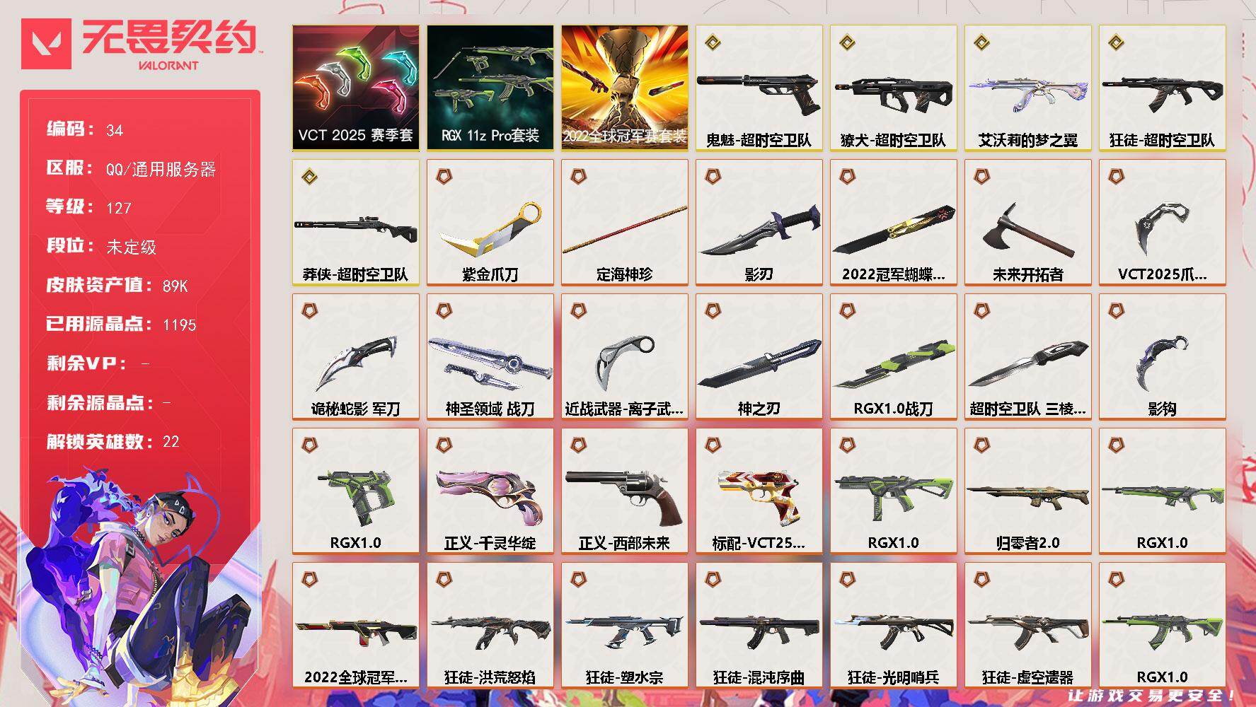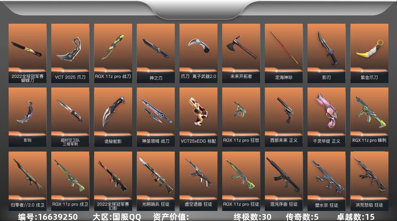 [16639250]【34】【套装】:2022全球冠军赛套装,超时空卫队套装,RGX 11z Pro套装,VCT 2025 赛季套装 【英雄】:幻棱,炼狱,维斯,暮蝶,壹决,铁臂,捷风,雷兹,不死鸟,贤者,猎枭,蝰蛇,零,芮娜,奇乐,尚勃勒,霓虹,斯凯,夜露,K/O,盖可,钢锁 【近战 武器】:近战武器-2022全球冠军赛 蝴蝶刀,近战武器-影钩,近战武器-超时空卫队 三棱军刺,近战武器-RGX 11z Pro 战刀,近战武器-神之刃,近战武器-VCT 2025 爪刀,近战武器-紫金爪刀,近战武器-离子武器//2.0 爪刀,近战武器-未来开拓者,近战武器-定海神珍,近战武器-影刃,近战武器-诡秘蛇影 军刀,近战武器-神圣领域 战刀 【狂徒】:狂徒-艾沃莉的梦之翼,狂徒-超时空卫队,狂徒-光明哨兵,狂徒-洪荒怒焰,狂徒-混沌序曲,狂徒-塑水宗,狂徒-虚空遗器,狂徒-RGX 11z Pro,狂徒-堕天遗武,狂徒-日冕雄师,狂徒-咒缚双界,狂徒-紫阙金琅,狂徒-泰坦兵器,狂徒-诡秘蛇影 【幻影】:幻影-2022全球冠军赛,幻影-侦察力量,幻影-异鳞魔蛇,幻影-神圣领域,幻影-末日之翼 【戍卫】:戍卫-归零者//2.0,戍卫-RGX 11z Pro,戍卫-天界神兵,戍卫-咒缚双界,戍卫-月球哨兵,戍卫-折光棱晶 【獠犬】:獠犬-超时空卫队,獠犬-神圣领域 【冥驹】:冥驹-混沌序曲,冥驹-起源,冥驹-星云暗涌 【飞将】:飞将-天界神兵,飞将-末日之翼 【莽侠】:莽侠-超时空卫队,莽侠-诡秘蛇影,莽侠-月球哨兵 【战神】:战神-神圣领域 【奥丁】:奥丁-末日之翼 【判官】:判官-诡秘蛇影 【雄鹿】:雄鹿-起源,雄鹿-月球哨兵 【骇灵】:骇灵-异鳞魔蛇,骇灵-星云暗涌 【蜂刺】:蜂刺-RGX 11z Pro,蜂刺-星云暗涌,蜂刺-折光棱晶 【标配】:标配-折光棱晶 【VCT手枪】:标配-VCT25 x EDG 【正义】:正义-千灵华绽,正义-西部未来,正义-掠影,正义-奇幻朋克//2.0,正义-月球哨兵 【鬼魅】:鬼魅-超时空卫队,鬼魅-天界神兵,鬼魅-诡秘蛇影,鬼魅-星云暗涌 【狂怒】:狂怒-RGX 11z Pro,狂怒-神圣领域 【短炮】:短炮-末日之翼 【卡面】:无畏契约GO!第一卷:芮娜 卡面,无畏契约GO!第一卷:零 卡面,无畏契约GO!第一卷:贤者 卡面,代号红色 卡面,新兵报到 卡面