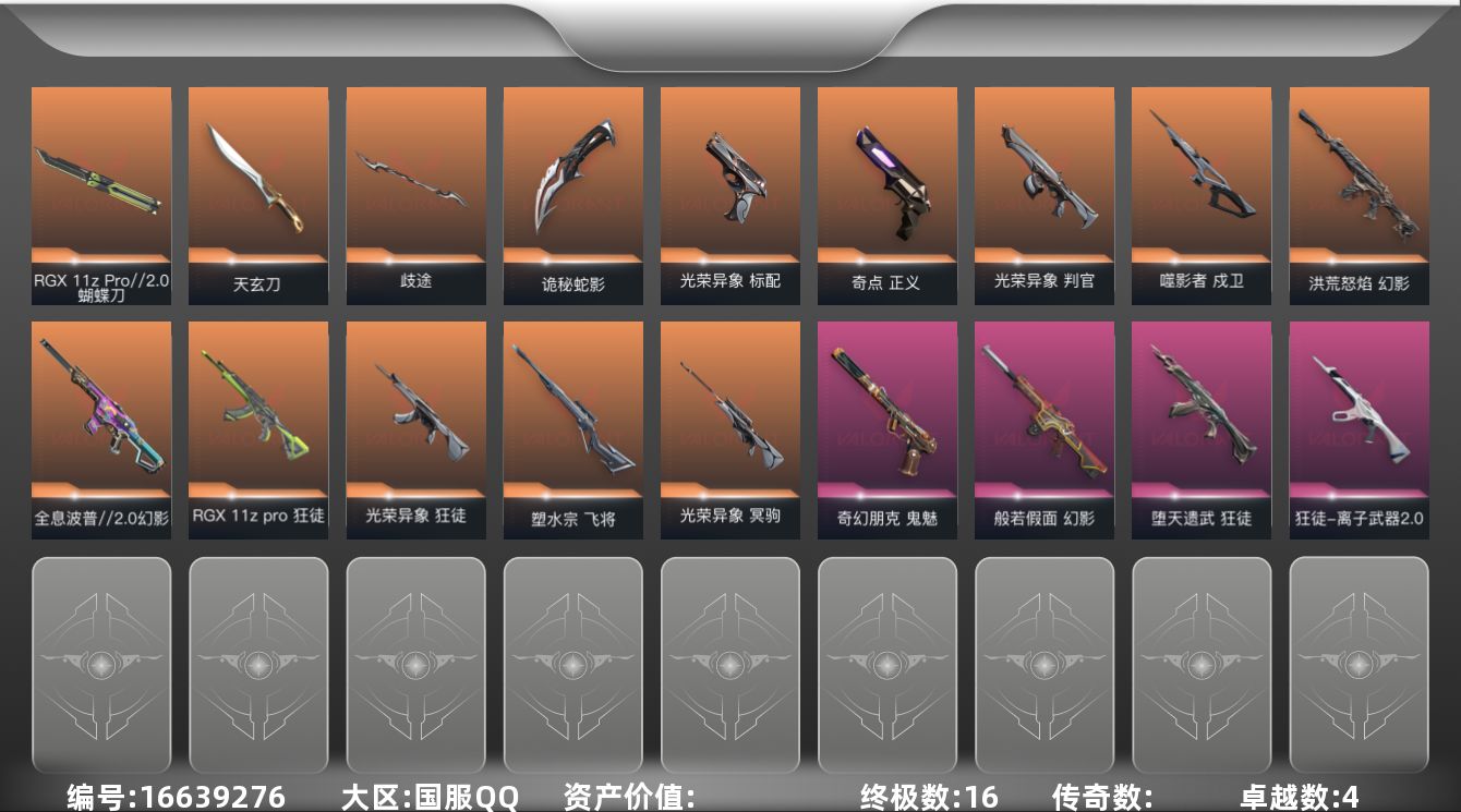 [16639276]【17】【套装】:光荣异象套装 【英雄】:幻棱,炼狱,维斯,暮蝶,壹决,捷风,雷兹,幽影,不死鸟,贤者,猎枭,蝰蛇,零,芮娜,奇乐,霓虹,盖可 【近战 武器】:近战武器-光荣异象 歧途,近战武器-RGX 11z Pro//2.0 蝴蝶刀,近战武器-天玄刀,近战武器-诡秘蛇影 军刀 【狂徒】:狂徒-RGX 11z Pro,狂徒-光荣异象,狂徒-堕天遗武,狂徒-离子武器//2.0,狂徒-诡秘蛇影 【幻影】:幻影-洪荒怒焰,幻影-全息波普//2.0,幻影-般若假面,幻影-末日之翼 【戍卫】:戍卫-噬影者,戍卫-折光棱晶 【冥驹】:冥驹-光荣异象 【飞将】:飞将-塑水宗,飞将-末日之翼 【莽侠】:莽侠-诡秘蛇影 【奥丁】:奥丁-末日之翼 【判官】:判官-光荣异象,判官-诡秘蛇影 【蜂刺】:蜂刺-折光棱晶 【标配】:标配-光荣异象,标配-折光棱晶 【正义】:正义-奇点 【鬼魅】:鬼魅-奇幻朋克,鬼魅-诡秘蛇影,鬼魅-星云暗涌 【短炮】:短炮-末日之翼 【卡面】:南瓜盛典 卡面,正义的化身 卡面,Clutch 卡面,无畏契约GO!第一卷:芮娜 卡面,无畏契约GO!第一卷:零 卡面,《双城之战》金克丝 卡面,无畏契约GO!第一卷:贤者 卡面,代号红色 卡面,新兵报到 卡面,V契约 卡面,无畏契约 卡面 【喷漆】:熊抱 喷漆,买装还是存钱 喷漆,无畏契约GO!第一卷:贤者 喷漆,胜利属于无畏契约 喷漆,GLHF 喷漆,无畏契约 喷漆 【挂饰】:第九季//第三幕 纪念币 挂饰,无畏契约GO!第一卷 芮娜 挂饰,无畏契约GO!第一卷 零 挂饰,第九季//第二幕 纪念币 挂饰,天外飞客 挂饰,《双城之战》魄罗 挂饰,海豹的认可 挂饰,无畏契约 纪念币 挂饰