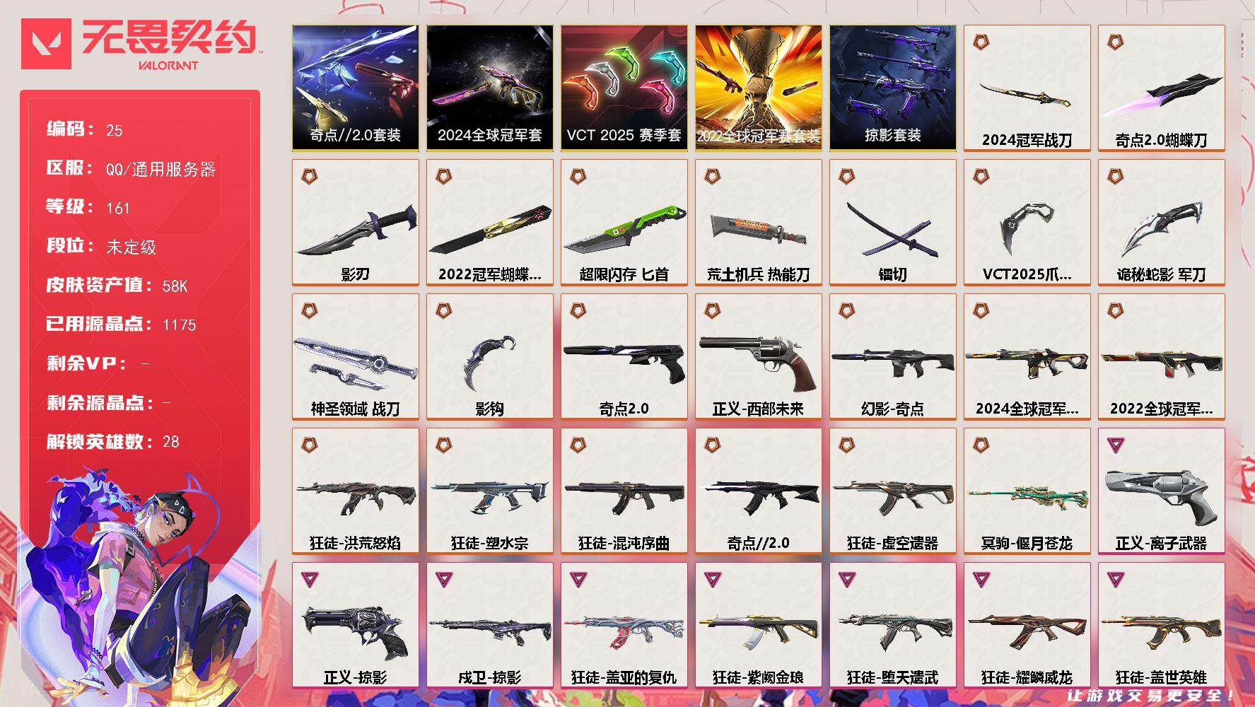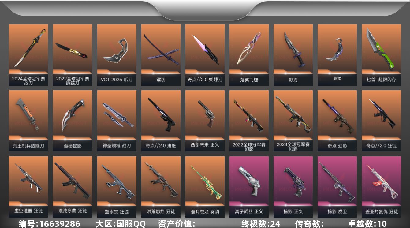 [16639286]【25】【套装】:2024全球冠军赛套装,2022全球冠军赛套装,VCT 2025 赛季套装,奇点//2.0套装,掠影套装 【英雄】:幻棱,炼狱,维斯,暮蝶,钛狐,壹决,铁臂,捷风,雷兹,幽影,不死鸟,贤者,猎枭,蝰蛇,零,芮娜,奇乐,尚勃勒,霓虹,斯凯,夜露,星礈,K/O,海神,盖可,黑梦,钢锁 【近战 武器】:近战武器-2024全球冠军赛 战刀,近战武器-2022全球冠军赛 蝴蝶刀,近战武器-影钩,近战武器-奇点//2.0 蝴蝶刀,近战武器-VCT 2025 爪刀,近战武器-落英飞旋,近战武器-镭切,近战武器-超限闪存 匕首,近战武器-荒土机兵 热能刀,近战武器-影刃,近战武器-诡秘蛇影 军刀,近战武器-神圣领域 战刀 【狂徒】:狂徒-洪荒怒焰,狂徒-混沌序曲,狂徒-奇点//2.0,狂徒-塑水宗,狂徒-虚空遗器,狂徒-堕天遗武,狂徒-掠影,狂徒-盖世英雄,狂徒-盖亚的复仇,狂徒-耀鳞威龙,狂徒-紫阙金琅,狂徒-弧光异彩,狂徒-荒土机兵,狂徒-诡秘蛇影 【幻影】:幻影-2022全球冠军赛,幻影-2024全球冠军赛,幻影-奇点,幻影-超限闪存,幻影-神圣领域,幻影-纳米打击,幻影-末日之翼 【戍卫】:戍卫-掠影,戍卫-彩梦之城,戍卫-浮光跃金,戍卫-逆冲蛮牛,戍卫-月球哨兵,戍卫-折光棱晶 【獠犬】:獠犬-弧光异彩,獠犬-神圣领域,獠犬-模拟赫兹,獠犬-逆冲蛮牛 【冥驹】:冥驹-偃月苍龙,冥驹-掠影,冥驹-荒土机兵,冥驹-模拟赫兹,冥驹-星云暗涌 【飞将】:飞将-末日之翼 【莽侠】:莽侠-超限闪存,莽侠-诡秘蛇影,莽侠-月球哨兵 【战神】:战神-神圣领域,战神-浮光跃金 【奥丁】:奥丁-纳米打击,奥丁-信手涂鸦,奥丁-末日之翼 【判官】:判官-诡秘蛇影,判官-纳米打击x 【雄鹿】:雄鹿-彩梦之城,雄鹿-模拟赫兹,雄鹿-逆冲蛮牛,雄鹿-月球哨兵 【骇灵】:骇灵-荒土机兵,骇灵-浮光跃金,骇灵-信手涂鸦,骇灵-星云暗涌 【蜂刺】:蜂刺-超限闪存,蜂刺-弧光异彩,蜂刺-星云暗涌,蜂刺-折光棱晶 【标配】:标配-荒土机兵,标配-彩梦之城,标配-浮光跃金,标配-折光棱晶 【正义】:正义-西部未来,正义-掠影,正义-离子武器,正义-超限闪存,正义-纳米打击,正义-月球哨兵 【鬼魅】:鬼魅-奇点//2.0,鬼魅-诡秘蛇影,鬼魅-模拟赫兹,鬼魅-信手涂鸦,鬼魅-星云暗涌 【狂怒】