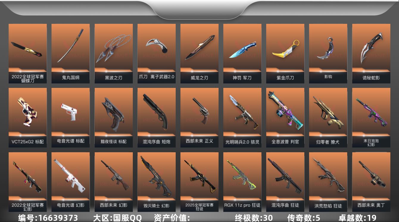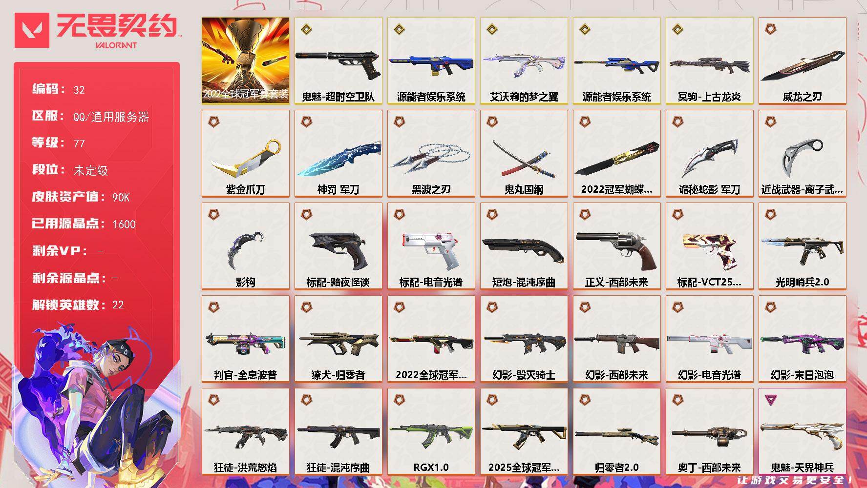 [16639373]【32】【套装】:2022全球冠军赛套装 【英雄】:幻棱,炼狱,维斯,暮蝶,壹决,铁臂,捷风,雷兹,幽影,不死鸟,贤者,猎枭,蝰蛇,零,芮娜,奇乐,尚勃勒,霓虹,夜露,K/O,盖可,黑梦 【近战 武器】:近战武器-2022全球冠军赛 蝴蝶刀,近战武器-影钩,近战武器-紫金爪刀,近战武器-黑波之刃,近战武器-威龙之刃,近战武器-鬼丸国纲,近战武器-离子武器//2.0 爪刀,近战武器-神罚 军刀,近战武器-诡秘蛇影 军刀 【狂徒】:狂徒-艾沃莉的梦之翼,狂徒-2025全球冠军赛,狂徒-洪荒怒焰,狂徒-混沌序曲,狂徒-RGX 11z Pro,狂徒-堕天遗武,狂徒-掠影,狂徒-盖世英雄,狂徒-盖亚的复仇,狂徒-日冕雄师,狂徒-诡秘蛇影 【幻影】:幻影-源能者娱乐系统,幻影-2022全球冠军赛,幻影-毁灭骑士,幻影-西部未来,幻影-电音光谱,幻影-末日泡泡,幻影-侦察力量,幻影-异鳞魔蛇,幻影-末日之翼,幻影-西部未来,幻影-电音光谱 【戍卫】:戍卫-掠影,戍卫-天界神兵,戍卫-折光棱晶 【獠犬】:獠犬-归零者 【冥驹】:冥驹-源能者娱乐系统,冥驹-上古龙炎,冥驹-堕天遗武,冥驹-离子武器,冥驹-起源 【飞将】:飞将-天界神兵,飞将-末日之翼 【莽侠】:莽侠-归零者//2.0,莽侠-诡秘蛇影 【奥丁】:奥丁-西部未来,奥丁-末日之翼 【判官】:判官-全息波普,判官-诡秘蛇影 【雄鹿】:雄鹿-紫阙金琅//2.0 【骇灵】:骇灵-光明哨兵//2.0 【蜂刺】:蜂刺-天界神兵,蜂刺-折光棱晶 【标配】:标配-黯夜怪谈,标配-电音光谱,标配-折光棱晶,标配-电音光谱 【VCT手枪】:标配-VCT25 x G2 【正义】:正义-西部未来 【鬼魅】:鬼魅-超时空卫队,鬼魅-盖亚的复仇,鬼魅-天界神兵,鬼魅-耀鳞威龙,鬼魅-掠影//2.0,鬼魅-诡秘蛇影 【短炮】:短炮-混沌序曲,短炮-末日之翼 【卡面】:树懒大作战 卡面,Clutch 卡面,无垠星环 卡面,《双城之战》金克丝 卡面,完美调谐 卡面 ,钢锁vs盖可 卡面,代号红色 卡面,新兵报到 卡面,V契约 卡面,无畏契约 卡面 【喷漆】:VCT x G2 喷漆,暴走萝莉 喷漆,松叶 喷漆,放下武器 喷漆,胜利属于无畏契约 喷漆,GLHF 喷漆,无畏契约 喷漆 【挂饰】:薰衣草之心 挂饰,动力机箱 挂饰,VCT x G2 挂饰,《双城