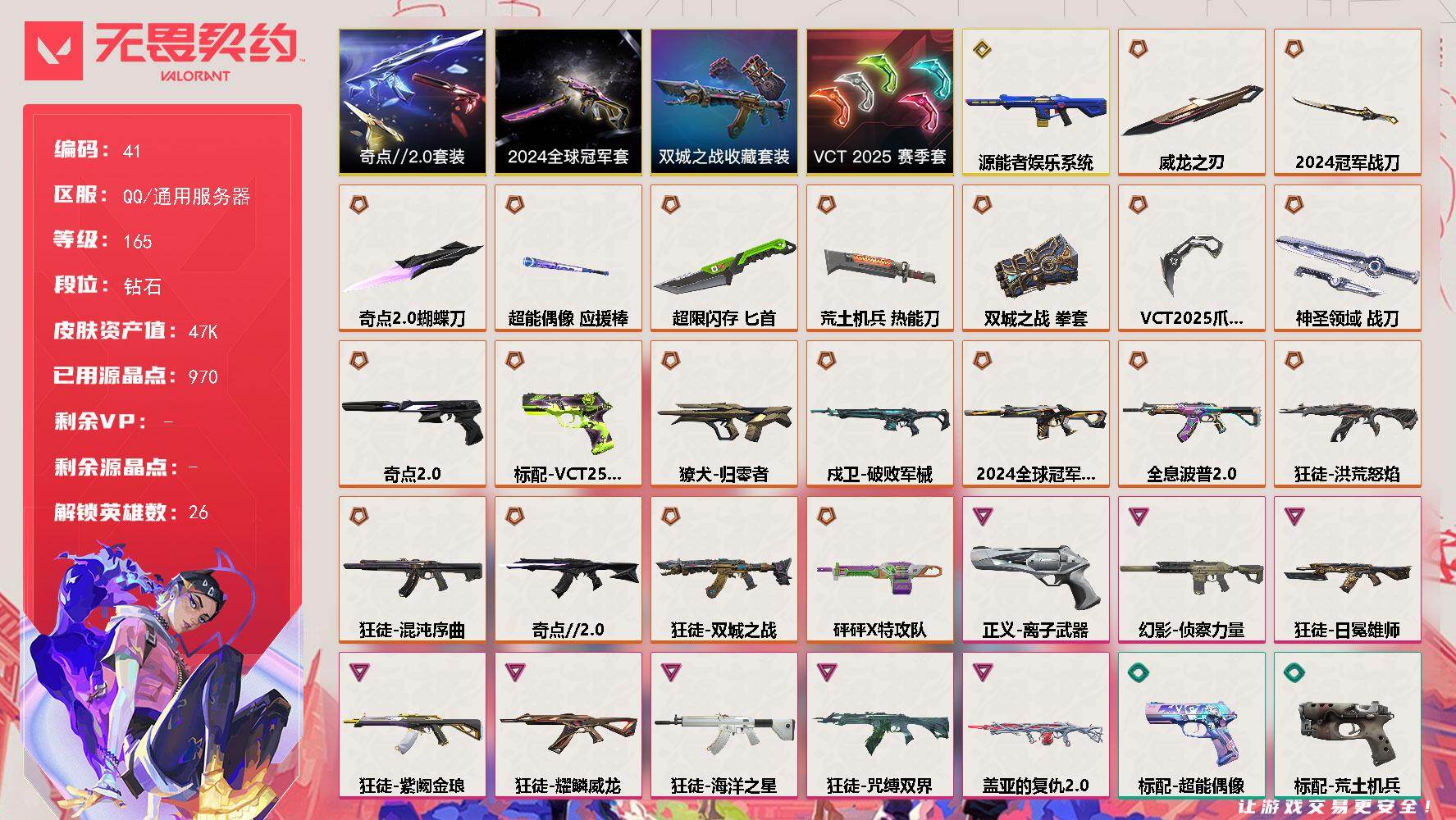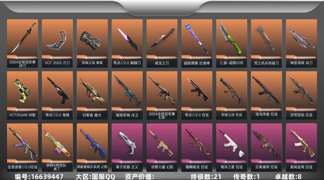 [16639447]【41】【套装】:2024全球冠军赛套装,VCT 2025 赛季套装,《双城之战》收藏套装,奇点//2.0套装 【英雄】:幻棱,炼狱,维斯,暮蝶,钛狐,壹决,铁臂,捷风,雷兹,幽影,不死鸟,贤者,猎枭,蝰蛇,零,芮娜,奇乐,尚勃勒,霓虹,斯凯,夜露,星礈,K/O,盖可,黑梦,钢锁 【近战 武器】:近战武器-2024全球冠军赛 战刀,近战武器-奇点//2.0 蝴蝶刀,近战武器-VCT 2025 爪刀,近战武器-威龙之刃,近战武器-双城之战 拳套,近战武器-超能偶像 应援棒,近战武器-超限闪存 匕首,近战武器-荒土机兵 热能刀,近战武器-神圣领域 战刀 【狂徒】:狂徒-洪荒怒焰,狂徒-混沌序曲,狂徒-奇点//2.0,狂徒-全息波普//2.0,狂徒-双城之战,狂徒-海洋之星,狂徒-日冕雄师,狂徒-耀鳞威龙,狂徒-咒缚双界,狂徒-紫阙金琅,狂徒-超能偶像,狂徒-荒土机兵 【幻影】:幻影-源能者娱乐系统,幻影-2024全球冠军赛,幻影-侦察力量,幻影-超限闪存,幻影-神圣领域,幻影-聚合之力,幻影-纳米打击 【戍卫】:戍卫-破败军械,戍卫-超能偶像,戍卫-浮光跃金,戍卫-逆冲蛮牛,戍卫-月球哨兵 【獠犬】:獠犬-归零者,獠犬-神圣领域,獠犬-采蜜小蜂队,獠犬-模拟赫兹,獠犬-逆冲蛮牛 【冥驹】:冥驹-荒土机兵,冥驹-模拟赫兹,冥驹-星云暗涌 【飞将】:飞将-聚合之力 【莽侠】:莽侠-超限闪存,莽侠-月球哨兵 【战神】:战神-盖亚的复仇//2.0,战神-神圣领域,战神-采蜜小蜂队,战神-浮光跃金 【奥丁】:奥丁-砰砰X特攻队,奥丁-纳米打击 【判官】:判官-超能偶像,判官-采蜜小蜂队,判官-纳米打击x 【雄鹿】:雄鹿-模拟赫兹,雄鹿-逆冲蛮牛,雄鹿-月球哨兵 【骇灵】:骇灵-荒土机兵,骇灵-浮光跃金,骇灵-星云暗涌 【蜂刺】:蜂刺-超限闪存,蜂刺-聚合之力,蜂刺-星云暗涌 【标配】:标配-超能偶像,标配-荒土机兵,标配-浮光跃金 【VCT手枪】:标配-VCT25 x M8 【正义】:正义-离子武器,正义-超限闪存,正义-纳米打击,正义-月球哨兵 【鬼魅】:鬼魅-奇点//2.0,鬼魅-采蜜小蜂队,鬼魅-模拟赫兹,鬼魅-星云暗涌 【狂怒】:狂怒-神圣领域,狂怒-聚合之力,狂怒-逆冲蛮牛 【卡面】:终章:激斗汉堡 卡面,进入射程 卡面,分崩离析 卡面,纳米打击 卡面,抑制技术 卡面