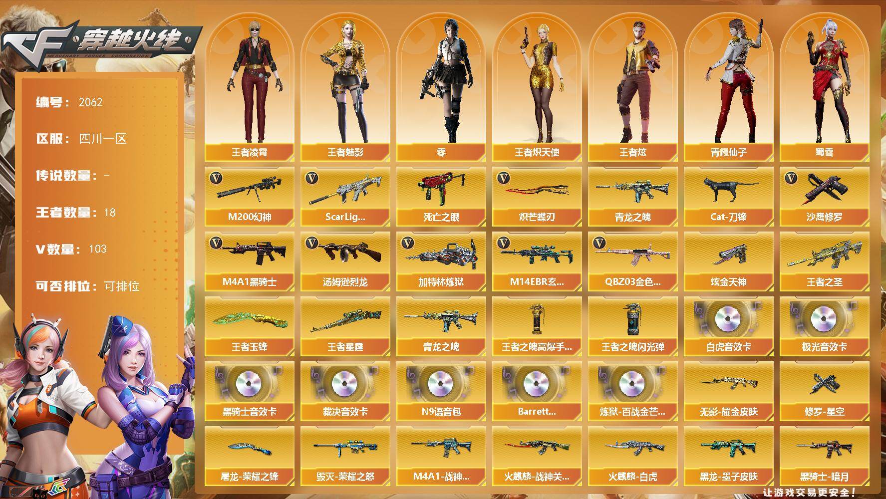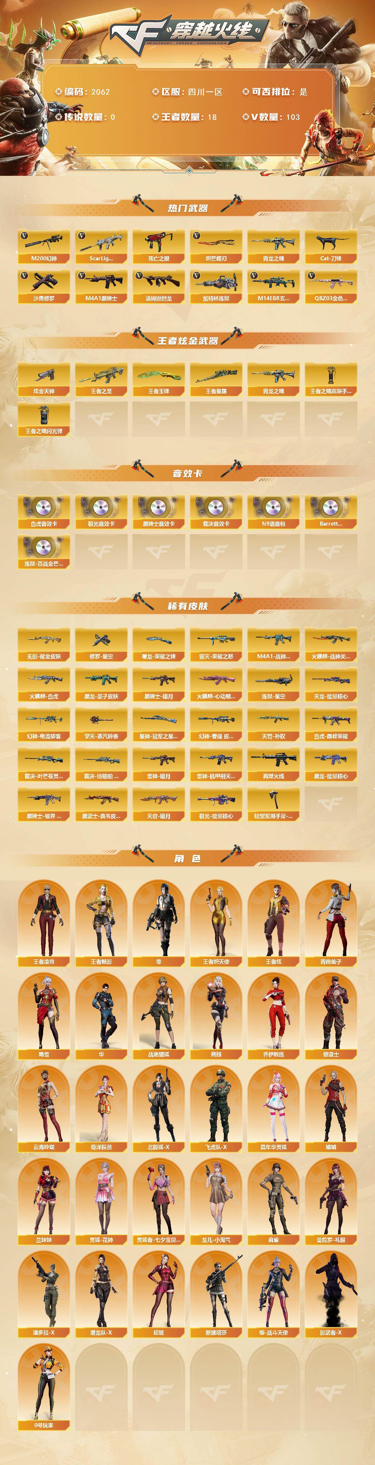 [16639550]四川一区-113V-18王者武器数-1炫金武器数 【热门武器】:QBZ03-金色蔷薇,M14EBR-玄武,Scar Light-白虎,M200-幻神,死亡之眼,青龙之魄,Cat-刀锋,M4A1-黑骑士*3,汤姆逊-烈龙*4,加特林-炼狱,沙鹰-修罗*2,炽芒蝶刃 【王者炫金武器】:王者之圣,青龙之魄,王者星霆,王者玉锋,炫金天神,王者之魄高爆手雷,王者之魄闪光弹*2 【音效卡】:M4A1-黑骑士音效卡,Barrett-极光音效卡,AWM-裁决音效卡,Scar Light-白虎音效卡,N9语音包,Barrett-碧霄极光音效卡,炼狱-百战金芒-庆典舞曲音效卡 【皮肤】:幻神-电流骇客 皮肤,幻神-曹操 皮肤,白虎-巅峰荣耀 皮肤,裁决-叶芒苍灵 皮肤,裁决-运输船 皮肤,Kar98K-星神-冠军之星皮肤,雷神-暗月,M4A1-战神赵云,雷神-机甲刑天皮肤,M4A1-再燃火线,火麒麟-战神关羽,火麒麟-白虎,火麒麟-心动糖果,毁灭-荣耀之怒,黑龙-能量核心,黑龙-墨子皮肤,黑骑士-暗月,黑骑士-破界 皮肤,无影耀金皮肤,黑武士-典韦皮肤,天启-暗月,天罚-孙权 皮肤,天龙-能量核心,极光-能量核心,炼狱-星空,修罗-星空,屠龙-荣耀之锋,轻型军用手斧-再燃火线,擎天-蒸汽钟表 皮肤 【角色】:零,华,荆棘,战地猎狐,王者炫,王者凌霄,王者-魅影,王者炽天使,奇洋探员,乔伊教练,修道士,云海玲珑,北极狐-X,飞虎队-X,嘉年华灵狐,娟娟,兰妹妹,0号玩家,灵狐-花神,灵狐者-七夕宝贝,龙儿-小淘气,麻雀,曼陀罗-礼服,潘多拉-X,潜龙队-X,青霞仙子,蛇姬,蜀雪,新娜塔莎,樱-战斗天使,影武者-X 【人偶武器】:天龙-曼陀罗,火麒麟-灵狐,Cat-刀锋,迷你牛魔王,迷你牛牛,生化手雷-机甲核心,迷你深渊冰龙-王绿豆 【暴走生化】:死亡之眼,超级对讲机 【挑战大师】:神圣爆裂者-末日III,阐释者III 【英雄级武器】:M4A1-千变,AK47-火麒麟,M4A1-黑龙,M4A1-雷神,M4A1-黑骑士*3,AK47-无影,M4A1-死神,AK47-黑武士,AK12-天启,AN94-超新星,AK47-黑鲨,Scar Light-白虎,M14EBR-玄武,无影-神兵利器,黑武士-锦绣游龙,M4A1-玫瑰精灵,QBZ03-金色蔷薇,烈火-动感闪耀,王者之势-觉醒版,天启-悦智-