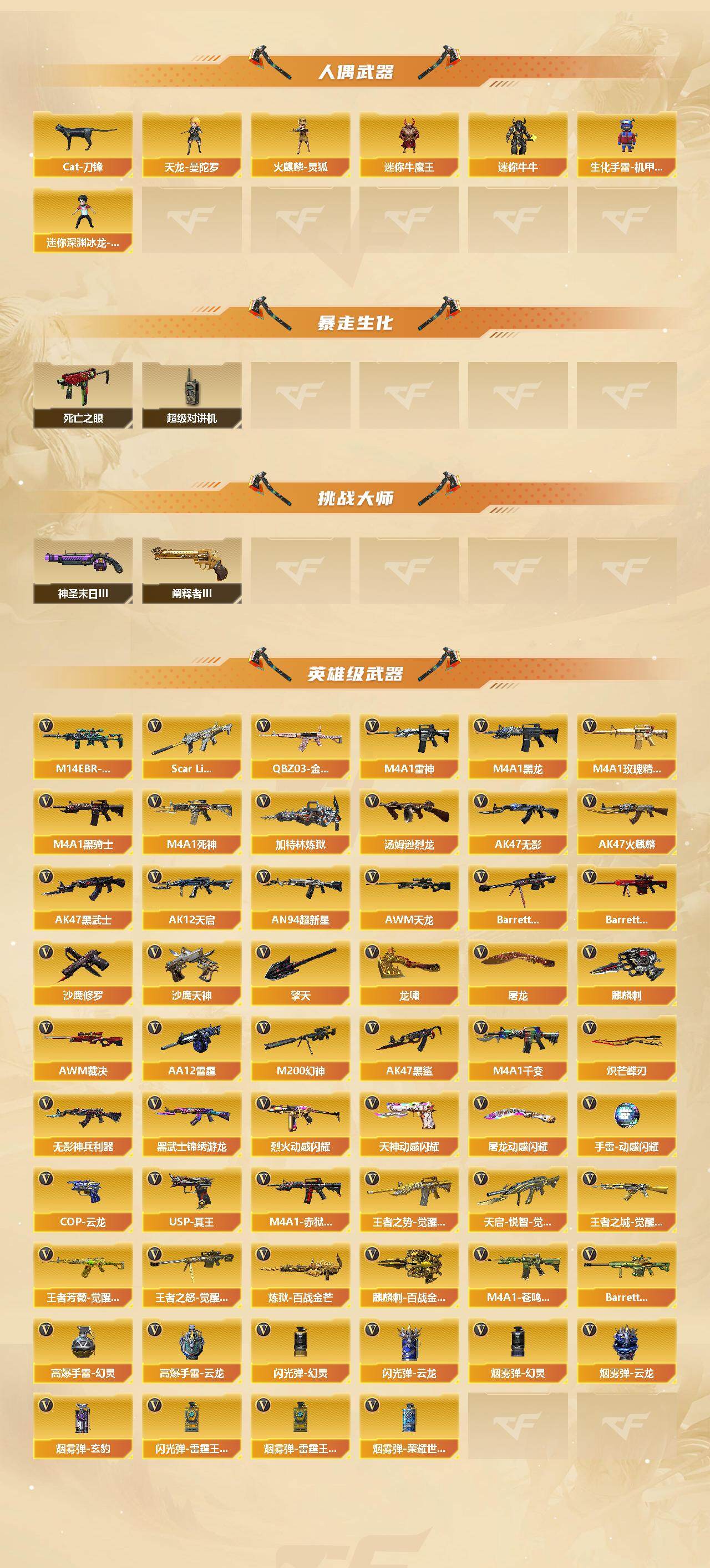 【英雄级武器】:M4A1-千变,AK47-火麒麟,M4A1-黑龙,M4A1-雷神,M4A1-黑骑士*3,AK47-无影,M4A1-死神,AK47-黑武士,AK12-天启,AN94-超新星,AK47-黑鲨,Scar Light-白虎,M14EBR-玄武,无影-神兵利器,黑武士-锦绣游龙,M4A1-玫瑰精灵,QBZ03-金色蔷薇,烈火-动感闪耀,王者之势-觉醒版,天启-悦智-