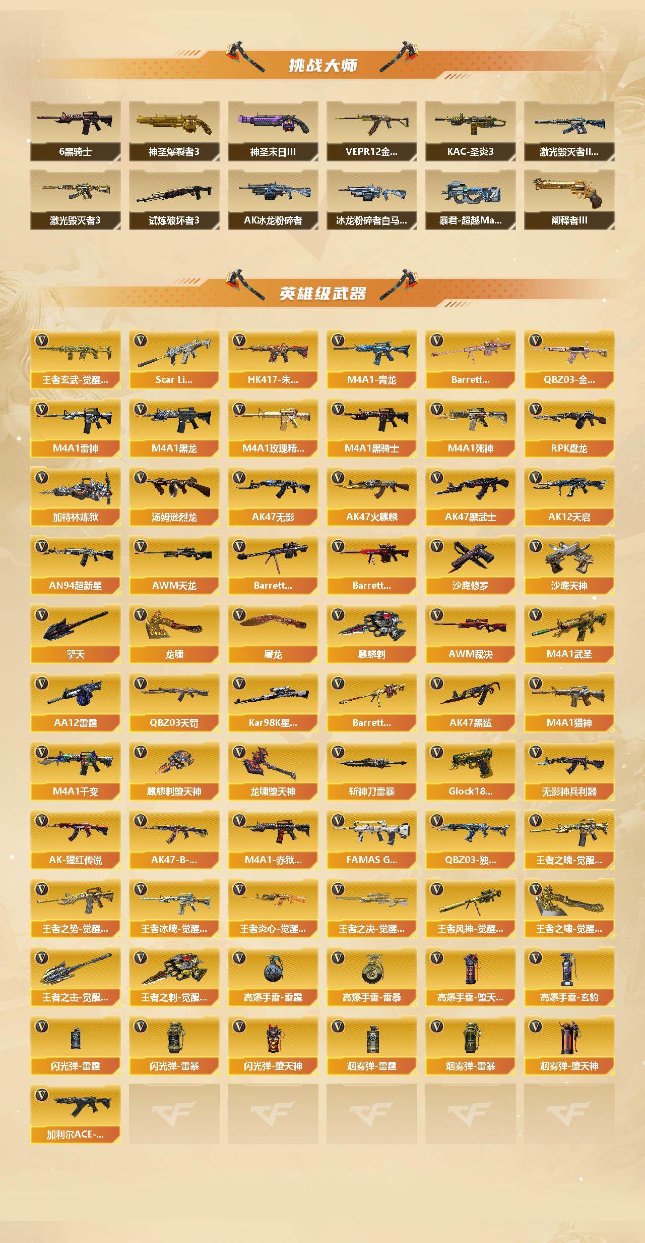 【英雄级武器】:M4A1-千变,AK47-火麒麟*2,M4A1-黑龙*3,M4A1-雷神*3,M4A1-黑骑士*6,AK47-无影,M4A1-死神,AK47-黑武士*2,AK12-天启*2,AN94-超新星,M4A1-武圣,AK47-黑鲨,M4A1-青龙,HK417-朱雀,Scar Light-白虎,QBZ03-天罚,无影-神兵利器,FAMAS G2-天戎,QBZ03-独角