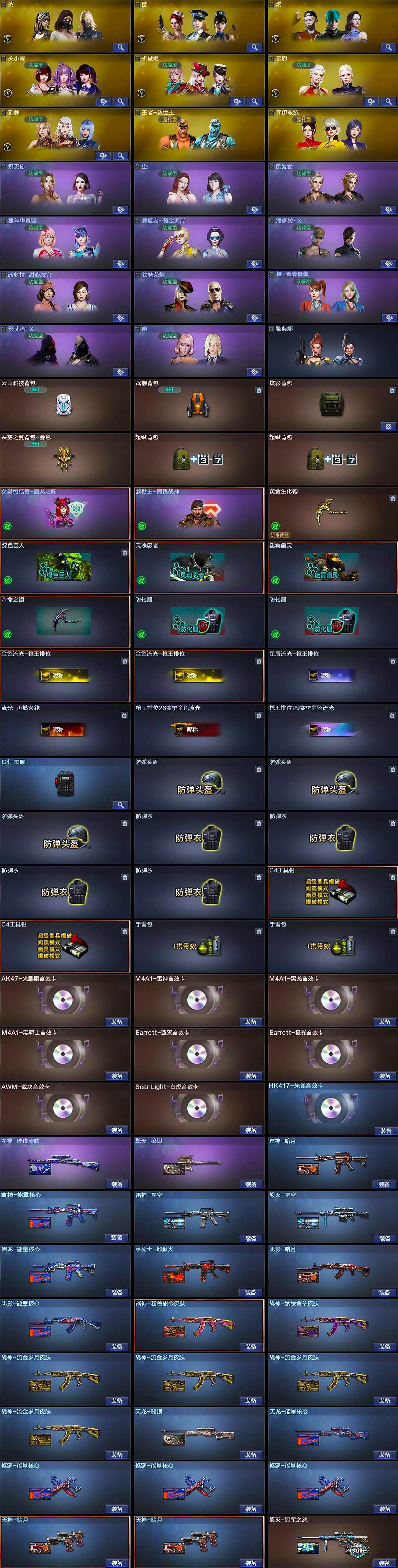 - [16320239]广西一区-34V-4王者-0炫金 【传说武器】:传说幽冥 【传说角色】:传说影煞 【热门武器】:传说幽冥,M14EBR-玄武,八面凌龙,Cat-刀锋,毒蜂,牛牛-AK47,M4A1-黑骑士,汤姆逊-烈龙*6,加特林-炼狱,羊驼玩偶 【音效卡】:M4A1-黑骑士音效卡,枪娘语音包-阿敏,M14EBR-玄武音效卡,炼狱-百战金芒-庆典舞曲音效卡,死神-雪域霜狐-怀旧音效卡 【皮肤】:裁决-流光秘银,裁决-运输船 皮肤,M4A1-再燃火线,火麒麟-大唐荣光,M4A1-千变-孔明皮肤*2,黑骑士-冠军之势,屠龙-破浪逐光 皮肤,屠龙-惊鸿 皮肤,轻型军用手斧-再燃火线 【角色】:王者潘多拉,雪域霜狐,奇洋探员,暗夜-X,北极狐-X,初恋灵狐,飞虎队-X,风暴女,嘉年华灵狐,兰-海滩派对,兰妹妹,龙儿-小淘气,萌儿,青霞仙子,斯沃特-X,蜀雪,铁骑荣耀,兔囡囡,维纳斯,夜玫瑰-宠粉,影武者-X 【人偶武器】:天龙-乔伊教练,Scar Light-马枪,斯泰尔-枪娘暗刃,加特林-机械猎手,AWM-灵狐-15周年嘉年华*2,海滩汪汪-巴雷特,Cat-刀锋,牛牛-AK47,迷你深渊冰龙,迷你裂空之翼,夺魂,迷你生化手雷,生化手雷-机甲核心*3,迷你巨石泰坦-魔花研究所,烟雾弹-迷雾幽灵 【暴走生化】:毒蜂,超级对讲机 【挑战大师】:冰龙粉碎者-白马银枪*3,激光毁灭者III-白马银枪,激光毁灭者III,试炼破坏者III 【英雄级武器】:AK47-火麒麟*2,M4A1-雷神,M4A1-黑骑士,AN94-超新星,M4A1-龙血,M14EBR-玄武,黑武士-锦绣游龙,八面凌龙,M4A1-玫瑰精灵,王者芳薇-觉醒版,Barrett-毁灭,AWM-裁决,王者之怒-觉醒版,加特林-炼狱,炼狱-百战金芒,汤姆逊-烈龙*6,沙鹰-天神,屠龙*3,龙啸,擎天,麒麟刺,麒麟刺-百战金芒,高爆手雷-幻灵,手雷-热带奇洋,M4A1-赤狱骑士 【道具】:BS战队炫彩背包,CFS限定背包,云山科技背包,云海游龙炫彩背包,奇洋探员-海龟背包,战舰背包,机械魔影背包-红色,炫彩背包-诺拉,百战金芒炫彩背包,老虎背包,背包-洛丽塔,超级背包,雪域霜狐炫彩背包,圣拳猎手-炽雪,虚空终结者-暗域熔岩,女皇终结者-魔龙之吻,救世主-黑桃战神,黄金生化钩,绿色巨人,灵魂忍者*2,变异宝贝,迷雾幽灵*2,生化弹匣,夺命之镰