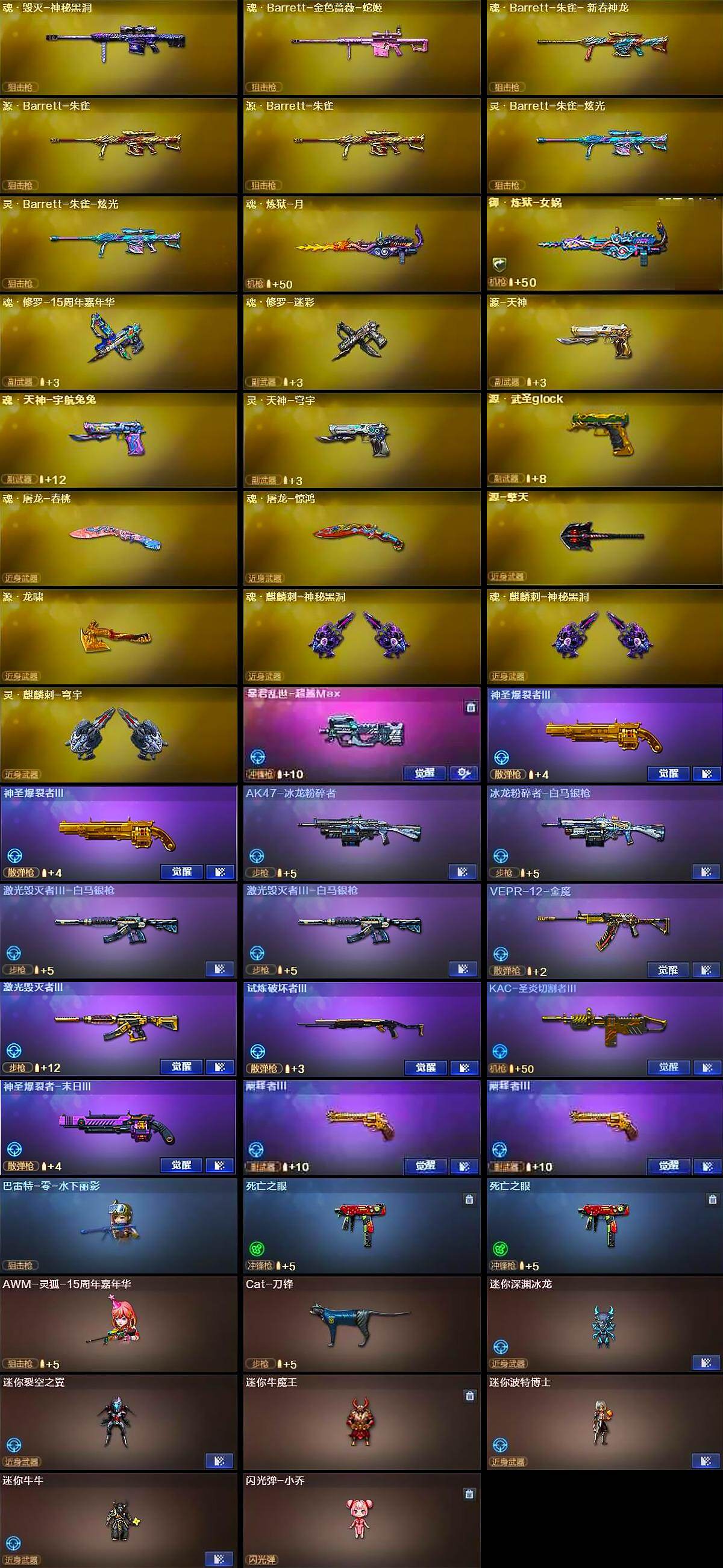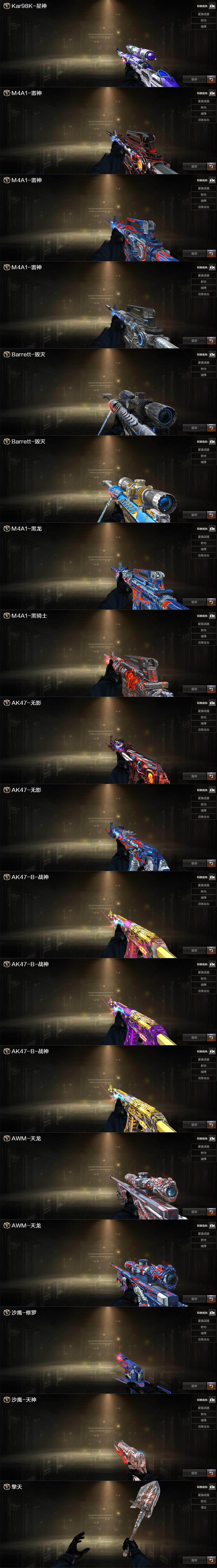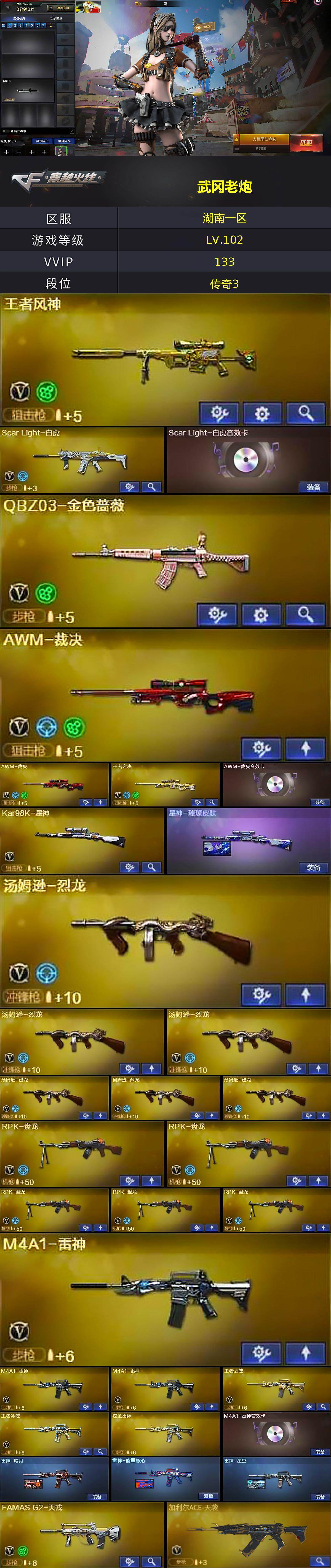 【热门武器】:QBZ03-金色蔷薇,Scar Light-白虎,HK417-朱雀,M4A1-青龙,死亡之眼*2,Kar98K-星神,金色小号,Cat-刀锋,M4A1-黑骑士*6,汤姆逊-烈龙*6,RPK-盘龙*5,加特林-炼狱,沙鹰-修罗*6