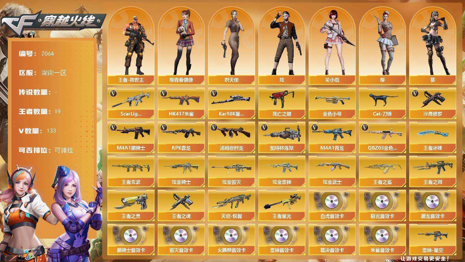 [16639992]湖南一区-146V-19王者武器数-5炫金武器数 【热门武器】:QBZ03-金色蔷薇,Scar Light-白虎,HK417-朱雀,M4A1-青龙,死亡之眼*2,Kar98K-星神,金色小号,Cat-刀锋,M4A1-黑骑士*6,汤姆逊-烈龙*6,RPK-盘龙*5,加特林-炼狱,沙鹰-修罗*6 【王者炫金武器】:王者之鲨,王者之戮,天启-悦智,王者玄武,王者星光,王者之灵,王者之魂,王者冰锋*2,炫金骑士*2,炫金雷神,炫金武士,炫金毁灭 【音效卡】:AK47-火麒麟音效卡,M4A1-雷神音效卡,M4A1-黑龙音效卡,M4A1-黑骑士音效卡,Barrett-毁灭音效卡,Barrett-极光音效卡,AWM-裁决音效卡,Scar Light-白虎音效卡,HK417-朱雀音效卡 【皮肤】:星神-璀璨皮肤,雷神-暗月,雷神-能量核心,雷神-星空,毁灭-星空,毁灭-冠军之怒,黑龙-能量核心,黑骑士-地狱火,无影-暗月,无影-能量核心,战神-粉色甜心皮肤,战神-紫绶金章皮肤,战神-流金岁月皮肤*4,天龙-秘银,天龙-能量核心,修罗-能量核心*3,天神-暗月*2,擎天-秘银 【角色】:葵,樱,炫,关小雨,机械姬,玄豹,荆棘,王者-救世主,乔伊教练,炽天使,空,风暴女,嘉年华灵狐,灵狐者-黄金海岸,潘多拉-X,潘多拉-甜心教官,铁骑荣耀,樱-青春偶像,影武者-X,幽,雅典娜 【人偶武器】:巴雷特-零-水下丽影,AWM-灵狐-15周年嘉年华,Cat-刀锋,迷你深渊冰龙,迷你裂空之翼,迷你牛魔王,迷你波特博士,迷你牛牛,闪光弹-小乔 【暴走生化】:死亡之眼*2 【挑战大师】:暴君乱世-超越Max,神圣爆裂者III*2,AK47-冰龙粉碎者,冰龙粉碎者-白马银枪,激光毁灭者III-白马银枪*2,VEPR-12-金魔,激光毁灭者III,试炼破坏者III,KAC-圣炎切割者III,神圣爆裂者-末日III,阐释者III*2 【英雄级武器】:M4A1-千变,AK47-火麒麟*2,M4A1-黑龙*3,M4A1-雷神*3,M4A1-黑骑士*6,AK47-无影,M4A1-死神,AK47-黑武士*2,AK12-天启*2,AN94-超新星,M4A1-武圣,AK47-黑鲨,M4A1-青龙,HK417-朱雀,Scar Light-白虎,QBZ03-天罚,无影-神兵利器,FAMAS G2-天戎,QBZ03-独角