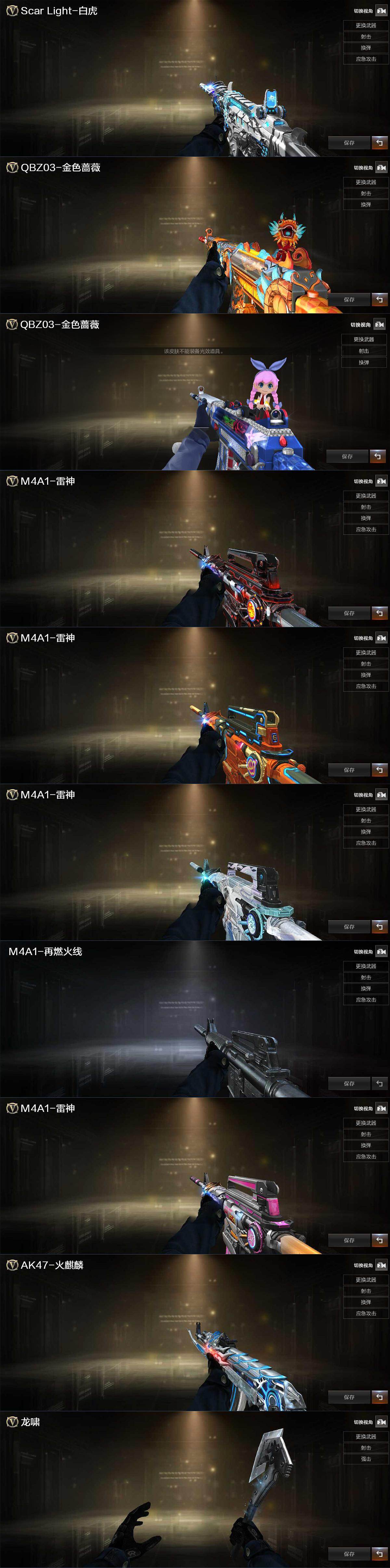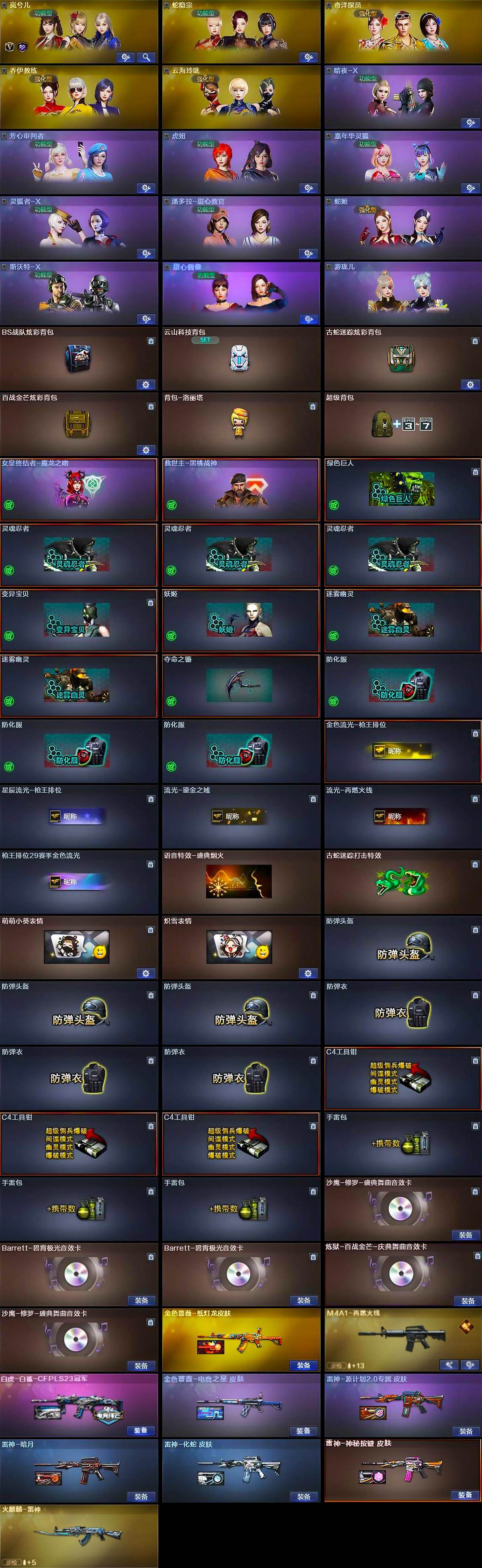 【皮肤】:白虎-白鲨-CFPLS23冠军,金色蔷薇-纸灯龙皮肤,金色蔷薇-电竞之星 皮肤,雷神-暗月,雷神-源计划2.0专属 皮肤,雷神-化蛇 皮肤,M4A1-再燃火线,雷神-神秘按键 皮肤,火麒麟-雷神,轻型军用手斧-再燃火线