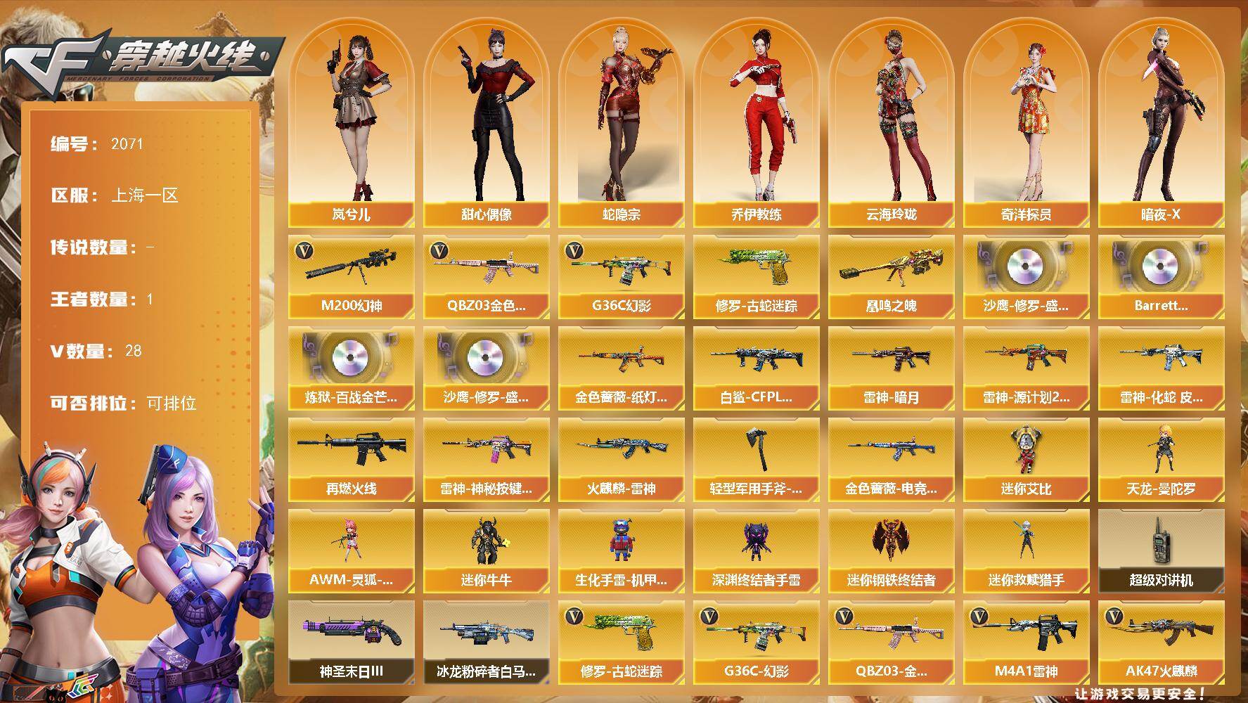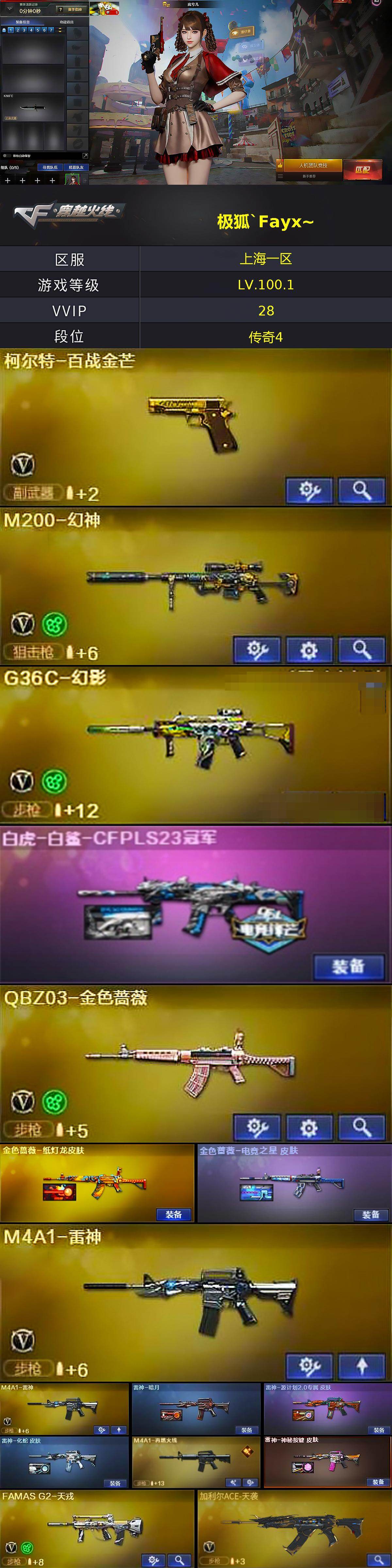 [16640584]上海一区-29V-1王者武器数-0炫金武器数 【热门武器】:G36C-幻影,QBZ03-金色蔷薇,M200-幻神,修罗-古蛇迷踪 【王者炫金武器】:凰鸣之魄 【音效卡】:沙鹰-修罗-盛典舞曲音效卡*2,Barrett-碧霄极光音效卡*2,炼狱-百战金芒-庆典舞曲音效卡 【皮肤】:白虎-白鲨-CFPLS23冠军,金色蔷薇-纸灯龙皮肤,金色蔷薇-电竞之星 皮肤,雷神-暗月,雷神-源计划2.0专属 皮肤,雷神-化蛇 皮肤,M4A1-再燃火线,雷神-神秘按键 皮肤,火麒麟-雷神,轻型军用手斧-再燃火线 【角色】:岚兮儿,蛇隐宗,奇洋探员,乔伊教练,云海玲珑,暗夜-X,芳心审判者,虎妞,嘉年华灵狐,灵狐者-X,潘多拉-甜心教官,蛇姬,斯沃特-X,甜心偶像,兔囡囡,游珑儿 【人偶武器】:天龙-曼陀罗,迷你钢铁终结者,迷你救赎猎手,AWM-灵狐-15周年嘉年华,迷你牛牛,生化手雷-机甲核心*2,深渊终结者手雷,迷你艾比 【暴走生化】:超级对讲机 【挑战大师】:冰龙粉碎者-白马银枪,神圣爆裂者-末日III 【英雄级武器】:AK47-火麒麟,M4A1-雷神*2,QBZ03-天罚,无影-神兵利器,G36C-幻影,黑武士-锦绣游龙,FAMAS G2-天戎,QBZ03-金色蔷薇,黑骑士-海王,加利尔ACE-天袭,M200-幻神,炼狱-百战金芒,柯尔特-百战金芒,修罗-古蛇迷踪,龙啸,麒麟刺-百战金芒,高爆手雷-古蛇迷踪,烟雾弹-古蛇迷踪,M4A1-赤狱骑士,M4A1-苍鸣雷神 【道具】:BS战队炫彩背包,云山科技背包,古蛇迷踪炫彩背包,百战金芒炫彩背包,背包-洛丽塔,超级背包,女皇终结者-魔龙之吻,救世主-黑桃战神,绿色巨人,灵魂忍者*3,变异宝贝,妖姬,迷雾幽灵*2,夺命之镰,防化服*3,金色流光-枪王排位,星辰流光-枪王排位,流光-鎏金之域,流光-再燃火线,枪王排位29赛季金色流光,语音特效-盛典烟火,古蛇迷踪打击特效,萌萌小葵表情,炽雪表情,防弹头盔*3,防弹衣*3,C4工具钳*3,手雷包*3 【特殊枪械】: