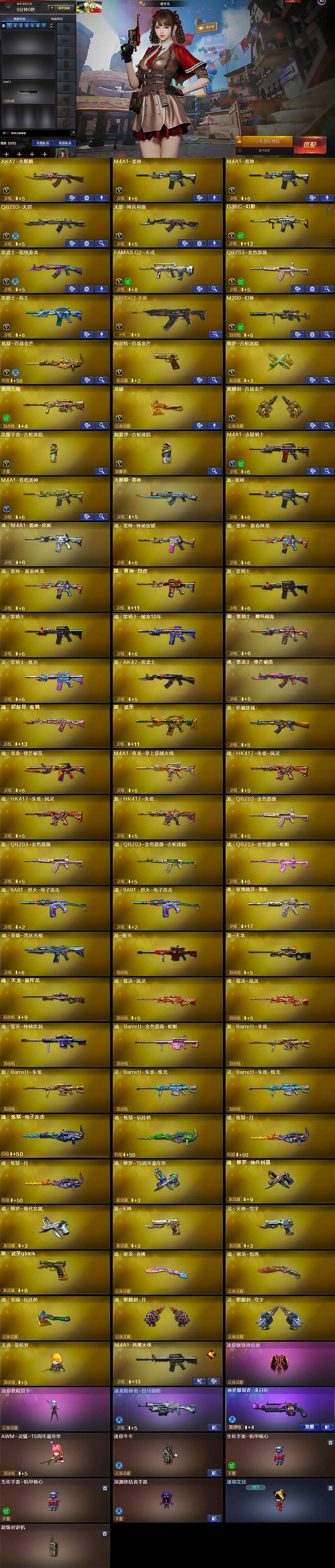 【英雄级武器】:AK47-火麒麟,M4A1-雷神*2,QBZ03-天罚,无影-神兵利器,G36C-幻影,黑武士-锦绣游龙,FAMAS G2-天戎,QBZ03-金色蔷薇,黑骑士-海王,加利尔ACE-天袭,M200-幻神,炼狱-百战金芒,柯尔特-百战金芒,修罗-古蛇迷踪,龙啸,麒麟刺-百战金芒,高爆手雷-古蛇迷踪,烟雾弹-古蛇迷踪,M4A1-赤狱骑士,M4A1-苍鸣雷神