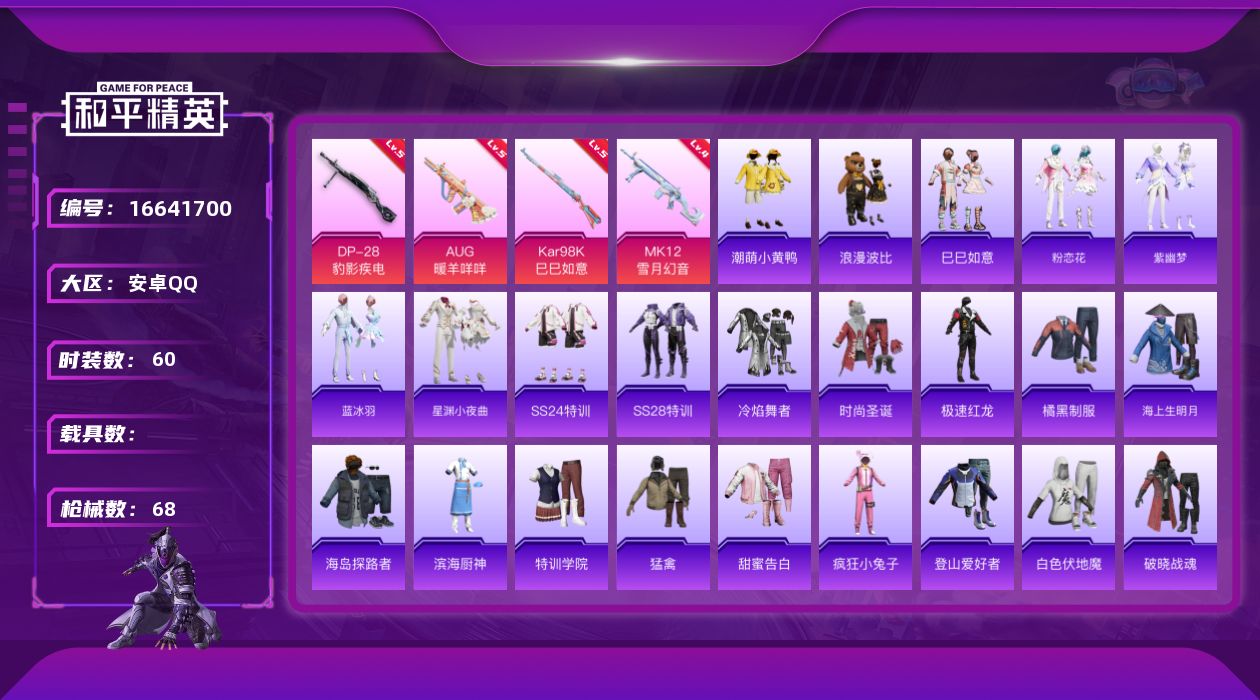 [16641700]安卓 手Q-0粉装-4特效枪-0载具-3粉色飞行器-21732热力值-1王牌印记-60套装-68枪皮 【热门品类】:套装-潮萌小黄鸭,套装-浪漫波比 【粉色枪皮等级】:AUG-暖羊咩咩(五级),Kar98K-巳巳如意(五级),MK12-雪月幻音(四级),DP-28-豹影疾电(五级) 【粉色枪皮】:AUG-暖羊咩咩,Kar98K-巳巳如意,MK12-雪月幻音,DP-28-豹影疾电 【粉色飞行器】:星之彼岸飞行器,极意拳锋飞行器 【粉色降落伞】:龙虾霸霸降落伞,月影灵韵降落伞,炫彩糖果降落伞 【稀有套装】:套装-巳巳如意,套装-炫彩糖果,套装-粉恋花,套装-紫幽梦,套装-蓝冰羽,套装-星渊小夜曲 【稀有枪皮】:AKM-棋盘冕主,M16A4-幻世战舞者,GROZA-影袭,AUG-天降萌叽,AUG-月影灵韵,M762-天降萌叽,G36C-不夜海上花,G36C-星穹咏叹调,蜜獾-天降萌叽,UZI-影袭,P90-巳巳如意,M24-幻彩电音,QBU-不夜海上花,AMR-喜羊羊与灰太狼,S686-不夜海上花,S686-巳巳如意,S12K-智耀战神,爆炸猎弓-雪月幻音 【其他套装】:套装-SS24特训,套装-SS28特训,套装-冷焰舞者,套装-时尚圣诞,套装-极速红龙,套装-橘黑制服,套装-海上生明月,套装-海岛探路者,套装-滨海厨神,套装-特训学院,套装-猛禽,套装-甜蜜告白,套装-疯狂小兔子,套装-登山爱好者,套装-白色伏地魔,套装-破晓战魂,套装-破蛋小黄鸡,套装-竞技勇士朋克,套装-竞技达人朋克,套装-绮丽涂鸦,套装-耀眼新星,套装-耀粉歌者,套装-蓝彩潮人,套装-蓝色运动,套装-都市魅力,套装-酷萌兔限定,套装-青涩时光,套装-顽皮玉兔,套装-魅力单车,套装-黄色伏地魔,套装-黄色运动,套装-黑色伏地魔,套装-漫步者,套装-雪山精英,套装-浪漫波比,套装-潮萌小黄鸭,套装-风华少年志,套装-舞夜骑士 【稀有头盔】:银河战甲头盔(1级) 【稀有背包】:静灵氛围潮音背包(3级),静灵氛围潮音背包(2级),静灵氛围潮音背包(1级),神秘黑猫背包(2级),古堡领主背包(2级) 【营地ID】:991200976