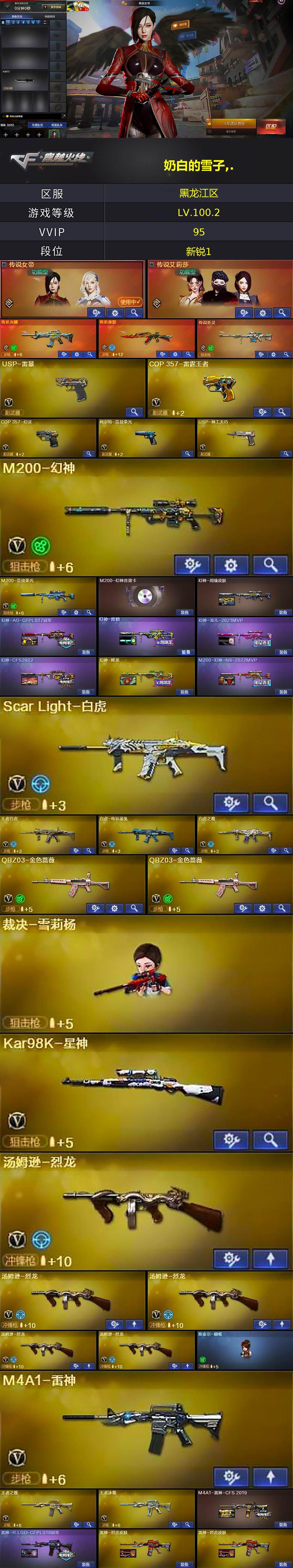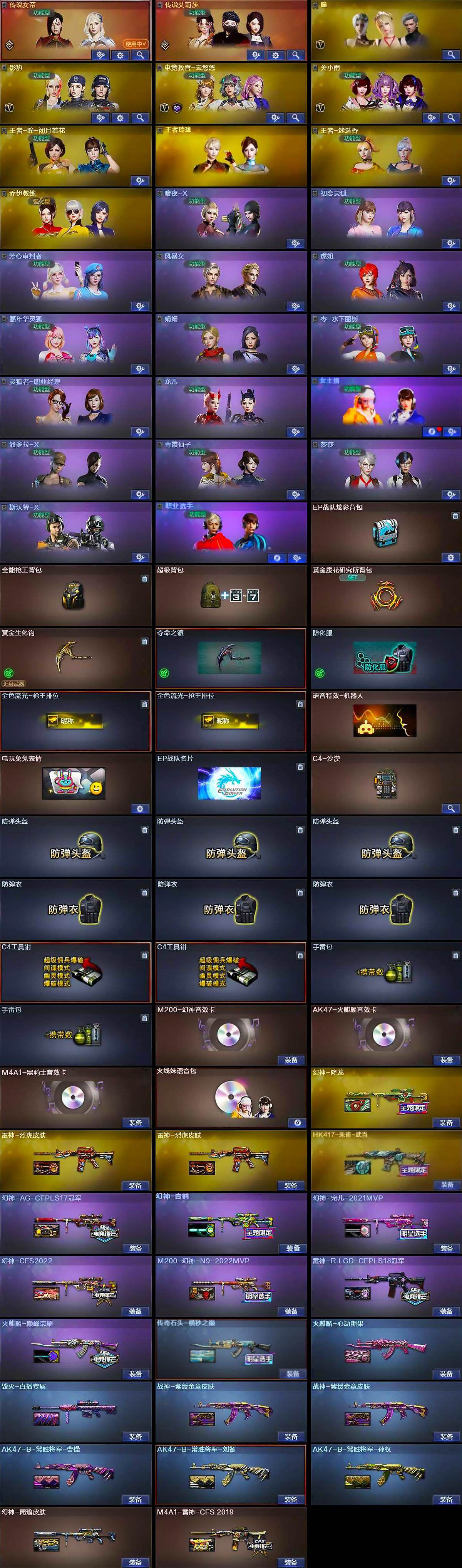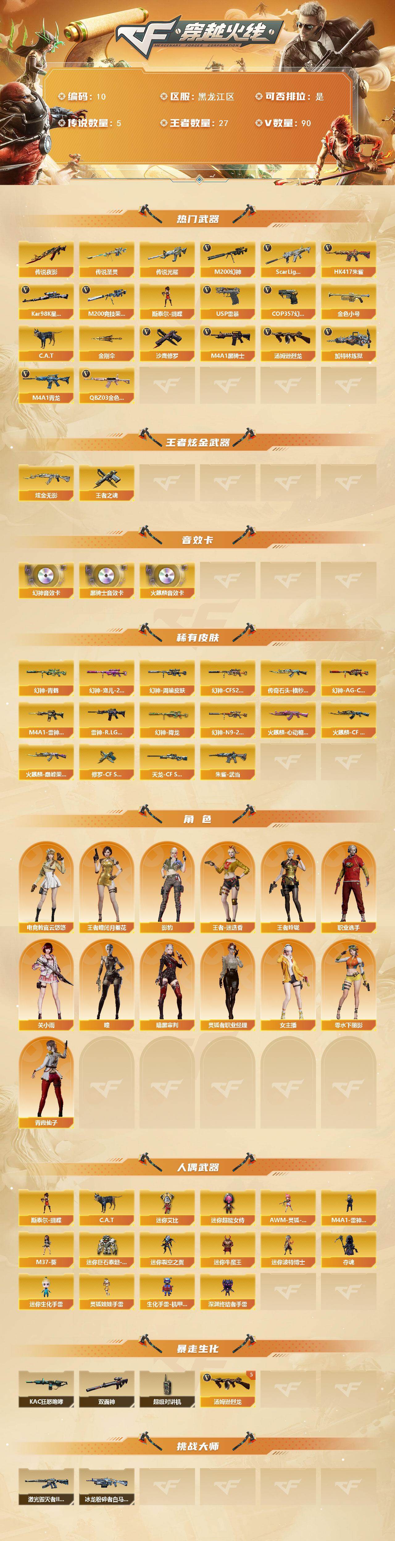[16318365]黑龙江区-90V-27王者-1炫金 【角色】:传说女帝,传说艾莉莎,王者-瞳-闭月羞花,王者玲珑,王者-迷迭香,零-水下丽影,灵狐者-职业经理,电竞教官-云悠悠,瞳,影豹,关小雨,女主播,职业选手,暗黑审判,青霞仙子 【热门武器】:传说夜影,传说圣灵,传说光耀,M200-幻神,Scar Light-白虎,HK417-朱雀,Kar98K-星神,M200-竞技荣光,斯泰尔-蝴蝶,USP-雷暴,COP 357-幻灵,金色小号,C.A.T,金刚伞,沙鹰-修罗,沙鹰-修罗,沙鹰-修罗,沙鹰-修罗,M4A1-黑骑士,M4A1-黑骑士,M4A1-黑骑士,汤姆逊-烈龙,汤姆逊-烈龙,汤姆逊-烈龙,汤姆逊-烈龙,汤姆逊-烈龙,加特林-炼狱 【王者炫金武器】:炫金无影,王者之魂 【稀有皮肤】:传奇石头-横秒之巅,幻神-青鹤,幻神-宠儿-2021MVP,幻神-周瑜皮肤,幻神-AG-CFPLS17冠军,M4A1-雷神-CFS 2019,雷神-R.LGD-CFPLS18冠军,幻神-降龙,幻神-AG-CFPLS17冠军,幻神-CFS2022,M200-幻神-N9-2022MVP,火麒麟-心动糖果,火麒麟-CFSTAR,火麒麟-CFSTAR,火麒麟-巅峰荣耀,修罗-CFSTAR,天龙-CFSTAR,HK417-朱雀-武当,M200-庆典-CFS 2021,M200-庆典-CFS 2021 【其他皮肤】:USP-嘉年华柯基,QBZ03-吕布,QBZ03-烛龙,AK47-B-常胜将军-孙权,AK47-B-身先士卒,AK47-B-常胜将军-曹操,AK47-B-常胜将军-刘备,AK47-丹龙,AK47-丹龙,98K-冰雪霸主,98K-黑金,98K-炫彩,98K-幻能朋克,加特林-炼狱-掌火,M4A1-青龙,M4A1-水枪 【人偶武器】:斯泰尔-蝴蝶,C.A.T,迷你艾比,迷你超能女侍,AWM-灵狐-15周年嘉年华,M4A1-雷神-精英刀锋,M37-葵,迷你巨石泰坦-魔花研究所,迷你裂空之翼,迷你牛魔王,迷你波特博士,夺魂,迷你生化手雷,迷你生化手雷,迷你生化手雷,灵狐娃娃手雷,生化手雷-机甲核心,生化手雷-机甲核心,深渊终结者手雷 【音效卡】:火麒麟音效卡,黑骑士音效卡,幻神音效卡 【挑战大师】:激光毁灭者III-白马银枪,冰龙粉碎者-白马银枪 【暴走生化】:斯泰尔-蝴蝶,KAC-狂怒咆哮,双面神,超