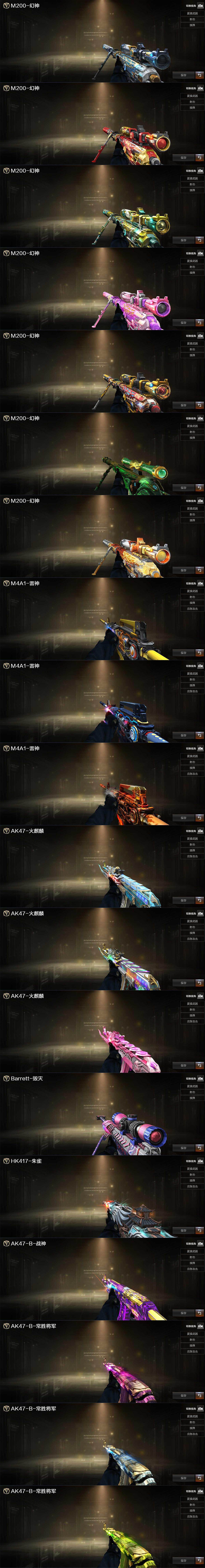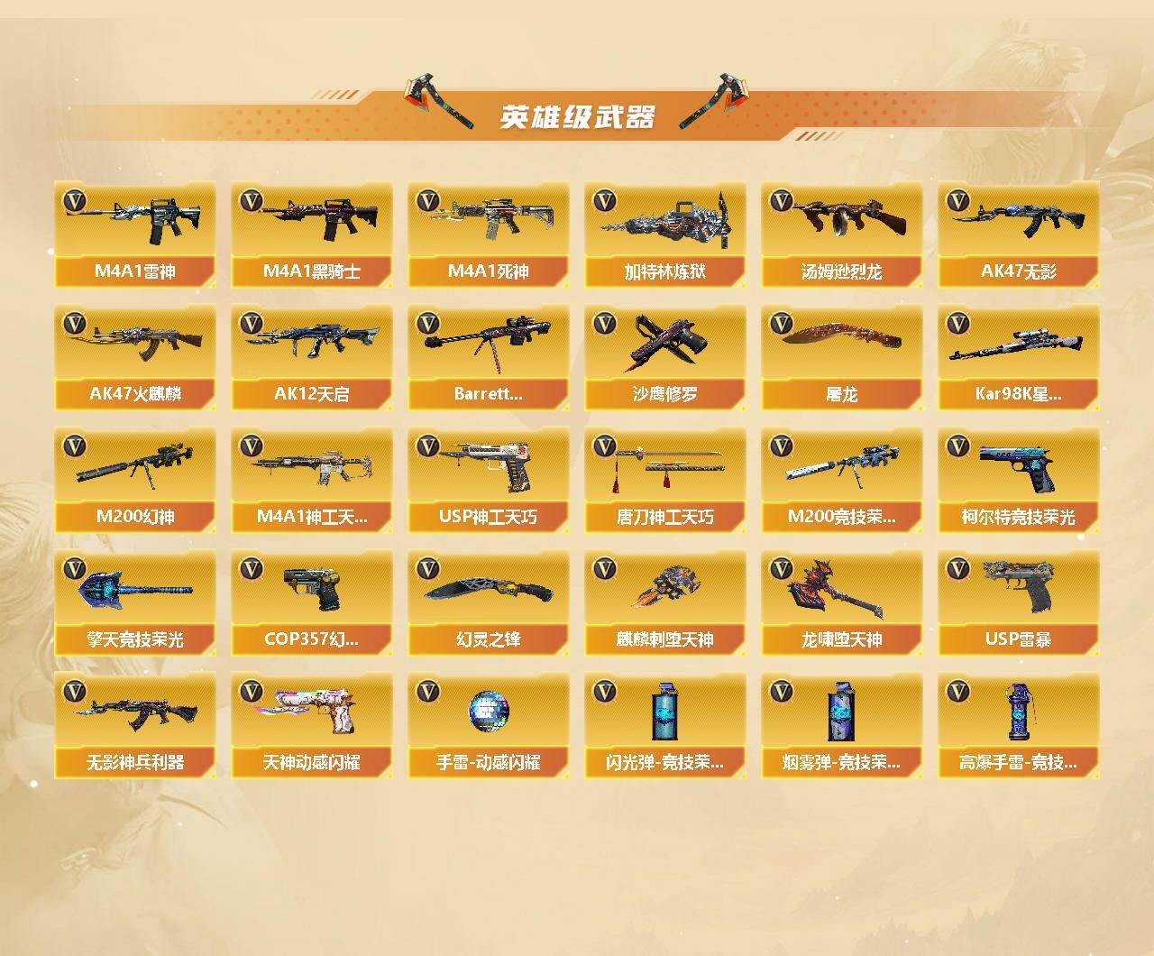 【热门武器】:传说夜影,传说圣灵,传说光耀,M200-幻神,Scar Light-白虎,HK417-朱雀,Kar98K-星神,M200-竞技荣光,斯泰尔-蝴蝶,USP-雷暴,COP 357-幻灵,金色小号,C.A.T,金刚伞,沙鹰-修罗,沙鹰-修罗,沙鹰-修罗,沙鹰-修罗,M4A1-黑骑士,M4A1-黑骑士,M4A1-黑骑士,汤姆逊-烈龙,汤姆逊-烈龙,汤姆逊-烈龙,汤姆逊-烈龙,汤姆逊-烈龙,加特林-炼狱