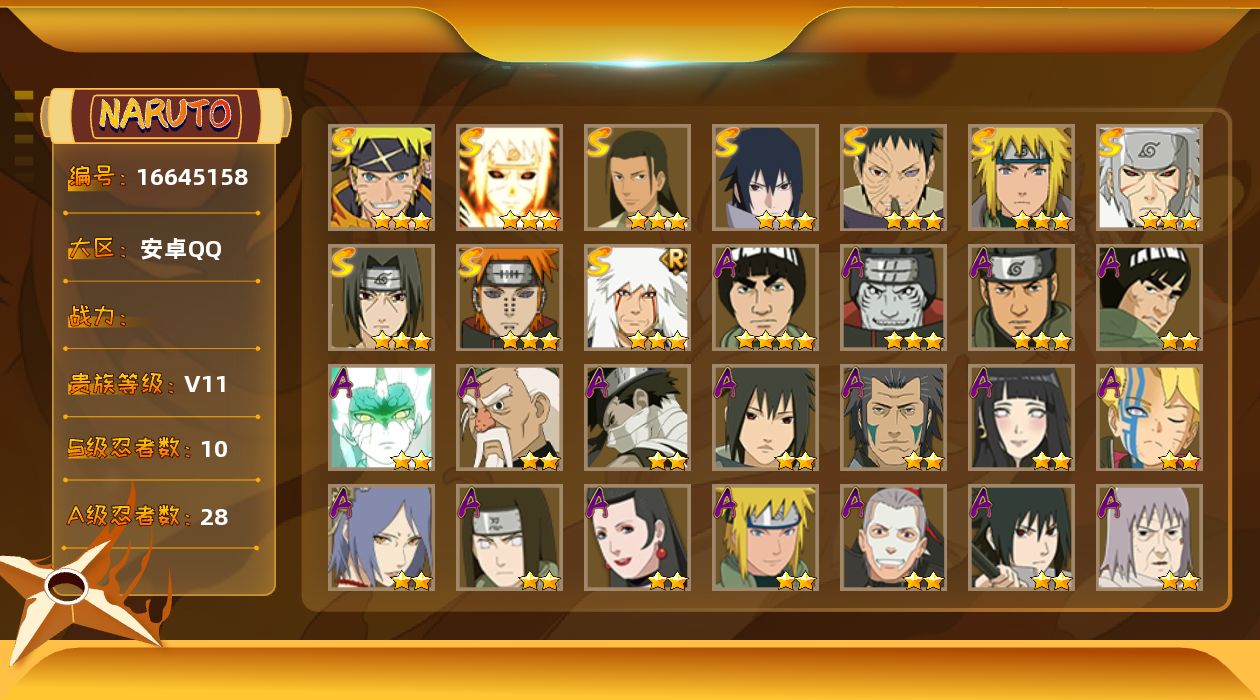 [16645158]VIP11,664W战力,S忍10个,A忍28个。须佐卡卡西92片,秽土初代71片,须佐止水75片。
