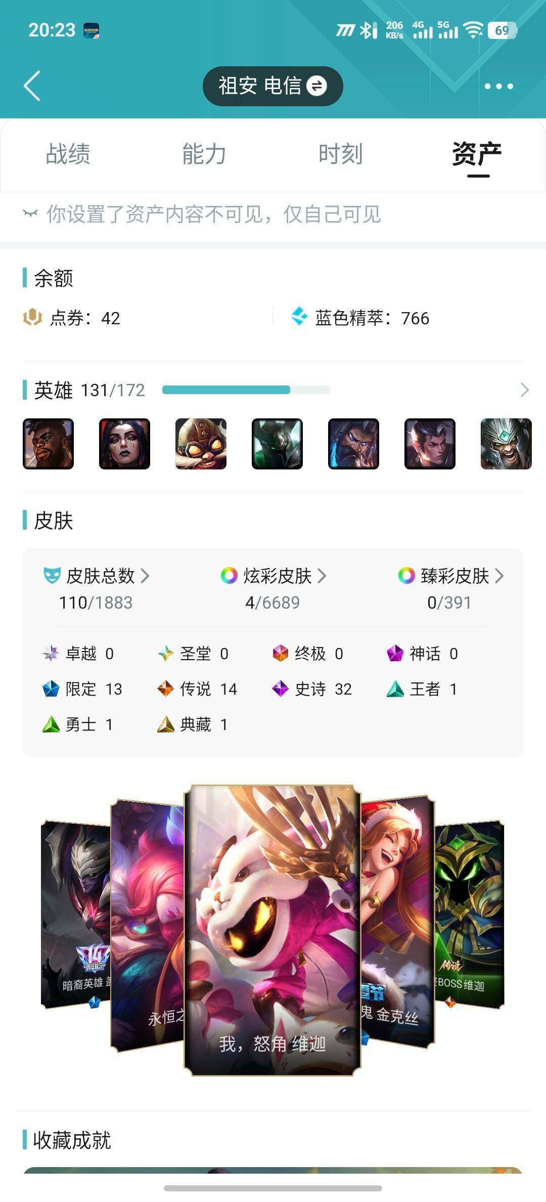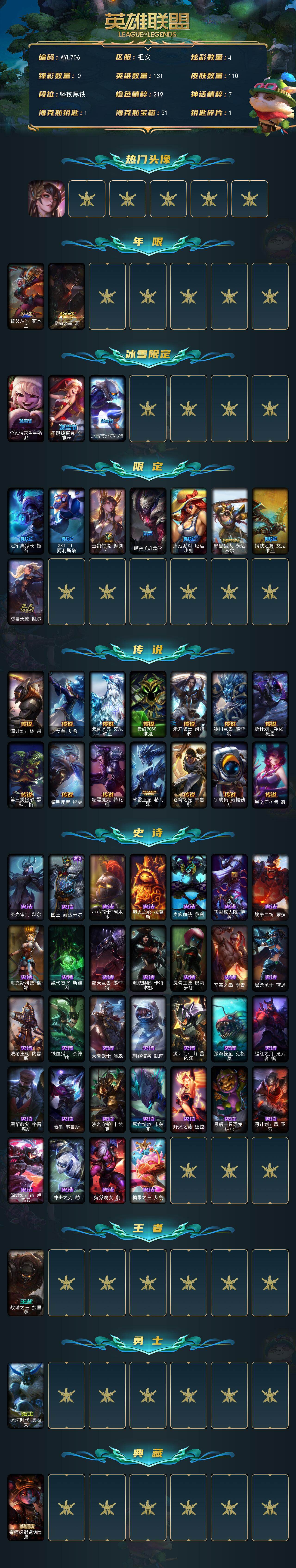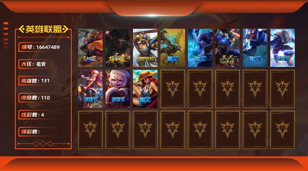 [16647489]【店主推荐捡漏号】未定级段位-131英雄-110皮肤-4炫彩-0终极-0神话-13限定-14传说-32史诗
