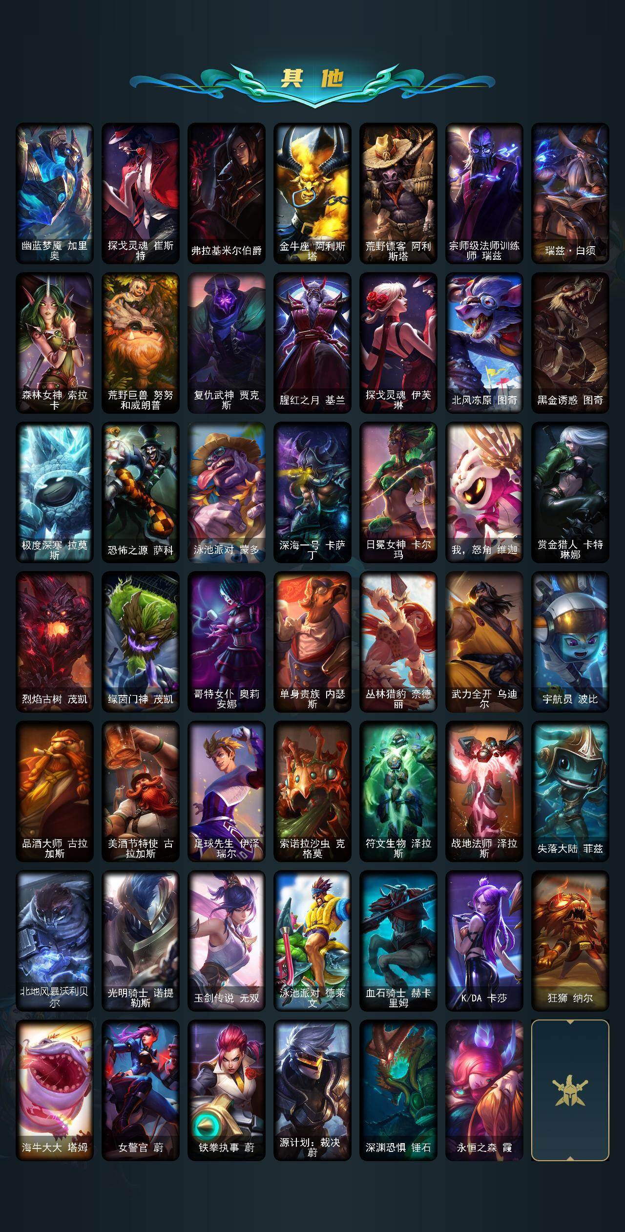 【其他皮肤1】:幽蓝梦魇加里奥,探戈灵魂崔斯特,弗拉基米尔伯爵,金牛座阿利斯塔,荒野镖客阿利斯塔,宗师级法师训练师瑞兹,瑞兹白须,森林女神索拉卡,荒野巨兽努努和威朗普,复仇武神贾克斯,腥红之月基兰,探戈灵魂伊芙琳,北风冻原图奇,黑金诱惑图奇,极度深寒拉莫斯,恐怖之源萨科,泳池派对蒙多,深海一号卡萨丁,日冕女神卡尔玛,我怒角维迦,赏金猎人卡特琳娜,烈焰古树茂凯,绿茵门神茂凯,哥特女仆奥莉安娜,单身贵族内瑟斯,丛林猎豹奈德丽,武力全开乌迪尔,宇航员波比,品酒大师古拉加斯,美酒节特使古拉加斯,足球先生伊泽瑞尔,索诺拉沙虫克格莫,符文生物泽拉斯,战地法师泽拉斯,失落大陆菲兹,北地风暴沃利贝尔,光明骑士诺提勒斯,玉剑传说无双,泳池派对德莱文,血石骑士赫卡里姆,KDA卡莎,狂狮纳尔,海牛大大塔姆,女警官蔚,铁拳执事蔚,源计划裁决蔚,深渊恐惧锤石,永恒之森霞
