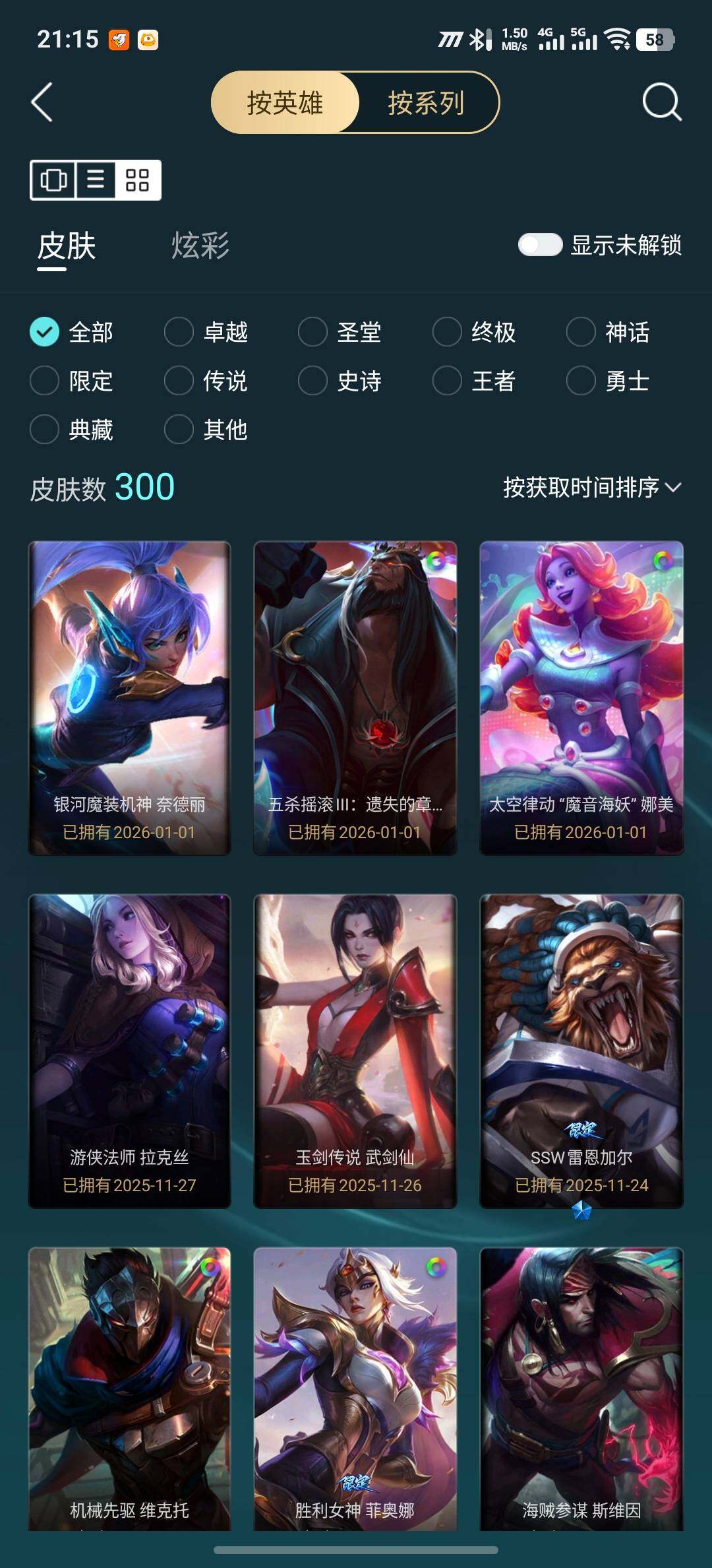 【神话皮肤】:十五周年纪念希维尔,殿堂传奇薇恩,灰烬征服者潘森,水晶圣骑塔莉娅,灰烬杀手塞拉斯,海克斯科技安妮,海克斯科技吉格斯,海克斯科技雷克顿,零之枪骑赫卡里姆,至臻飞升战神潘森,至臻剪纸仙灵希维尔,至臻KDA阿卡丽,至臻KDAALLOUT卡莎,至臻KDA卡莎,至臻魔女婕拉,至臻神凰行者烈羽焰凰霞,至臻星之守护者辛德拉,至臻源计划正义艾瑞莉娅