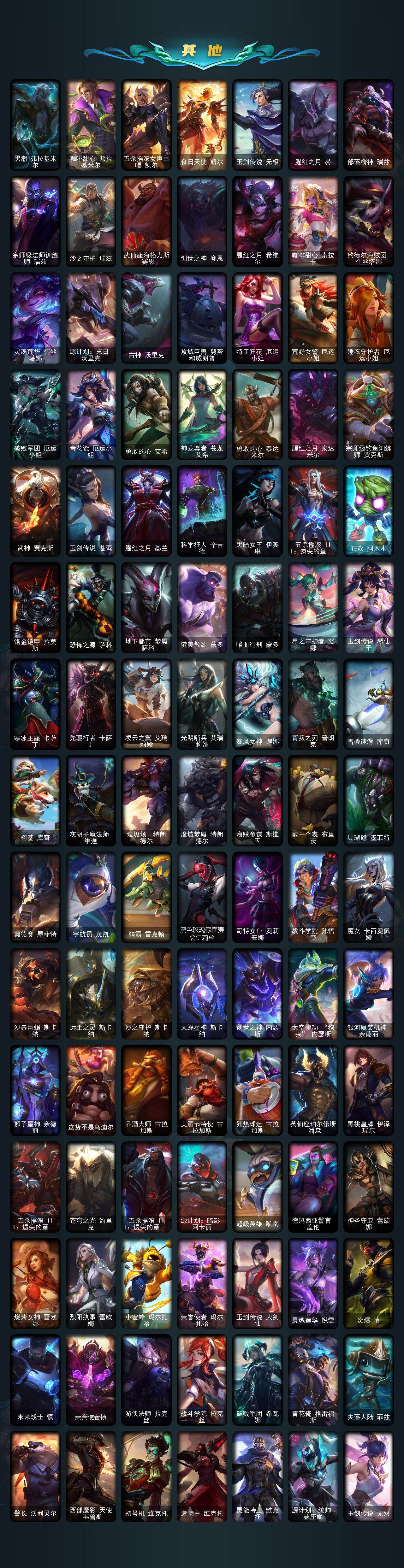 【传说皮肤】:地狱之门卫士加里奥,魔幻卡牌崔斯特,大天使长米迦勒凯尔,恶魔男爵瑞兹,黎明使者索拉卡,合金巨兽努努和威朗普,幻灵战斗队长厄运小姐,源计划联合艾希,绅士科加斯,战地巨兽科加斯,双重冰晶艾尼维亚,女主播迦娜,战斗学院凯特琳,陆地王者4WD布里茨,丧尸布兰德,神龙尊者圣龙李青,银河魔装机神兰博,战斗学院伊泽瑞尔,枯萎之壤泽拉斯,冰霜亚龙希瓦娜,焰尾妖狐阿狸,偶像歌手阿狸,符文战熊沃利贝尔,至高天韦鲁斯,宇航员诺提勒斯,女校长菲奥娜,灌篮高手德莱厄斯,星之守护者金克丝,西部魔影卢锡安,星之守护者霞,黎明使者永