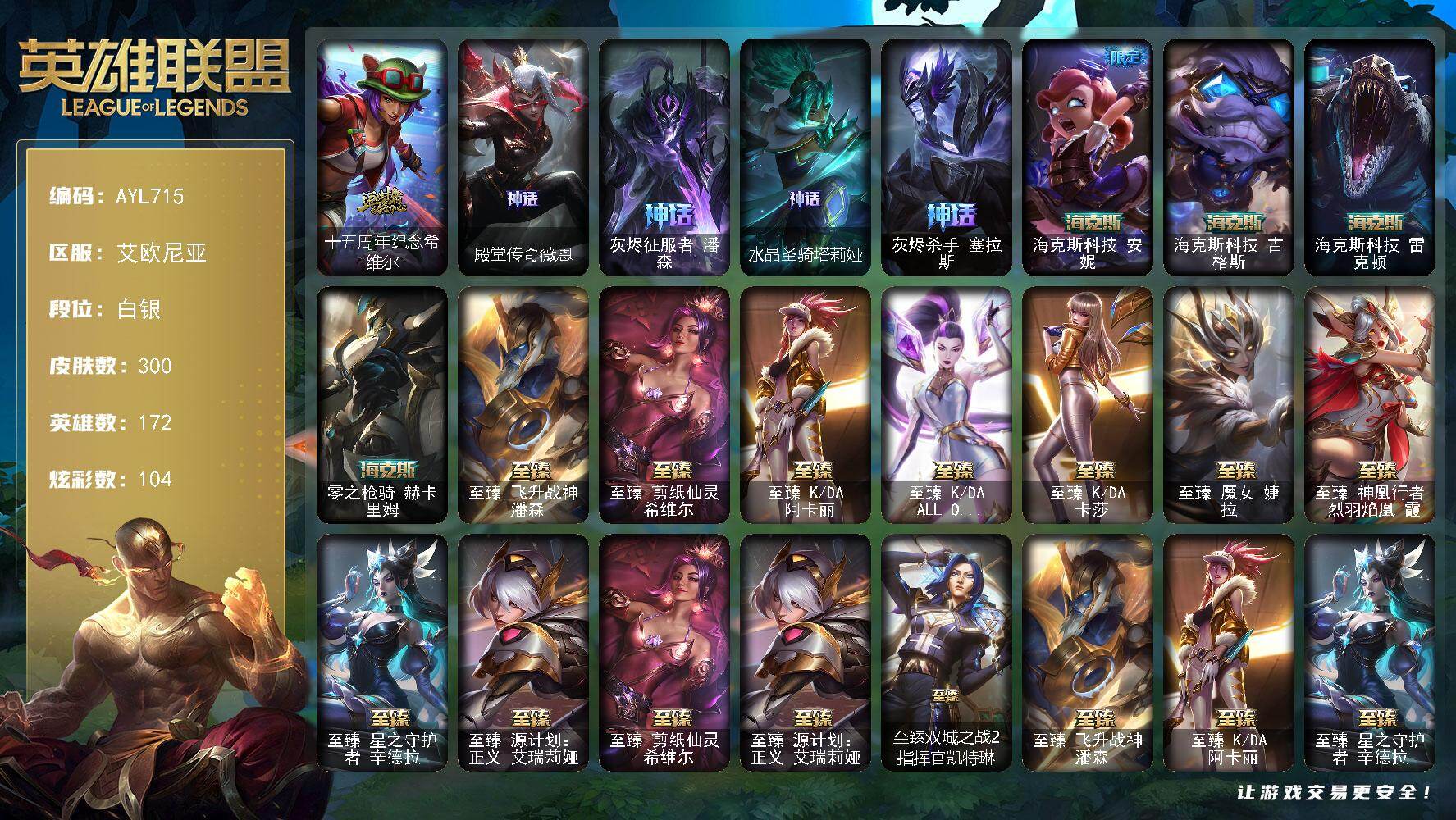 [16647527]【店主推荐捡漏号】白银段位-172英雄-300皮肤-104炫彩-0终极-19神话-35限定-31传说-56史诗 【神话皮肤】:十五周年纪念希维尔,殿堂传奇薇恩,灰烬征服者潘森,水晶圣骑塔莉娅,灰烬杀手塞拉斯,海克斯科技安妮,海克斯科技吉格斯,海克斯科技雷克顿,零之枪骑赫卡里姆,至臻飞升战神潘森,至臻剪纸仙灵希维尔,至臻KDA阿卡丽,至臻KDAALLOUT卡莎,至臻KDA卡莎,至臻魔女婕拉,至臻神凰行者烈羽焰凰霞,至臻星之守护者辛德拉,至臻源计划正义艾瑞莉娅 【珍稀头像】:星守阿狸头像 【至臻皮肤】:至臻剪纸仙灵希维尔,至臻源计划正义艾瑞莉娅,至臻双城之战2指挥官凯特琳,至臻飞升战神潘森,至臻KDA阿卡丽,至臻星之守护者辛德拉,至臻魔女婕拉,至臻KDA卡莎,至臻KDAALLOUT卡莎,至臻神凰行者烈羽焰凰霞 【臻彩皮肤】:无畏骑士瑟庄妮赤子初心,星之守护者金克丝黑洞,幻灵战斗队长厄运小姐勇气赞歌 【年限皮肤】:司马懿仲达,福牛守护者阿利斯塔,天龙之子斯莫德 【海克斯皮肤】:海克斯科技安妮,海克斯科技雷克顿,海克斯科技吉格斯,零之枪骑赫卡里姆 【冰雪限定】:幸福女神乐芙兰,圣诞糖果棒厄运小姐,狂心冰王图奇,阿木木“主人不要我了”,英勇玩具兵普朗克,雪默丁格,魄罗骑士瑟庄妮 【限定皮肤】:冠军之刃锐雯2016,SSW图奇,SSW泰隆,SSW雷恩加尔,EDG格雷福斯,EDG佛耶戈,EDG佐伊,EDG厄斐琉斯,EDG悠米,电玩女神厄运小姐,玉剑传说神机花火,胜利巨口克格莫,胜利女神娑娜,胜利剑圣易,胜利之运崔斯特,胜利女神菲奥娜,南瓜头费德提克,无头骑士赫卡里姆,泳池派对雷克顿,蓝色忧郁崔斯特,密林猎手提莫,暗影沃里克,波比的巧克力工坊,都铎王朝图奇,海之歌艾希 【传说皮肤】:地狱之门卫士加里奥,魔幻卡牌崔斯特,大天使长米迦勒凯尔,恶魔男爵瑞兹,黎明使者索拉卡,合金巨兽努努和威朗普,幻灵战斗队长厄运小姐,源计划联合艾希,绅士科加斯,战地巨兽科加斯,双重冰晶艾尼维亚,女主播迦娜,战斗学院凯特琳,陆地王者4WD布里茨,丧尸布兰德,神龙尊者圣龙李青,银河魔装机神兰博,战斗学院伊泽瑞尔,枯萎之壤泽拉斯,冰霜亚龙希瓦娜,焰尾妖狐阿狸,偶像歌手阿狸,符文战熊沃利贝尔,至高天韦鲁斯,宇航员诺提勒斯,女校长菲奥娜,灌篮高手德莱厄斯,星之守护者金克丝,西部魔影卢锡安,星之守护者霞,黎明使者永