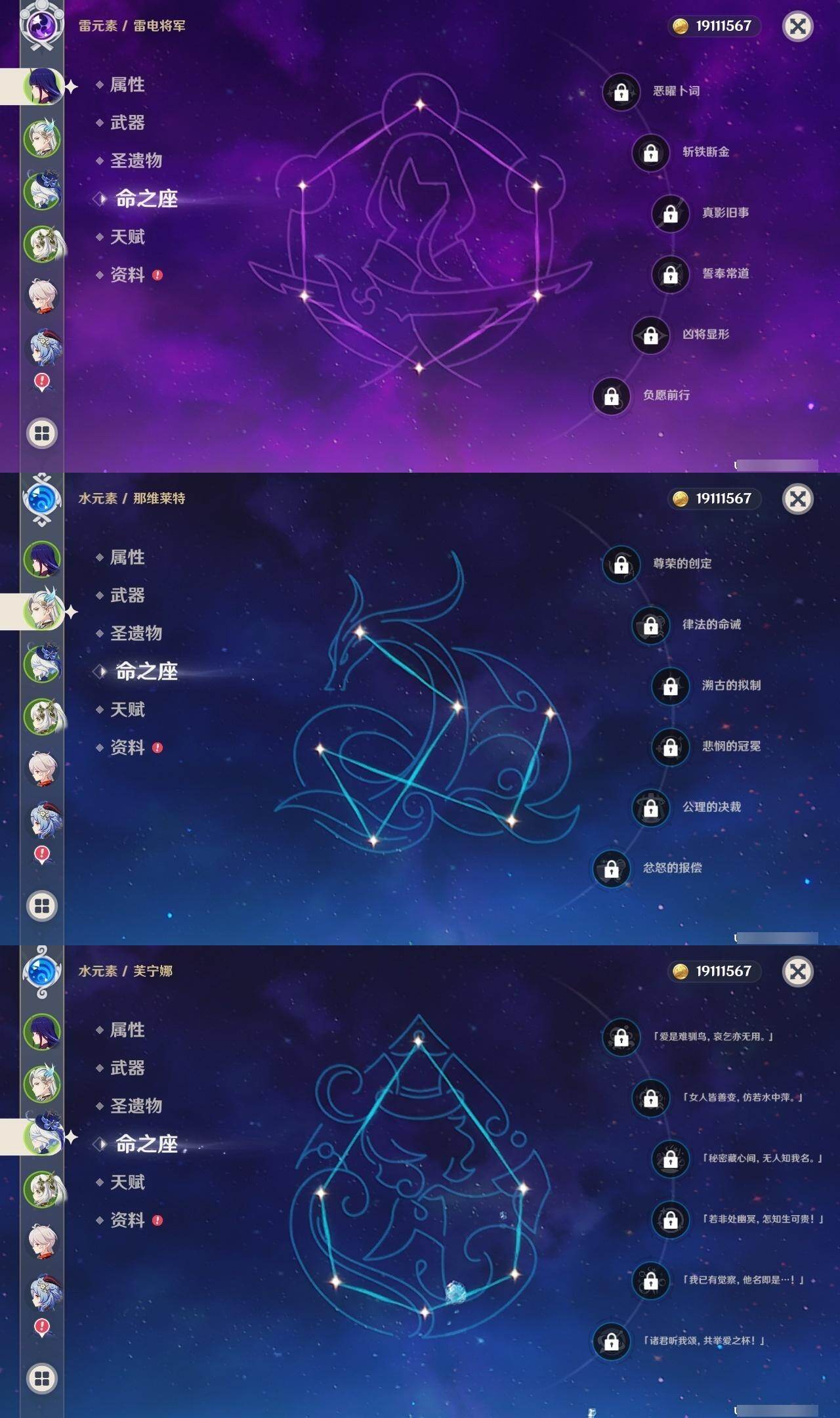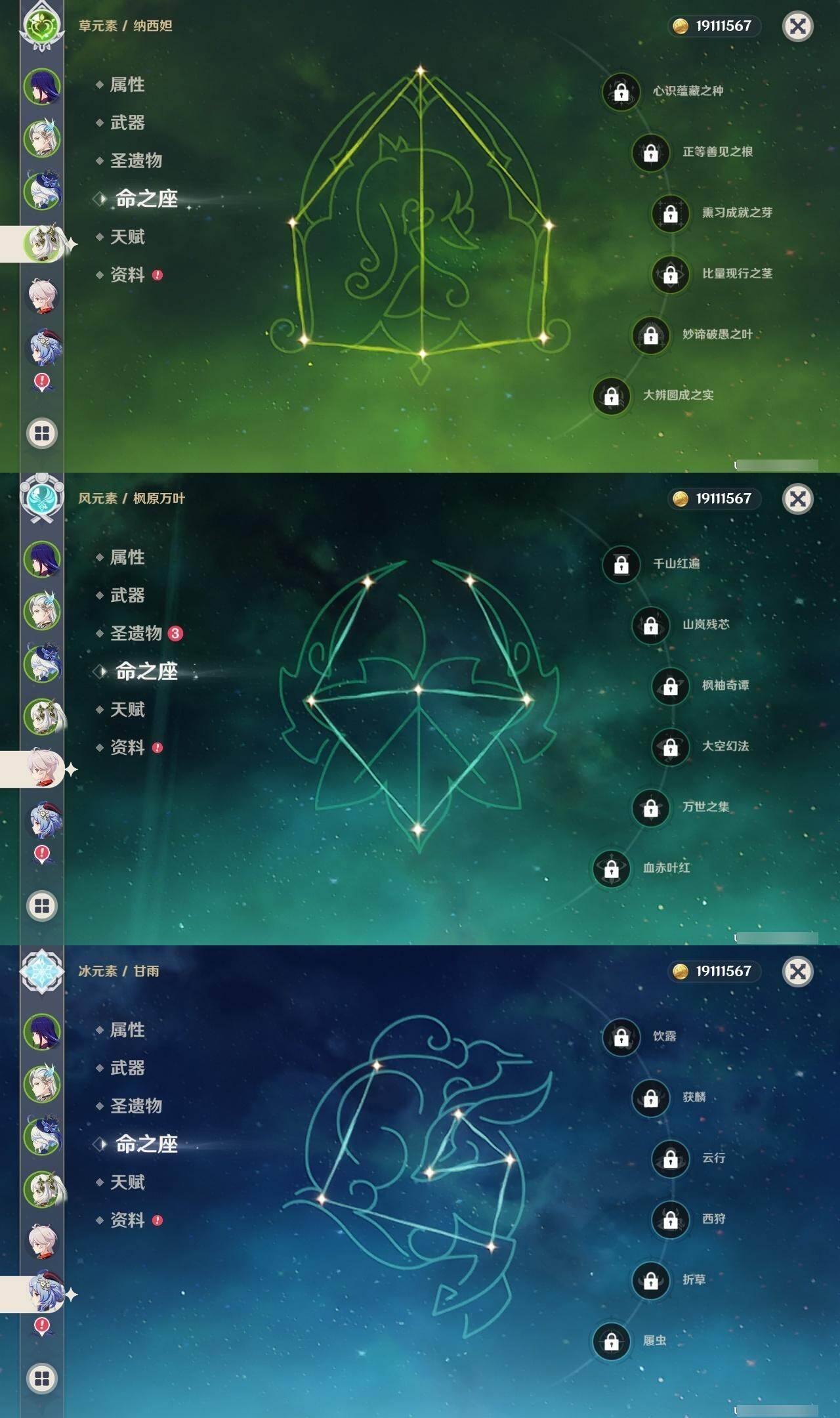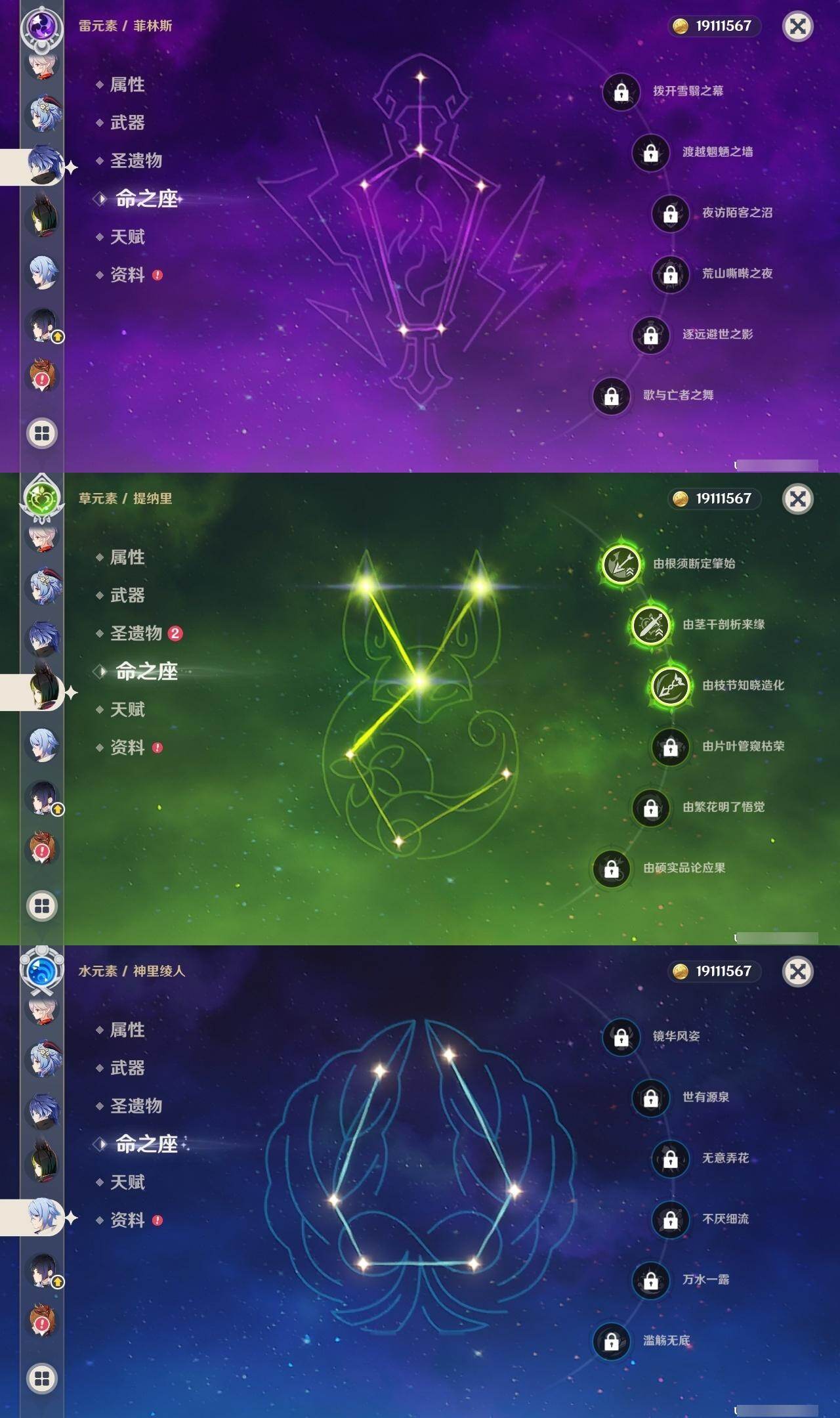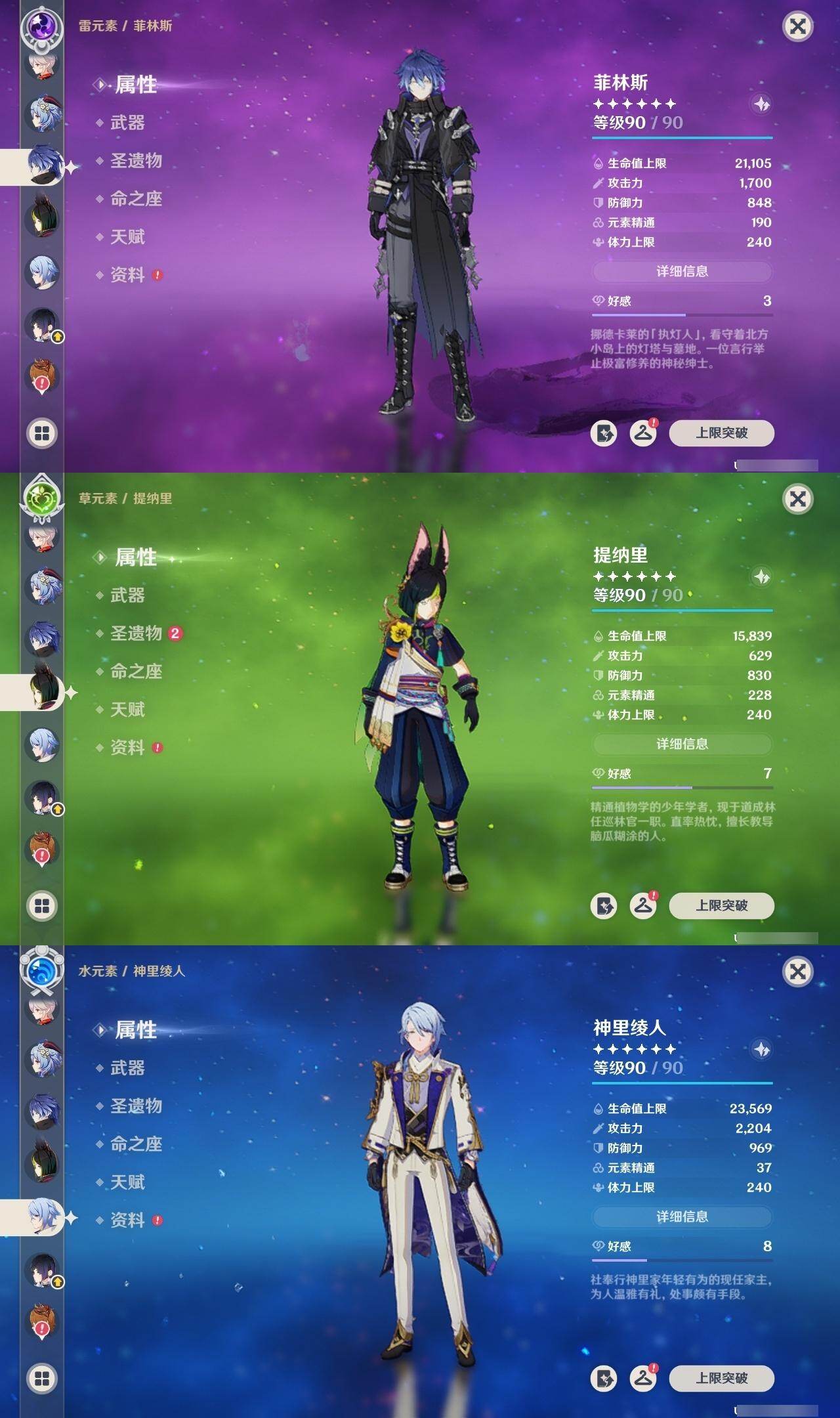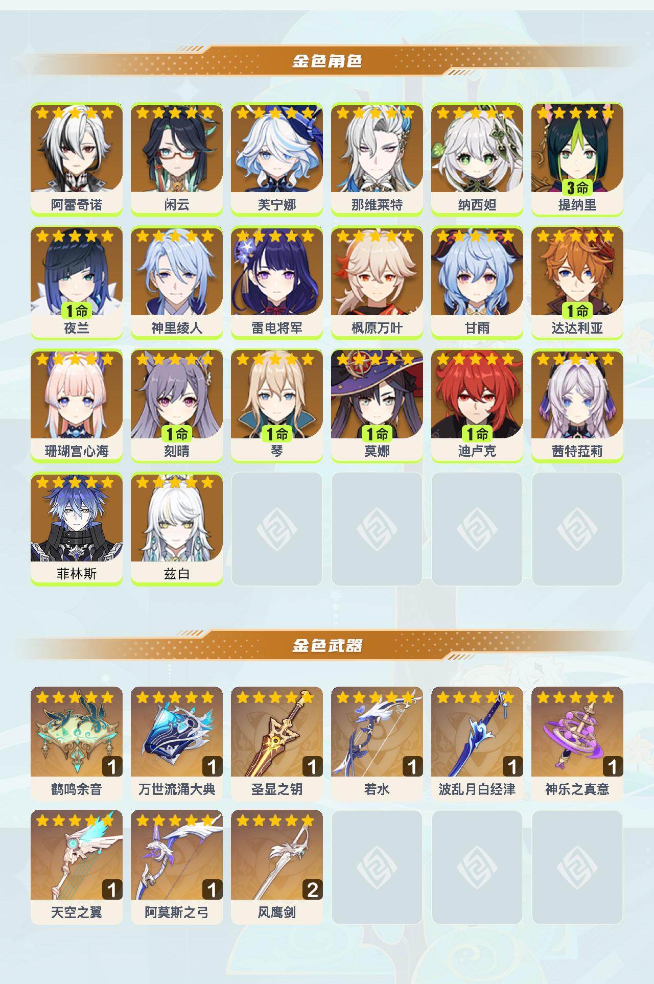 0命阿蕾奇诺,0命闲云,0命芙宁娜,0命那维莱特,0命纳西妲,3命提纳里,1命夜兰,0命神里绫人,0命雷电将军,0命枫原万叶,0命甘雨,1命达达利亚,0命珊瑚宫心海,1命刻晴,1命琴,1命莫娜,1命迪卢克,0命茜特菈莉,0命菲林斯,0命兹白,精1鹤鸣余音,精1万世流涌大典,精1圣显之钥,精1若水,精1波乱月白经津,精1神乐之真意,精1天空之翼,精1阿莫斯之弓,精2风鹰剑