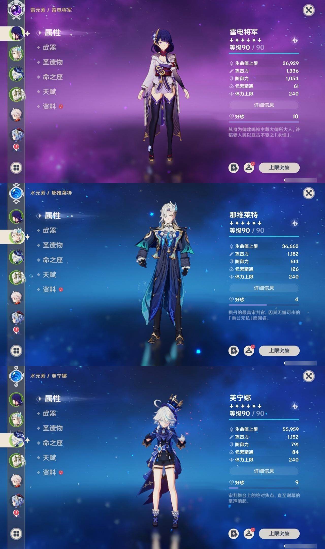 雷电将军,枫原万叶,甘雨,达达利亚,珊瑚宫心海,迪卢克,琴,莫娜,刻晴