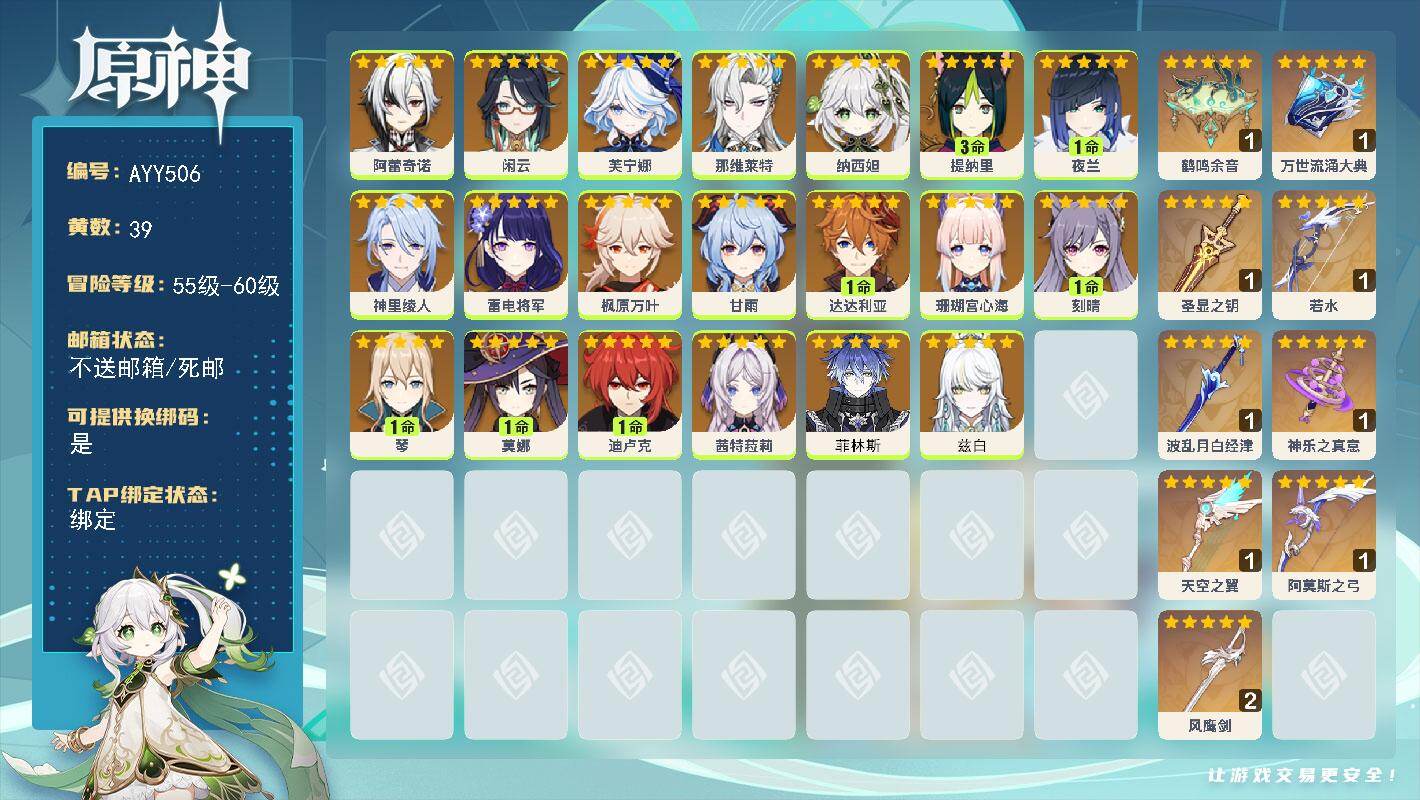 [16647558]59级/39黄/男主/20个五星角色/9个五星武器 0命阿蕾奇诺,0命闲云,0命芙宁娜,0命那维莱特,0命纳西妲,3命提纳里,1命夜兰,0命神里绫人,0命雷电将军,0命枫原万叶,0命甘雨,1命达达利亚,0命珊瑚宫心海,1命刻晴,1命琴,1命莫娜,1命迪卢克,0命茜特菈莉,0命菲林斯,0命兹白,精1鹤鸣余音,精1万世流涌大典,精1圣显之钥,精1若水,精1波乱月白经津,精1神乐之真意,精1天空之翼,精1阿莫斯之弓,精2风鹰剑