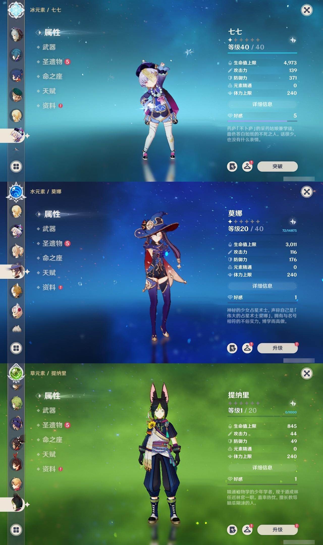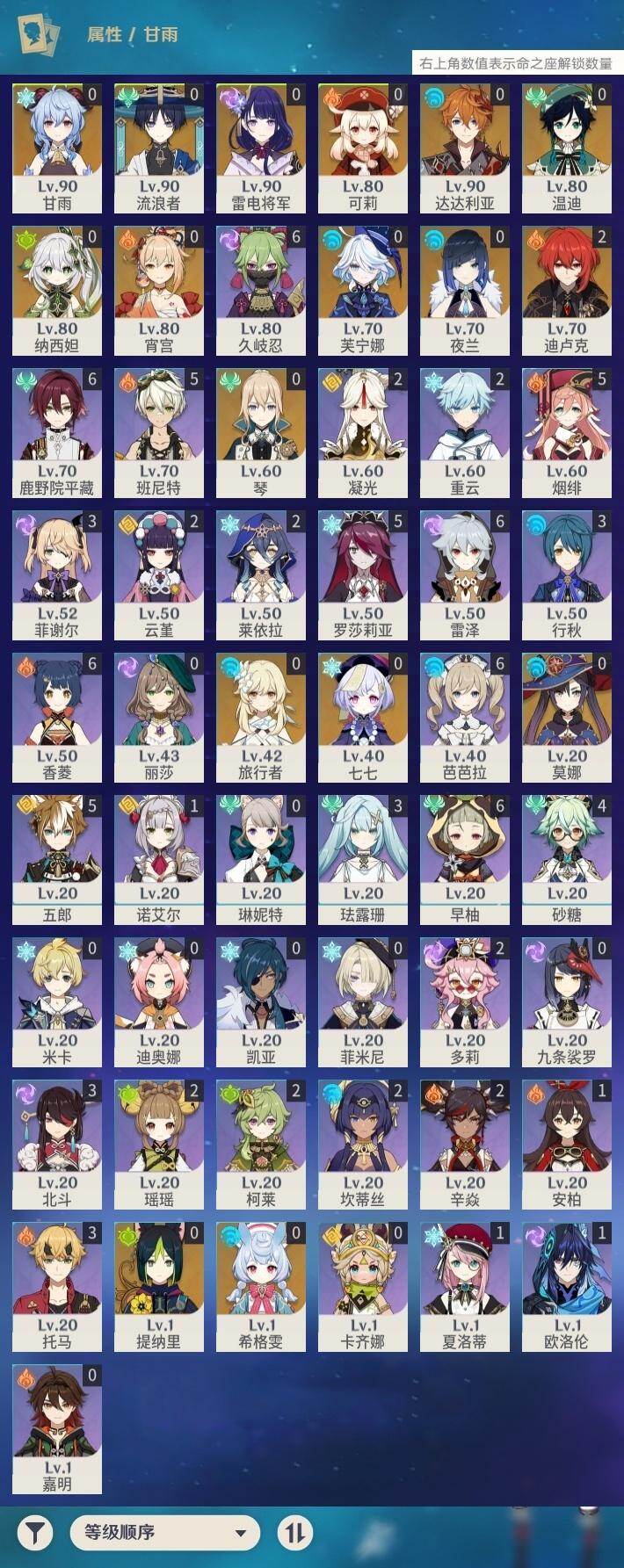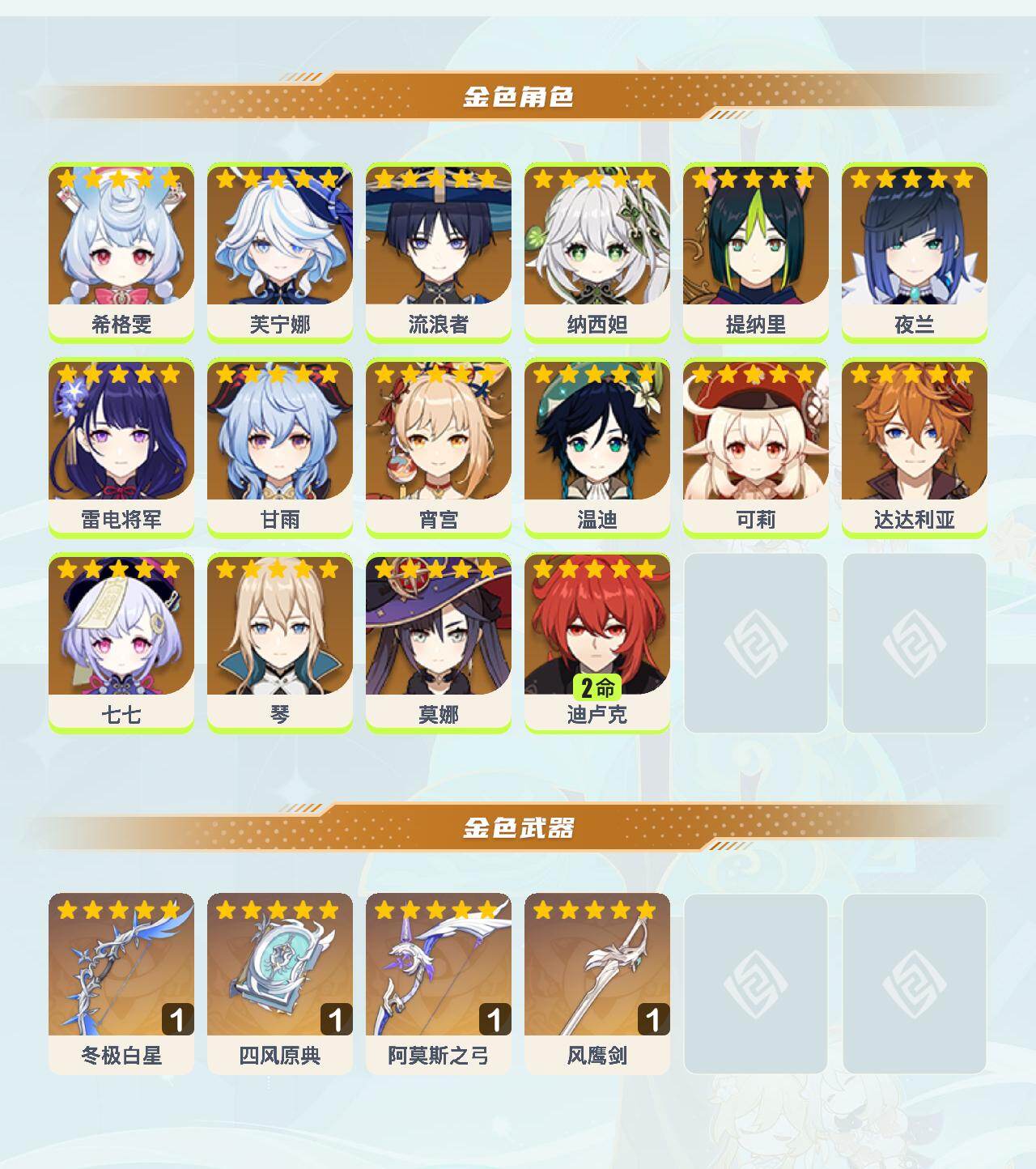 0命希格雯,0命芙宁娜,0命流浪者,0命纳西妲,0命提纳里,0命夜兰,0命雷电将军,0命甘雨,0命宵宫,0命温迪,0命可莉,0命达达利亚,0命七七,0命琴,0命莫娜,2命迪卢克,精1冬极白星,精1四风原典,精1阿莫斯之弓,精1风鹰剑
