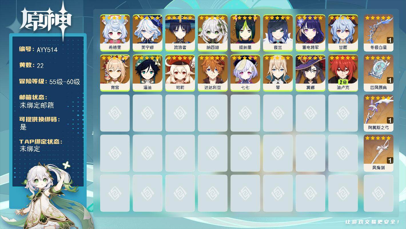 [16647604]【店主推荐捡漏号】56级/22黄/女主/16个五星角色/4个五星武器 0命希格雯,0命芙宁娜,0命流浪者,0命纳西妲,0命提纳里,0命夜兰,0命雷电将军,0命甘雨,0命宵宫,0命温迪,0命可莉,0命达达利亚,0命七七,0命琴,0命莫娜,2命迪卢克,精1冬极白星,精1四风原典,精1阿莫斯之弓,精1风鹰剑