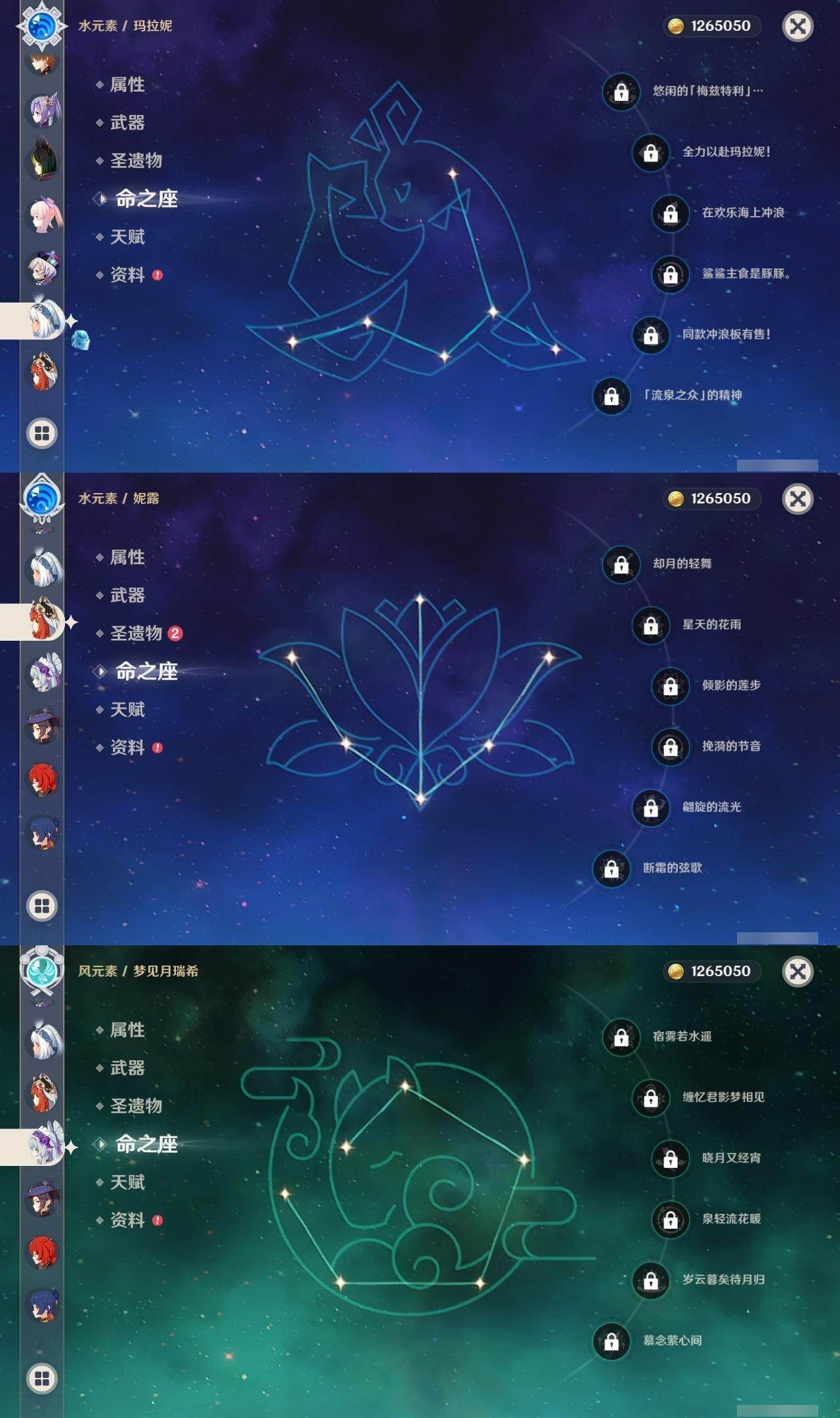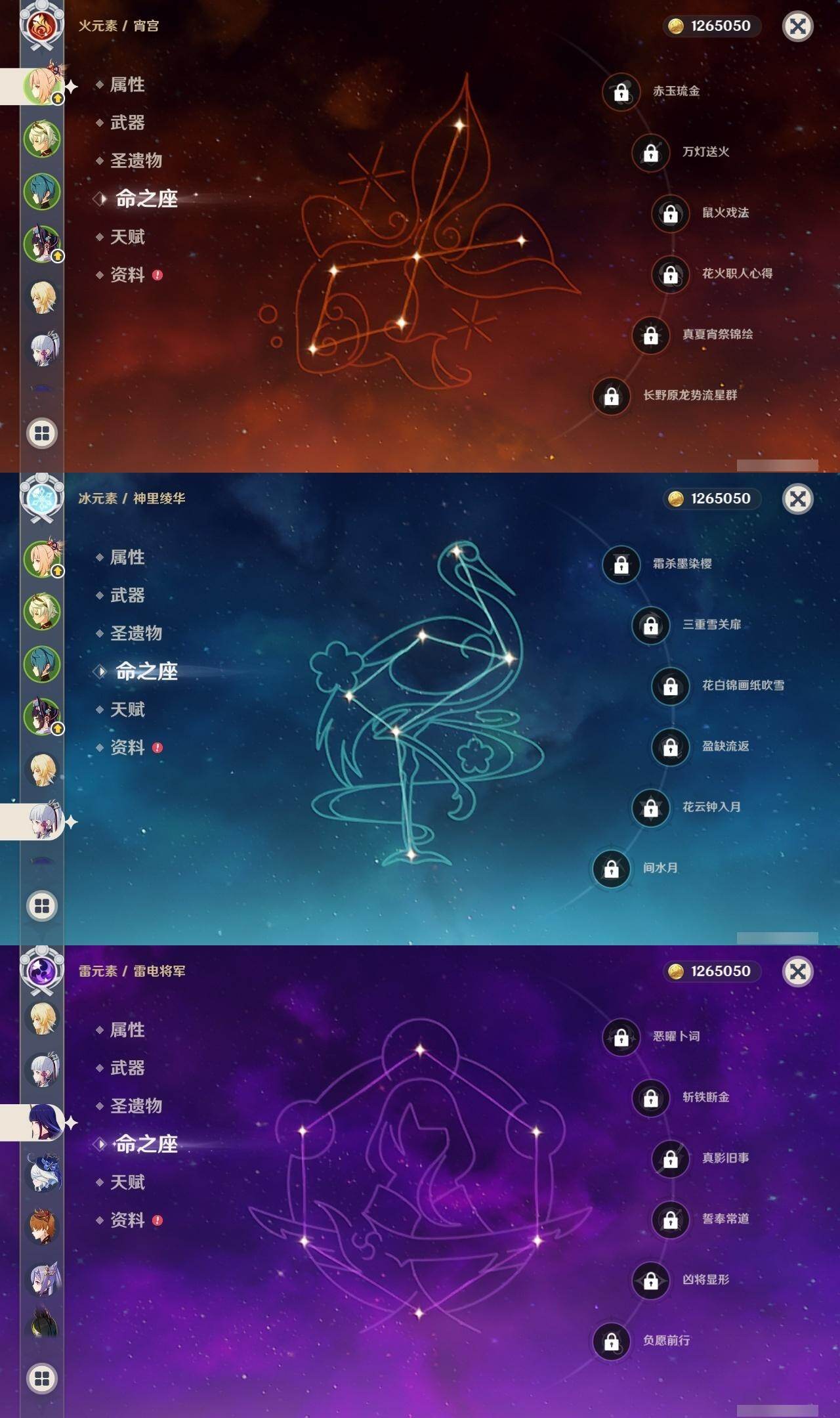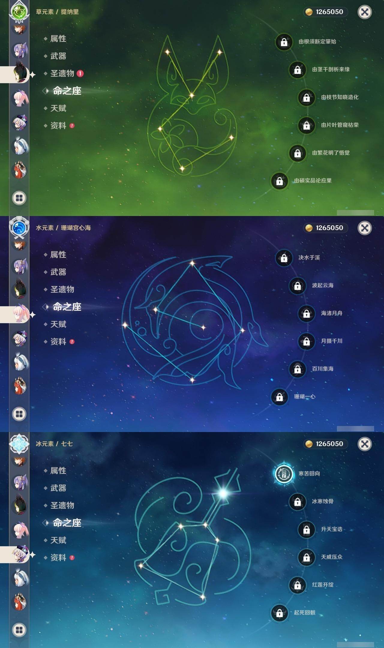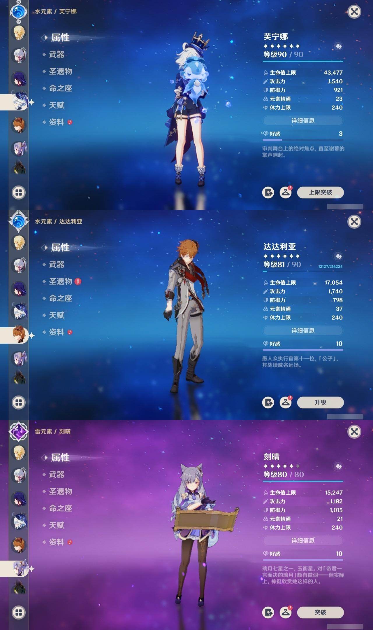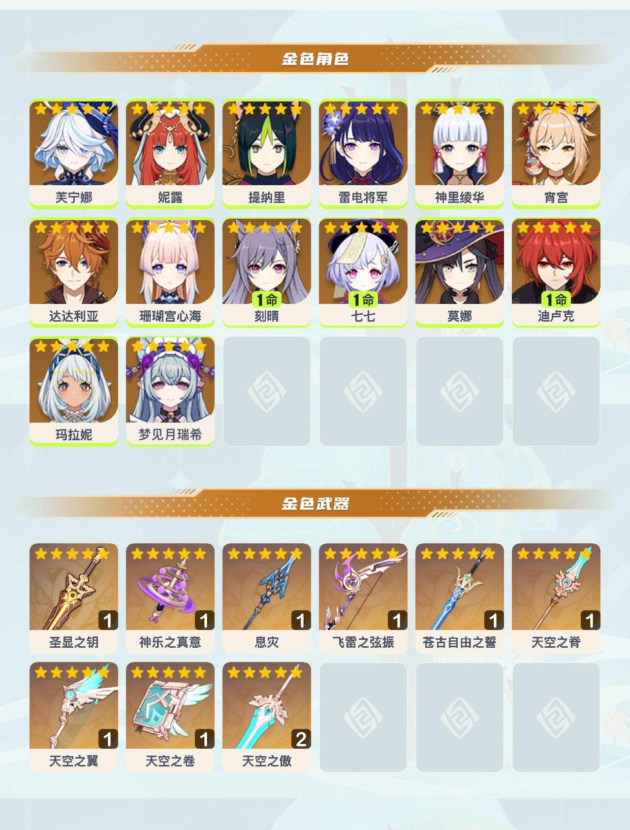 0命芙宁娜,0命妮露,0命提纳里,0命雷电将军,0命神里绫华,0命宵宫,0命达达利亚,0命珊瑚宫心海,1命刻晴,1命七七,0命莫娜,1命迪卢克,0命玛拉妮,0命梦见月瑞希,精1圣显之钥,精1神乐之真意,精1息灾,精1飞雷之弦振,精1苍古自由之誓,精1天空之脊,精1天空之翼,精1天空之卷,精2天空之傲