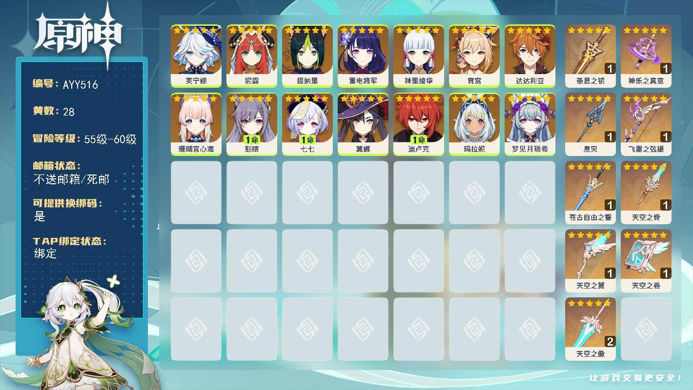 [16647617]57级/28黄/女主/14个五星角色/10个五星武器 0命芙宁娜,0命妮露,0命提纳里,0命雷电将军,0命神里绫华,0命宵宫,0命达达利亚,0命珊瑚宫心海,1命刻晴,1命七七,0命莫娜,1命迪卢克,0命玛拉妮,0命梦见月瑞希,精1圣显之钥,精1神乐之真意,精1息灾,精1飞雷之弦振,精1苍古自由之誓,精1天空之脊,精1天空之翼,精1天空之卷,精2天空之傲