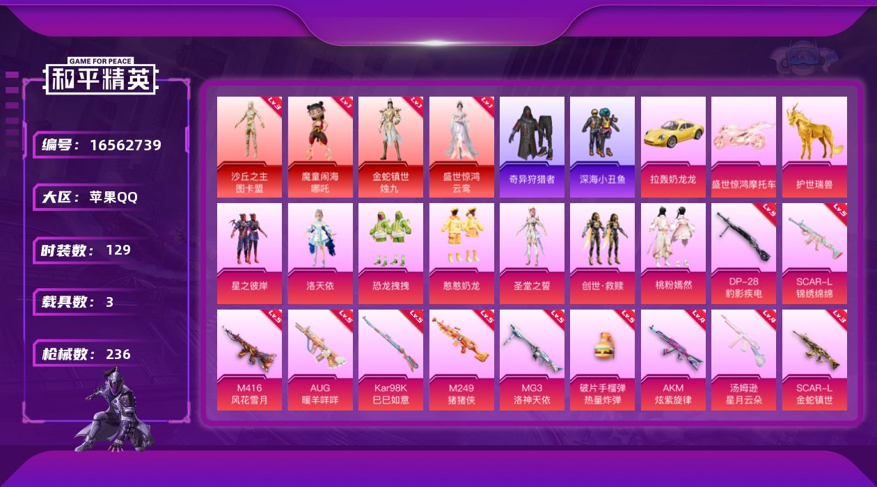 [16562739]苹果 手Q-4神装-7粉装-17特效枪-3载具-15粉色飞行器-83472热力值-10王牌印记-129套装-236枪皮