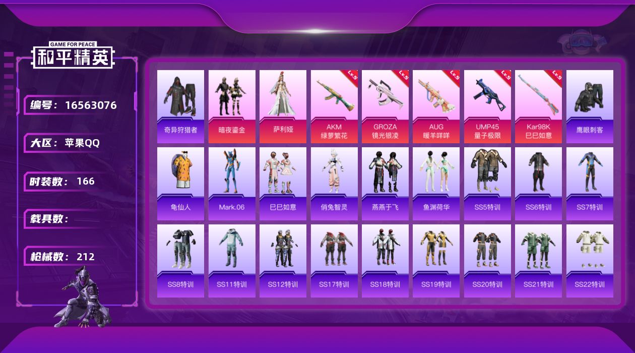[16563076]苹果 手Q-2粉装-5特效枪-0载具-0粉色飞行器-56912热力值-10王牌印记-166套装-212枪皮 【热门品类】:套装-奇异狩猎者,套装-龟仙人,角色-Mark.06 【粉色套装】:粉装-暗夜鎏金,角色-萨利娅 【粉色枪皮等级】:AKM-绿萝繁花(五级),GROZA-镜光银凌(五级),AUG-暖羊咩咩(五级),UMP45-量子极限(五级),Kar98K-巳巳如意(五级) 【粉色枪皮】:AKM-绿萝繁花,GROZA-镜光银凌,AUG-暖羊咩咩,UMP45-量子极限,Kar98K-巳巳如意 【粉色降落伞】:极限特训降落伞,幻影战神降落伞,暗星紫秘降落伞,环太平洋降落伞,海螺星光降落伞,音爆索尼克降落伞,圣堂之誓降落伞,精灵梦叶罗丽降落伞,守护天翼降落伞,忍者神龟降落伞,临安公主降落伞,异瞳寒姬降落伞 【稀有套装】:套装-龟仙人,套装-巳巳如意,角色-俏兔智灵,套装-燕燕于飞,套装-鱼渊荷华 【稀有枪皮】:AKM-2P战斗服款,AKM-夜灯,AKM-彩虹符号,AKM-破晓战魂,AKM-萌趣颜团子,AKM-萝萝小趴兔,AKM-虎虎生威,AKM-霓虹街区,AKM-龙的传人,M16A4-幻世战舞者,M16A4-甜心亚梦,M16A4-红色方程式,M16A4-蓝色火焰,SCAR-L-夜灯,SCAR-L-玉兔迎春,SCAR-L-粉锦千层,SCAR-L-红色方程式,SCAR-L-黄金龙骨,M416-糯团青竹,M416-红色方程式,M416-绯红前夜,M416-蓝色火焰,GROZA-异彩先驱,GROZA-懵萌河马,GROZA-田园牧歌,GROZA-黑色刀锋,AUG-天降萌叽,AUG-拳皇97,AUG-耀粉歌者,QBZ-彩虹符号,M762-天降萌叽,M762-彩虹符号,M762-拳皇97,M762-暗夜鎏金,M762-牛气冲天,M762-瑞龙福将,M762-绯红前夜,M762-风花雪月,Mk47-妙红点点,G36C-懵萌河马,G36C-金风玉露,AC-VAL-天降萌叽,AC-VAL-快闪甜心,AC-VAL-甜心亚梦,蜜獾-天降萌叽,蜜獾-娇憨猪猪,UZI-天降萌叽,UZI-娇憨猪猪,UZI-炫彩节奏,UZI-红色方程式,UZI-金风玉露,UMP45-涂山之恋,UMP45-生命誓言,UMP45-蓝色火焰,Vector-生命誓言,Vector-田园牧歌,Vector-黑色刀锋,汤姆逊