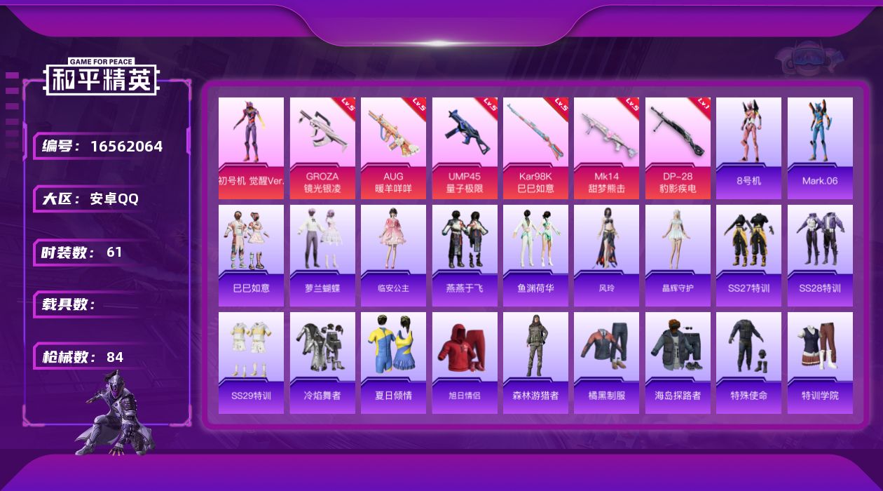 [16562064]安卓 手Q-1粉装-6特效枪-0载具-1粉色飞行器-22355热力值-3王牌印记-61套装-84枪皮 【热门品类】:套装-AG战队服,角色-8号机,角色-Mark.06 【粉色套装】:角色-初号机 觉醒Ver. 【粉色枪皮等级】:GROZA-镜光银凌(五级),AUG-暖羊咩咩(五级),UMP45-量子极限(五级),Kar98K-巳巳如意(五级),Mk14-甜梦熊击(五级),DP-28-豹影疾电(一级) 【粉色枪皮】:GROZA-镜光银凌,AUG-暖羊咩咩,UMP45-量子极限,Kar98K-巳巳如意,Mk14-甜梦熊击,DP-28-豹影疾电 【粉色飞行器】:天之羽翼飞行器 【粉色降落伞】:江南烟雨降落伞,初号机 觉醒Ver.降落伞 【稀有套装】:套装-巳巳如意,套装-萝兰蝴蝶,角色-临安公主,套装-燕燕于飞,套装-鱼渊荷华,角色-风玲,套装-晶辉守护 【稀有枪皮】:AKM-破晓战魂,SCAR-L-夜灯,SCAR-L-炫彩节奏,M416-蓝色火焰,AUG-甜蜜菠萝,AUG-耀粉歌者,AC-VAL-天降萌叽,蜜獾-天降萌叽,UZI-天降萌叽,UMP45-夜灯,P90-巳巳如意,SKS-炫彩节奏,Mini14-耀粉歌者,AMR-喜羊羊与灰太狼,SVD-冷漠罗丽,S686-巳巳如意,S12K-夜灯,DP-28-彩虹符号,短管霰弹-竹节火铳,TMP-9-江南烟雨,大砍刀-黑金刀,破片手榴弹-巳巳如意 【其他套装】:套装-SS27特训,套装-SS28特训,套装-SS29特训,套装-冷焰舞者,套装-夏日倾情,套装-旭日情侣,套装-森林游猎者,套装-橘黑制服,套装-海岛探路者,套装-特殊使命,套装-特训学院,套装-猎鹰,套装-猛禽,套装-白色伏地魔,套装-破晓战魂,套装-竞技名士,套装-红色运动,套装-绮丽涂鸦,套装-绯格组合,套装-缤纷果语,套装-蓝色运动,套装-街头潮人,套装-都市魅力,套装-长空猛禽,套装-青年教官,套装-魅力单车,套装-鹤鸣,套装-黄色伏地魔,套装-黄色运动,套装-黑色伏地魔,套装-纯真浪花,套装-热情海星,角色-8号机,角色-Mark.06,套装-湖畔霞光 【营地ID】:959791291