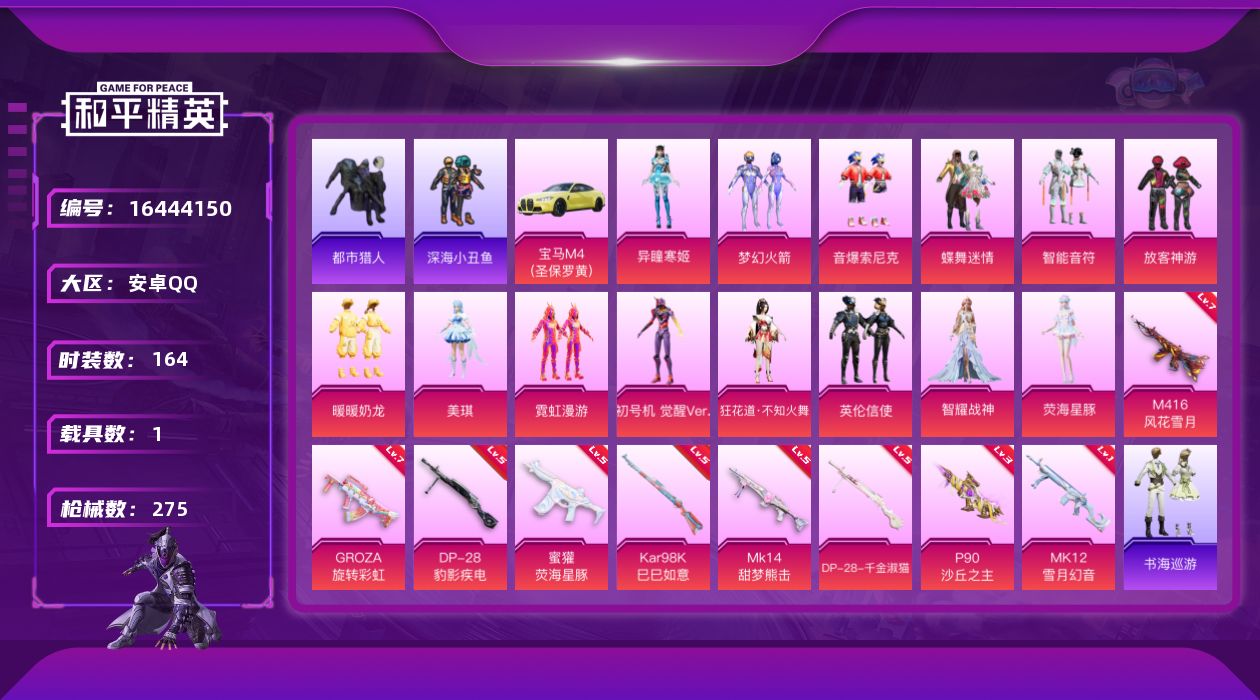 [16444150]安卓 手Q-14粉装-9特效枪-1载具-4粉色飞行器-80762热力值-11王牌印记-164套装-275枪皮