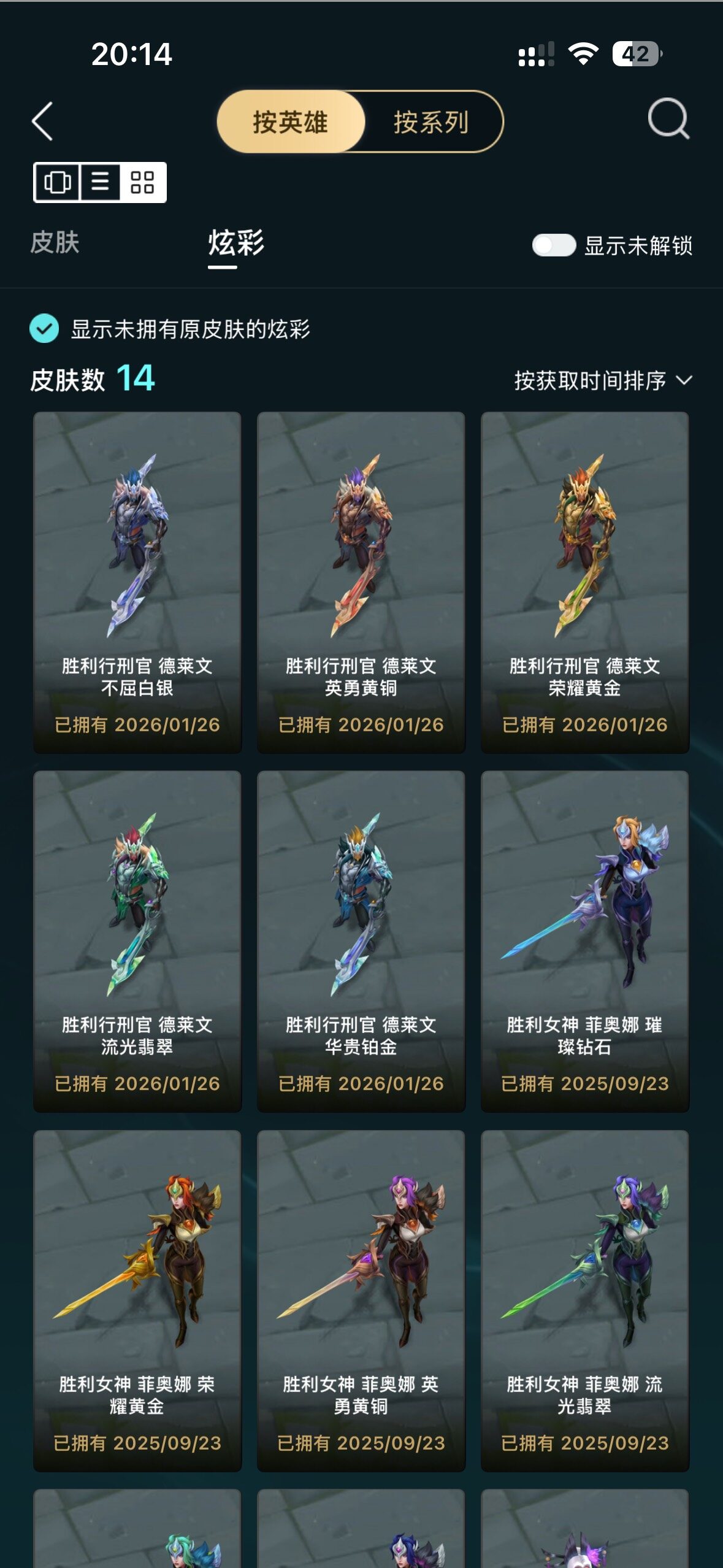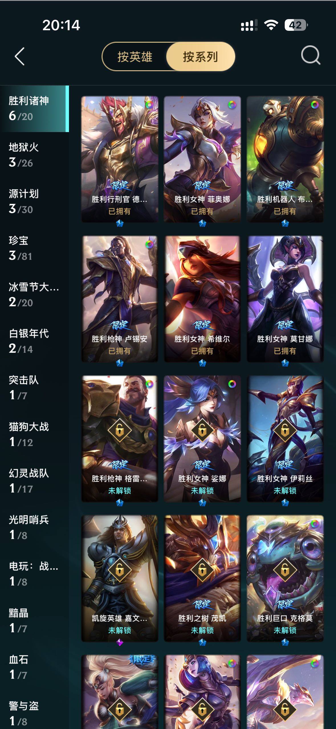 【限定皮肤】:胜利女神莫甘娜,胜利女神希维尔,胜利枪神卢锡安,胜利机器人布里茨,胜利女神菲奥娜