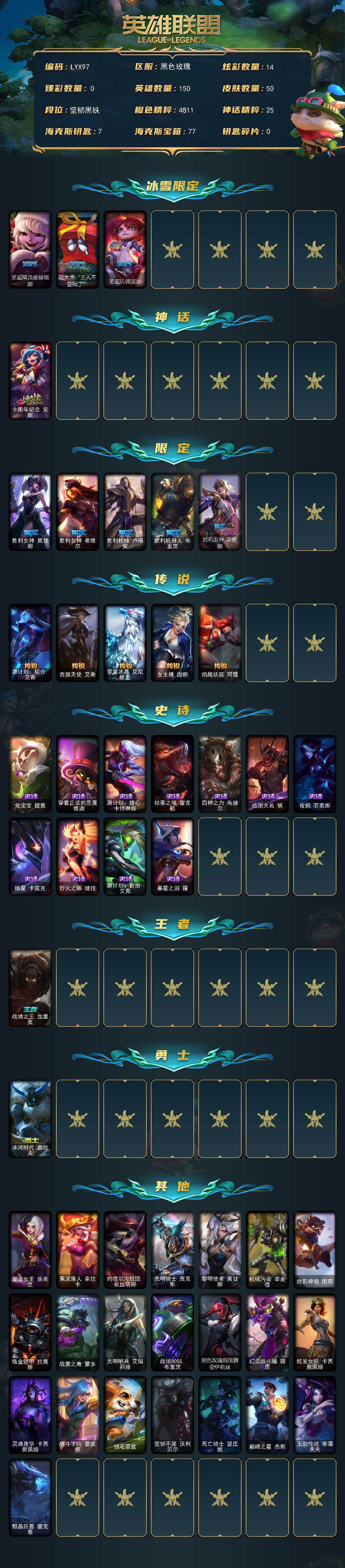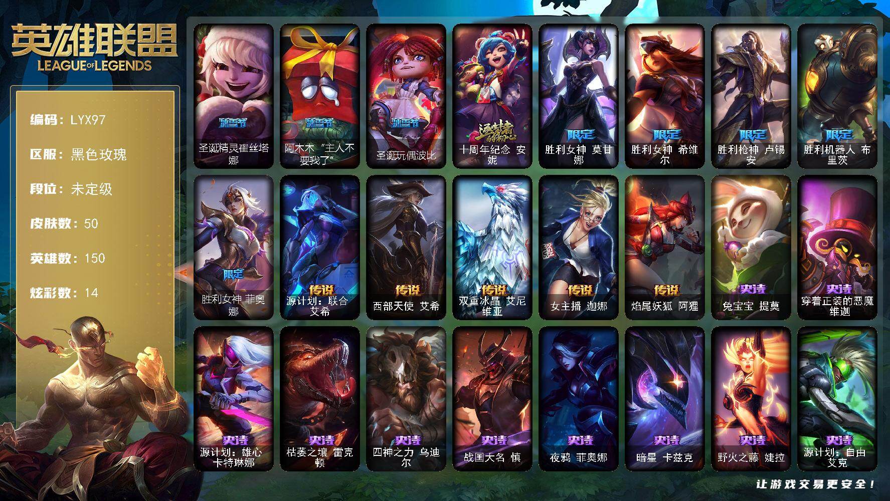 [16648690]【特价出售/店主推荐】未定级段位-150英雄-50皮肤-14炫彩-0终极-1神话-9限定-5传说-11史诗
