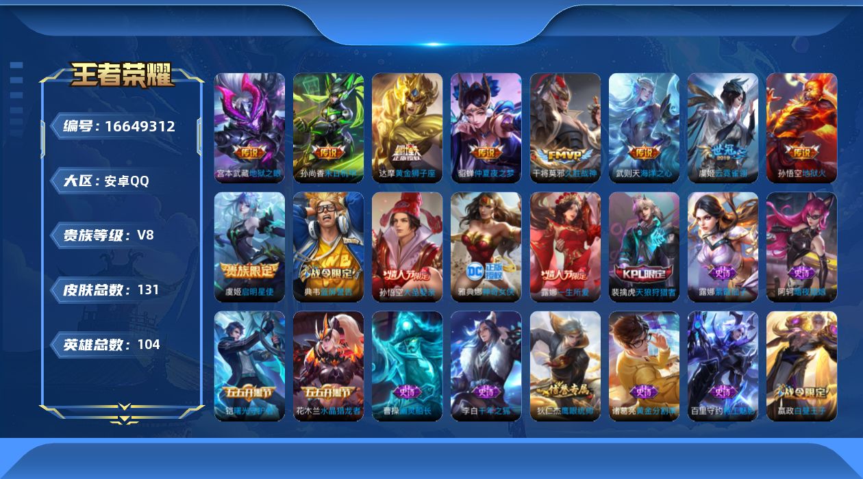 [16649312]安卓Q-V8-荣耀黄金IV段位-104英雄-131皮肤-1典藏英雄-9传说-23史诗