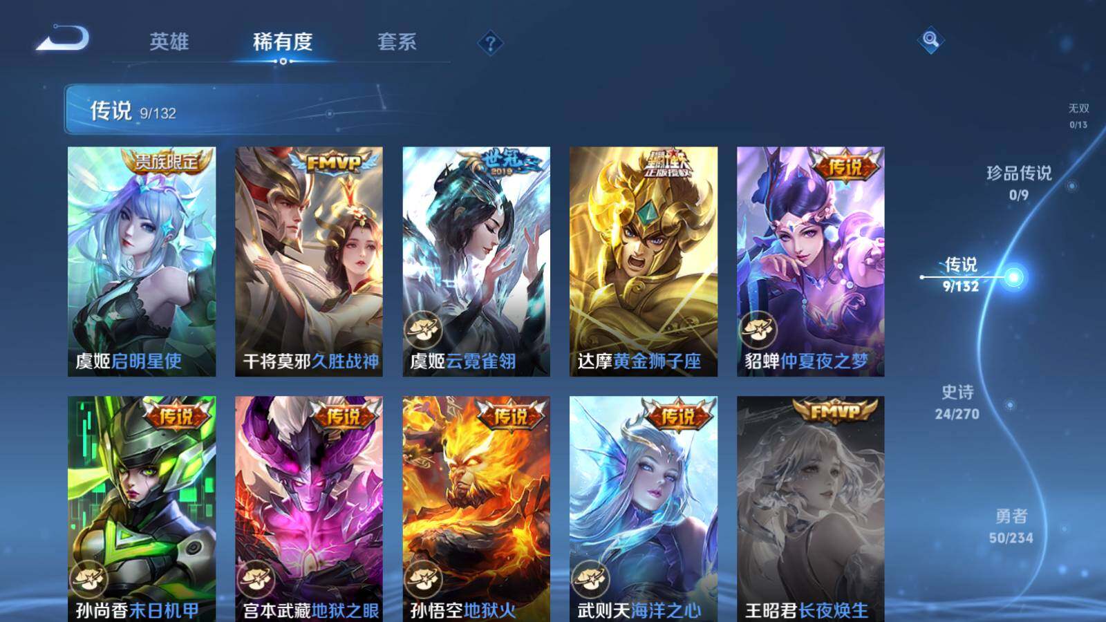 【传说皮肤】:虞姬启明星使,干将莫邪久胜战神,虞姬云霓雀翎,达摩黄金狮子座,貂蝉仲夏夜之梦,孙尚香末日机甲,宫本武藏地狱之眼,孙悟空地狱火,武则天海洋之心