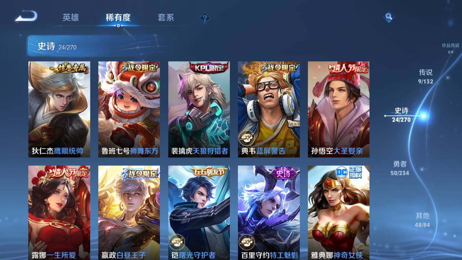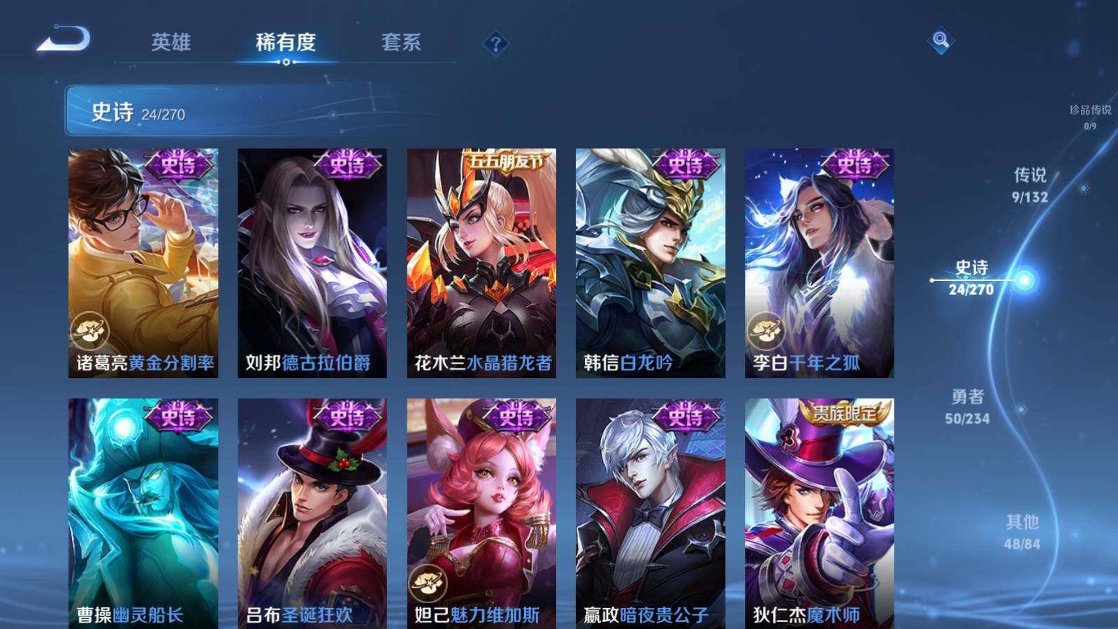 【史诗皮肤】:露娜紫霞仙子,阿轲暗夜猫娘,赵云皇家上将,貂蝉圣诞恋歌,狄仁杰魔术师,嬴政暗夜贵公子,妲己魅力维加斯,吕布圣诞狂欢,曹操幽灵船长,李白千年之狐,韩信白龙吟,花木兰水晶猎龙者,刘邦德古拉伯爵,诸葛亮黄金分割率,百里守约特工魅影,铠曙光守护者,嬴政白昼王子,露娜一生所爱,孙悟空大圣娶亲,典韦蓝屏警告,裴擒虎天狼狩猎者,鲁班七号狮舞东方,狄仁杰鹰眼统帅