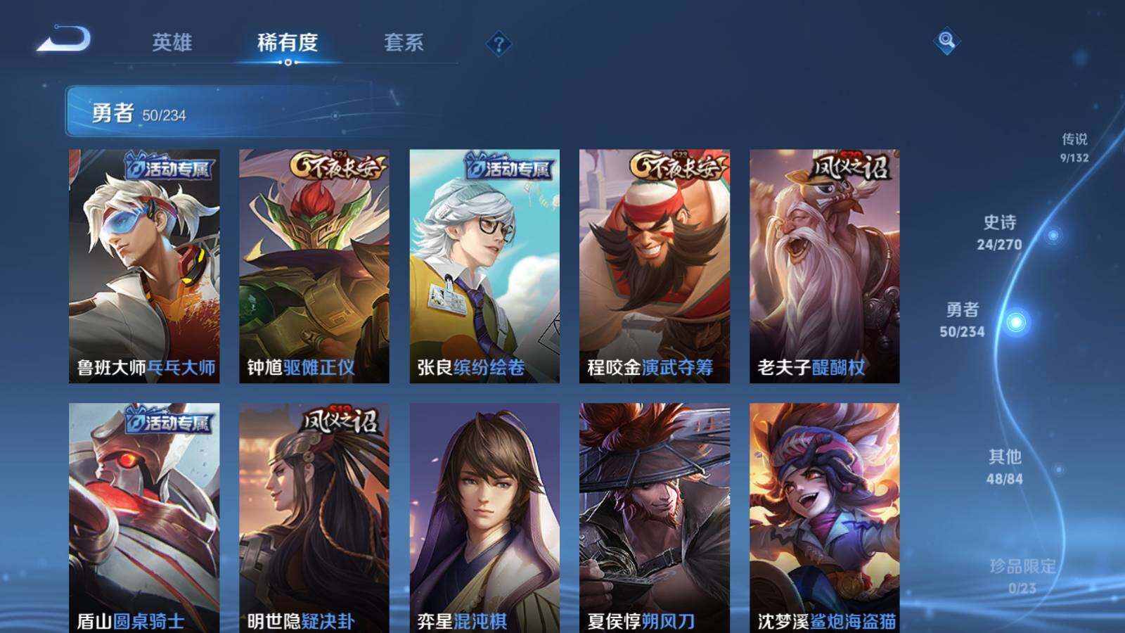 【限定皮肤】:狄仁杰阴阳师,赵云皇家上将,嬴政白昼王子,鲁班七号狮舞东方,吕布猎兽之王,夏侯惇朔风刀,典韦穷奇,典韦蓝屏警告,狄仁杰魔术师,项羽海滩派对,老夫子醍醐杖,程咬金演武夺筹,露娜一生所爱,孙悟空大圣娶亲,牛魔御旌,虞姬启明星使,钟馗神迹守卫,钟馗驱傩正仪,女娲朔望之晖,太乙真人华丽摇滚,弈星混沌棋,明世隐疑决卦,裴擒虎天狼狩猎者,狂铁御狮,米莱狄御霄,盾山御銮