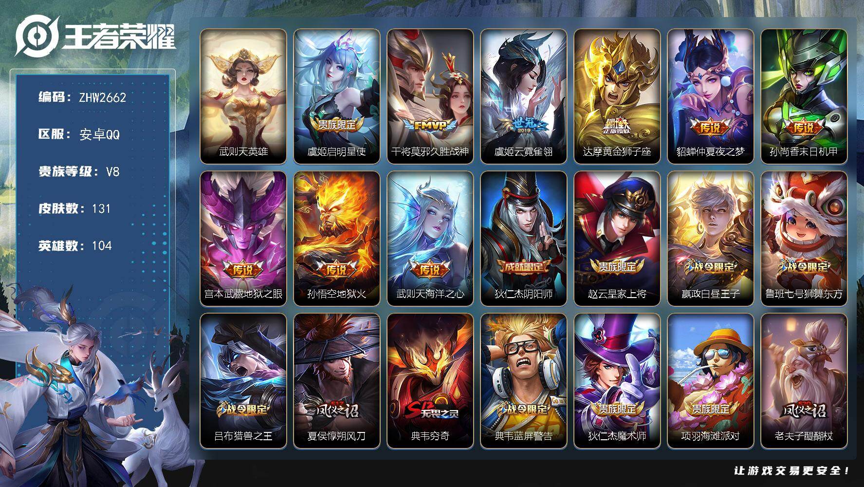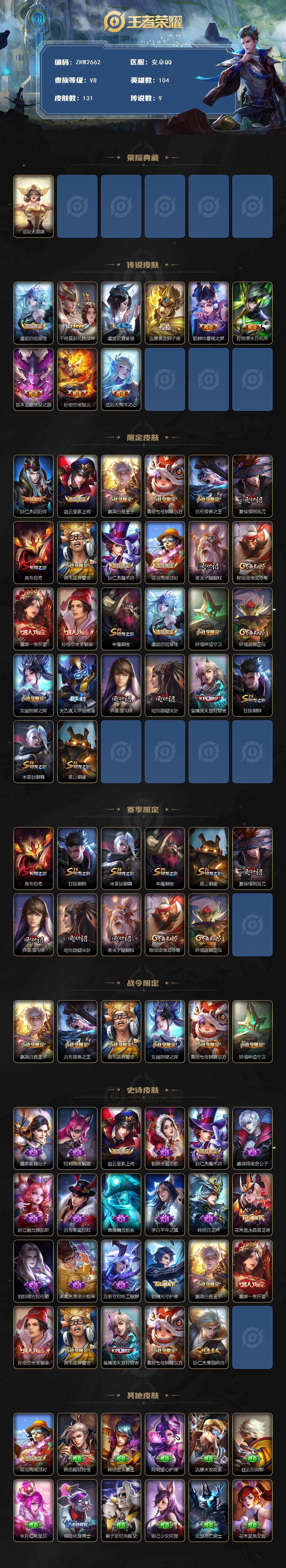 [16649312]安卓Q-V8-荣耀黄金IV段位-104英雄-131皮肤-1典藏英雄-9传说-23史诗 【荣耀典藏】:武则天英雄 【传说皮肤】:虞姬启明星使,干将莫邪久胜战神,虞姬云霓雀翎,达摩黄金狮子座,貂蝉仲夏夜之梦,孙尚香末日机甲,宫本武藏地狱之眼,孙悟空地狱火,武则天海洋之心 【限定皮肤】:狄仁杰阴阳师,赵云皇家上将,嬴政白昼王子,鲁班七号狮舞东方,吕布猎兽之王,夏侯惇朔风刀,典韦穷奇,典韦蓝屏警告,狄仁杰魔术师,项羽海滩派对,老夫子醍醐杖,程咬金演武夺筹,露娜一生所爱,孙悟空大圣娶亲,牛魔御旌,虞姬启明星使,钟馗神迹守卫,钟馗驱傩正仪,女娲朔望之晖,太乙真人华丽摇滚,弈星混沌棋,明世隐疑决卦,裴擒虎天狼狩猎者,狂铁御狮,米莱狄御霄,盾山御銮 【赛季限定】:典韦穷奇,狂铁御狮,米莱狄御霄,牛魔御旌,盾山御銮,夏侯惇朔风刀,弈星混沌棋,明世隐疑决卦,老夫子醍醐杖,程咬金演武夺筹,钟馗驱傩正仪 【战令限定】:嬴政白昼王子,吕布猎兽之王,典韦蓝屏警告,女娲朔望之晖,鲁班七号狮舞东方,钟馗神迹守卫 【史诗皮肤】:露娜紫霞仙子,阿轲暗夜猫娘,赵云皇家上将,貂蝉圣诞恋歌,狄仁杰魔术师,嬴政暗夜贵公子,妲己魅力维加斯,吕布圣诞狂欢,曹操幽灵船长,李白千年之狐,韩信白龙吟,花木兰水晶猎龙者,刘邦德古拉伯爵,诸葛亮黄金分割率,百里守约特工魅影,铠曙光守护者,嬴政白昼王子,露娜一生所爱,孙悟空大圣娶亲,典韦蓝屏警告,裴擒虎天狼狩猎者,鲁班七号狮舞东方,狄仁杰鹰眼统帅 【其他皮肤】:项羽海滩派对,韩信教廷特使,韩信街头霸王,阿轲爱心护理,达摩大发明家,赵云忍炎影,芈月红桃皇后,扁鹊化身博士,姜子牙时尚教父,妲己少女阿狸,亚瑟死亡骑士,花木兰兔女郎,张飞五福同心,甄姬花好人间,刘备万事如意,宫本武藏万象初新,后羿阿尔法小队,狄仁杰阴阳师,刘备汉昭烈帝,关羽龙腾万里,宫本武藏霸王丸,孙尚香沉稳之力,典韦穷奇,李白敏锐之力,鬼谷子幻乐之宴,狂铁御狮,太乙真人华丽摇滚,大乔守护之力,项羽科学大爆炸,米莱狄御霄,吕布猎兽之王,张良幽兰居士,庄周奇妙博物学,牛魔御旌,女娲朔望之晖,小乔丁香结,吕布野性能量,钟馗神迹守卫,盾山御銮,孙膑归虚梦演,沈梦溪鲨炮海盗猫,夏侯惇朔风刀,弈星混沌棋,明世隐疑决卦,盾山圆桌骑士,老夫子醍醐杖,程咬金演武夺筹,张良缤纷绘卷,钟馗驱傩正仪,鲁班大师乓乓大师,雅典娜神奇女侠,鲁