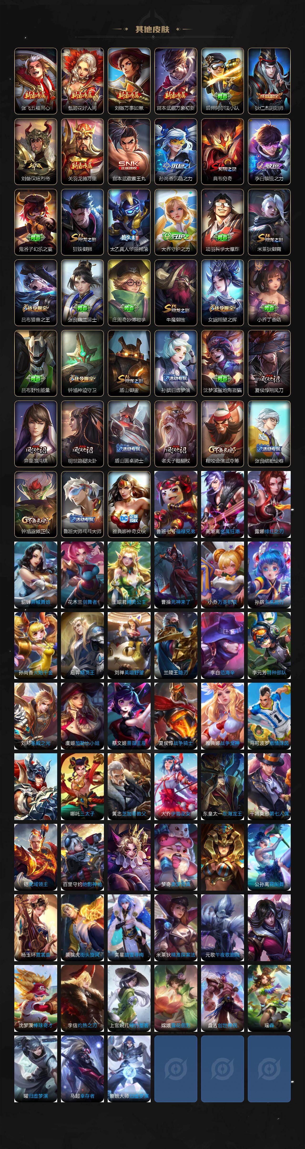 【其他皮肤】:项羽海滩派对,韩信教廷特使,韩信街头霸王,阿轲爱心护理,达摩大发明家,赵云忍炎影,芈月红桃皇后,扁鹊化身博士,姜子牙时尚教父,妲己少女阿狸,亚瑟死亡骑士,花木兰兔女郎,张飞五福同心,甄姬花好人间,刘备万事如意,宫本武藏万象初新,后羿阿尔法小队,狄仁杰阴阳师,刘备汉昭烈帝,关羽龙腾万里,宫本武藏霸王丸,孙尚香沉稳之力,典韦穷奇,李白敏锐之力,鬼谷子幻乐之宴,狂铁御狮,太乙真人华丽摇滚,大乔守护之力,项羽科学大爆炸,米莱狄御霄,吕布猎兽之王,张良幽兰居士,庄周奇妙博物学,牛魔御旌,女娲朔望之晖,小乔丁香结,吕布野性能量,钟馗神迹守卫,盾山御銮,孙膑归虚梦演,沈梦溪鲨炮海盗猫,夏侯惇朔风刀,弈星混沌棋,明世隐疑决卦,盾山圆桌骑士,老夫子醍醐杖,程咬金演武夺筹,张良缤纷绘卷,钟馗驱傩正仪,鲁班大师乓乓大师,雅典娜神奇女侠,鲁