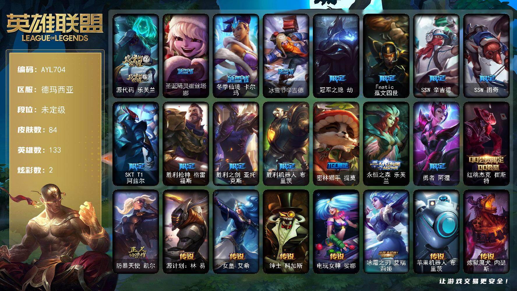[16653504]【特价出售/店主推荐】 未定级段位-133英雄-84皮肤-2炫彩-0终极-1神话-16限定-12传说-28史诗 【神话皮肤】:源代码乐芙兰 【冰雪限定】:圣诞精灵崔丝塔娜,冬季仙境卡尔玛,冰雪节辛吉德 【限定皮肤】:冠军之隐劫,Fnatic嘉文四世,SSW辛吉德,SSW图奇,SKTT1阿兹尔,胜利枪神格雷福斯,胜利之剑亚托克斯,胜利机器人布里茨,密林猎手提莫,永恒之森乐芙兰,勇者阿狸,红桃杰克崔斯特,防暴天使凯尔 【传说皮肤】:源计划林易,女皇艾希,绅士科加斯,电玩女神娑娜,冰霜之刃艾瑞莉娅,苹果机器人布里茨,炼狱魔犬内瑟斯,枯萎之壤泽拉斯,黯黑魔龙希瓦娜,金牌主播德莱文,霸天异形卡兹克,黑夜使者亚索 【史诗皮肤】:科学怪熊的新娘安妮,重生之沙费德提克,天人合一易,兔宝宝提莫,炼金狂士辛吉德,熔火之心拉莫斯,飞越疯人院萨科,夜行义贼艾瑞莉娅,血石诅咒塔里克,穿着正装的恶魔维迦,抵抗军天使凯特琳,死亡绽放伊莉丝,地下拳王李青,铁血猎手奈德丽,四神之力乌迪尔,飞车暴走族古拉加斯,银色之牙阿卡丽,奥术光辉拉克丝,暗影妖狐阿狸,虚空海灵菲兹,白色死神韦鲁斯,源代码丽桑卓,腥红之月亚索,银河魔装机神千珏,职业杀手卢锡安,源计划阴劫,时之砂艾克,霸天剑魔亚托克斯 【王者皮肤】:五杀摇滚鼓手奥拉夫,星空之门内瑟斯 【勇士皮肤】:创意工坊黑默丁格 【其他皮肤1】:小红帽安妮,风执事加里奥,弗拉基米尔伯爵,游击队员崔丝塔娜,西部牛仔厄运小姐,假面女皇伊芙琳,情绪摇滚阿木木,铬金铠甲拉莫斯,千纸凤凰艾尼维亚,战栗之毒蒙多,幽灵船长普朗克,樱花乱舞卡尔玛,冰壶选手维迦,法国女仆奈德丽,奈落之炎阿卡丽,银色闪电凯南,刺客信条泰隆,未来战士锐雯,主治医师慎,游侠法师拉克丝,兔宝宝菲兹,光明骑士诺提勒斯,死亡骑士瑟庄妮,幽魂骑士赫卡里姆